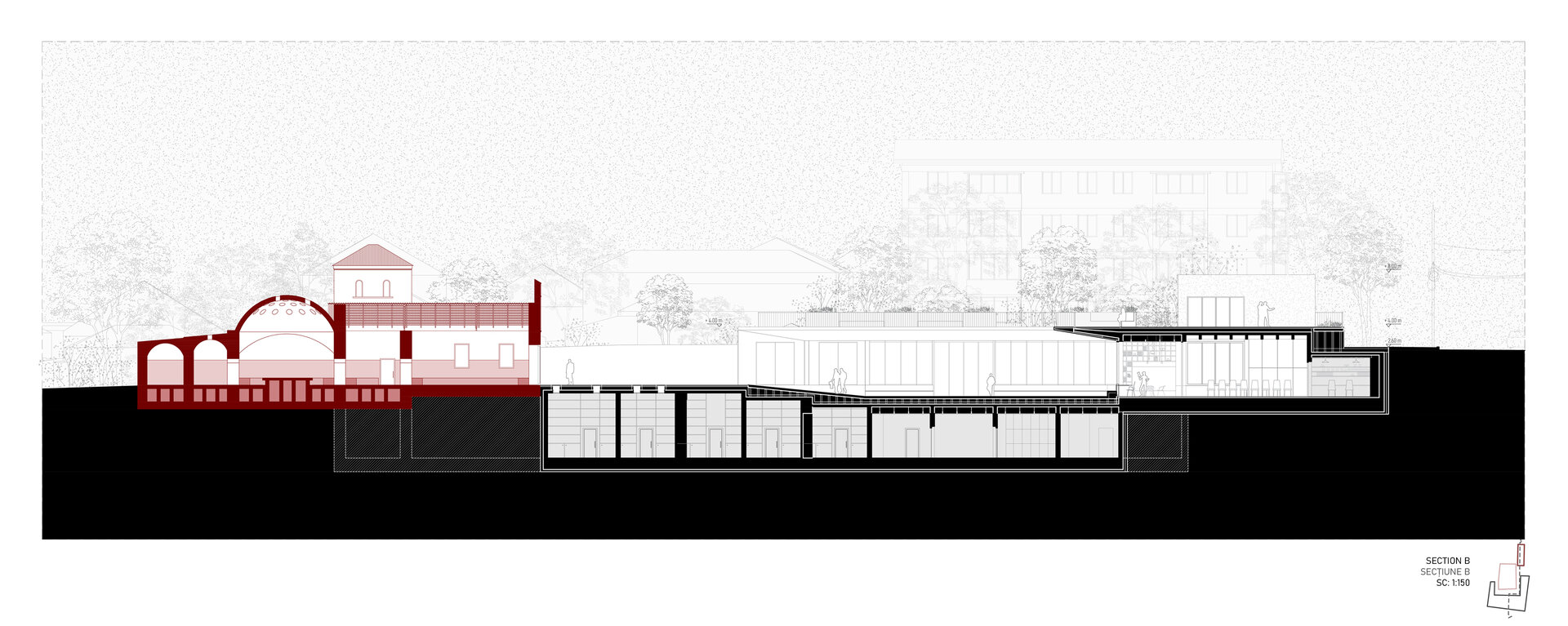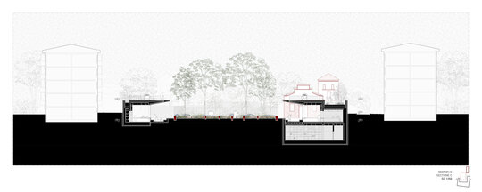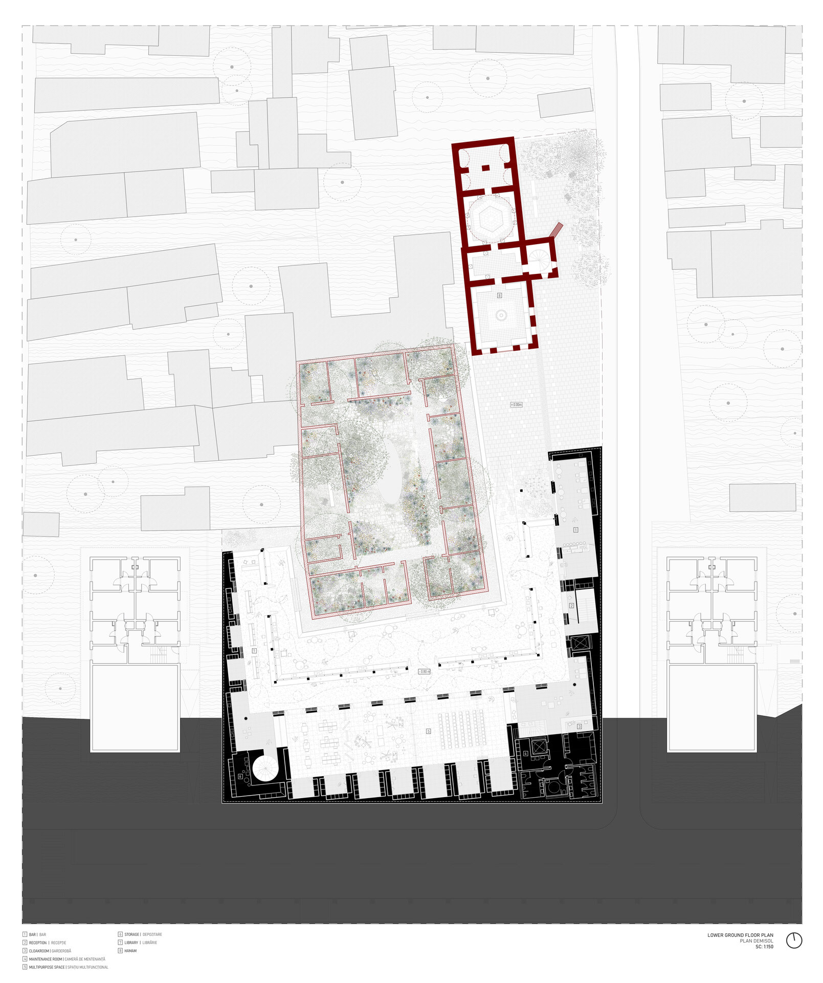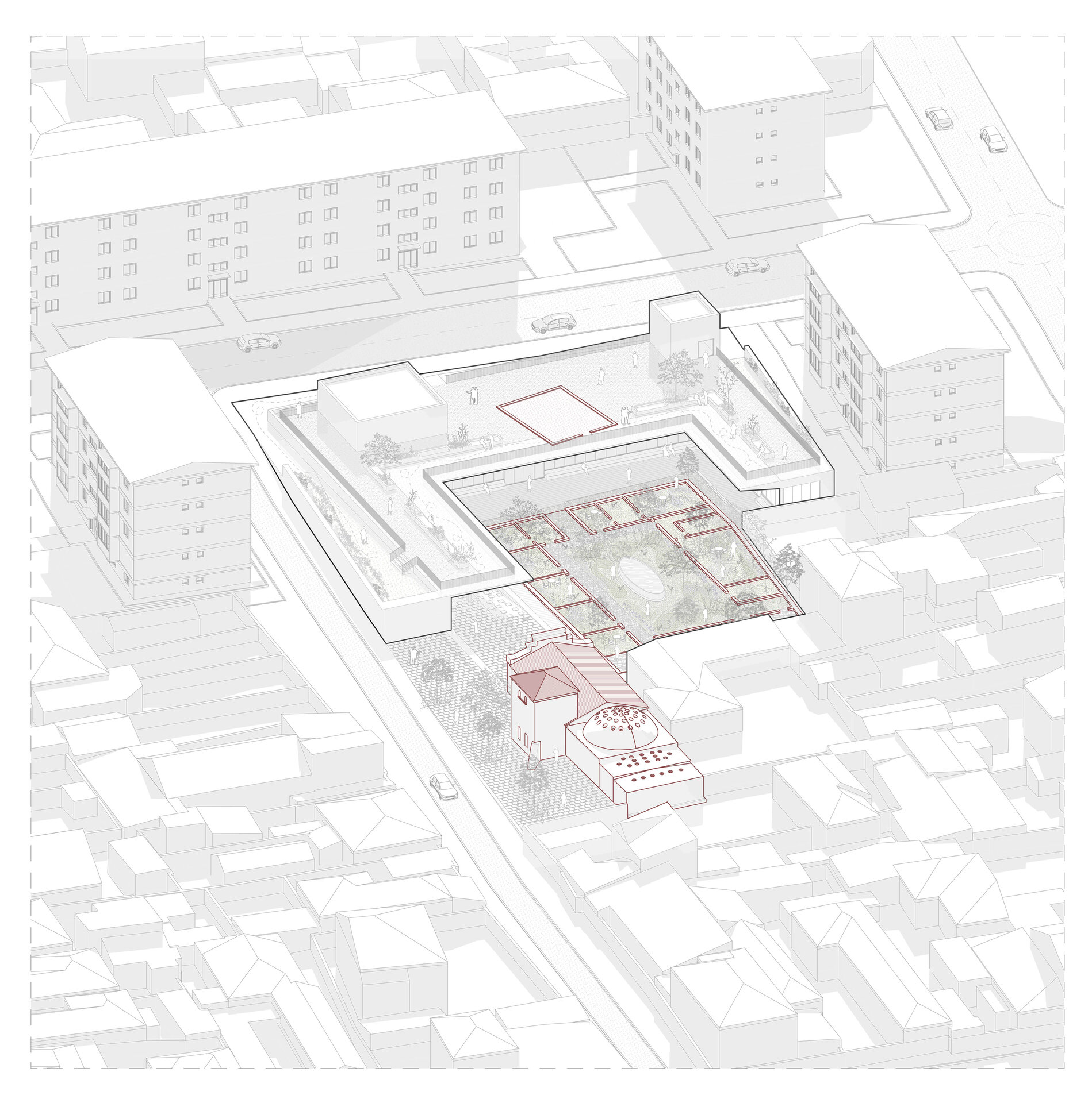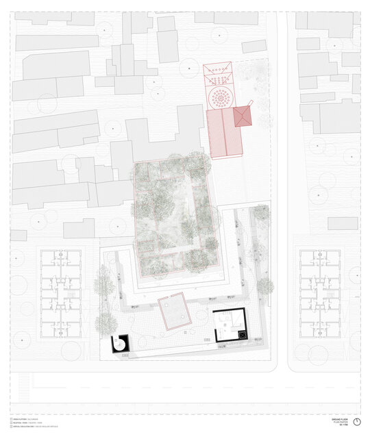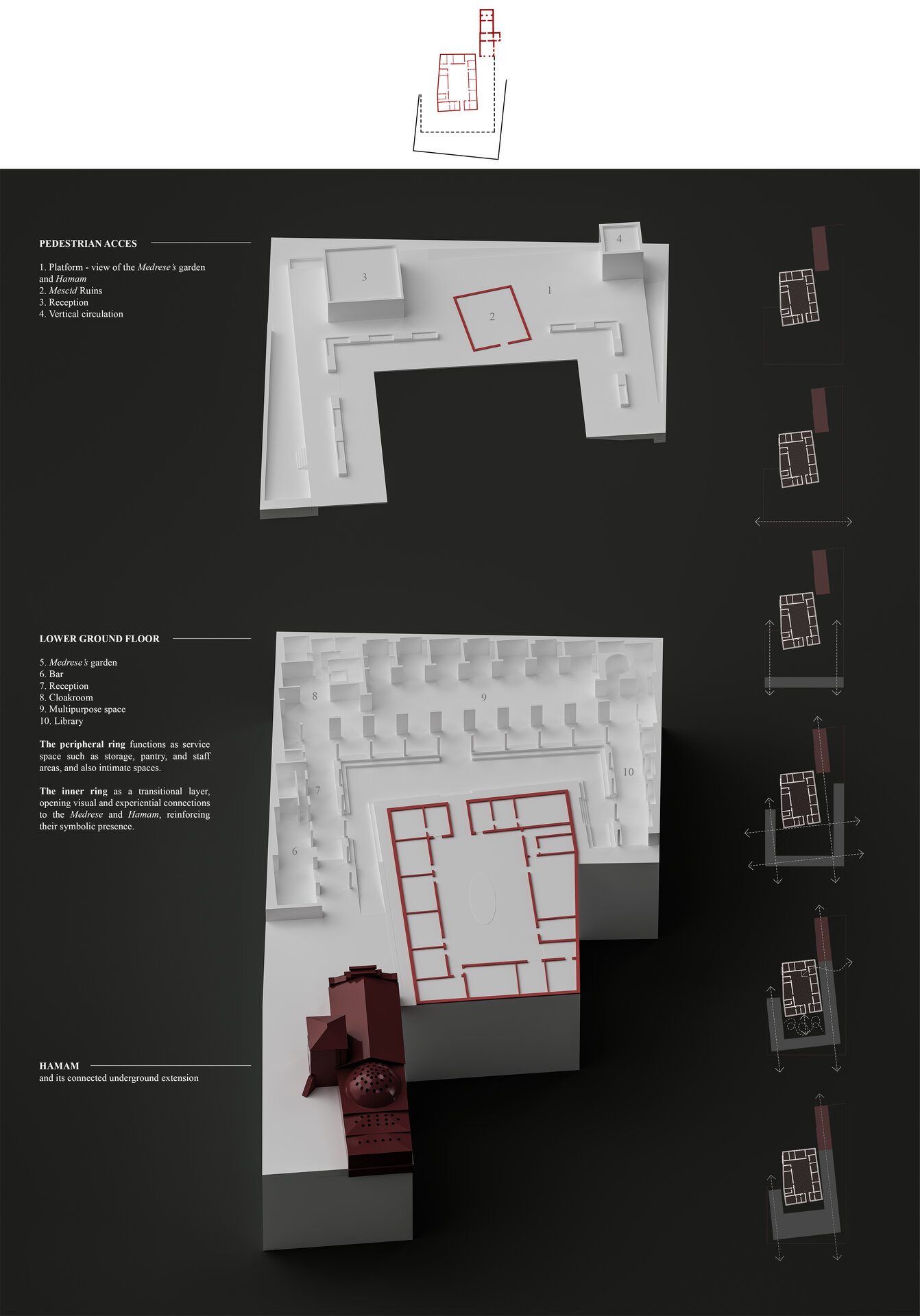 Locul se dezvăluie ca un palimpsest de memorie stratificată, fiecare palier al istoriei fiind lăsat să respire în noile forme. Proiectul valorifică variația topografică a sitului pentru a conecta străzile adiacente cu nivelul obiectelor istorice, transformând terenul într-un gest arhitectural deliberat. Inspirată de modul în care complexe de tip külliye integrau topografia naturală, intervenția propune o dală urbană, aflată la nivelul străzii funcționează ca o esplanadă superioară și curte de acces pentru ansamblu. Această platformă se aliniază cu fluxurile de circulație ale orașului și atrage pietonii dinspre stradă, devenind o nouă terasă urbană cu vedere asupra sitului. De aici, proiectul propune o tranziție fluidă către nivelul inferior al ansamblului istoric.