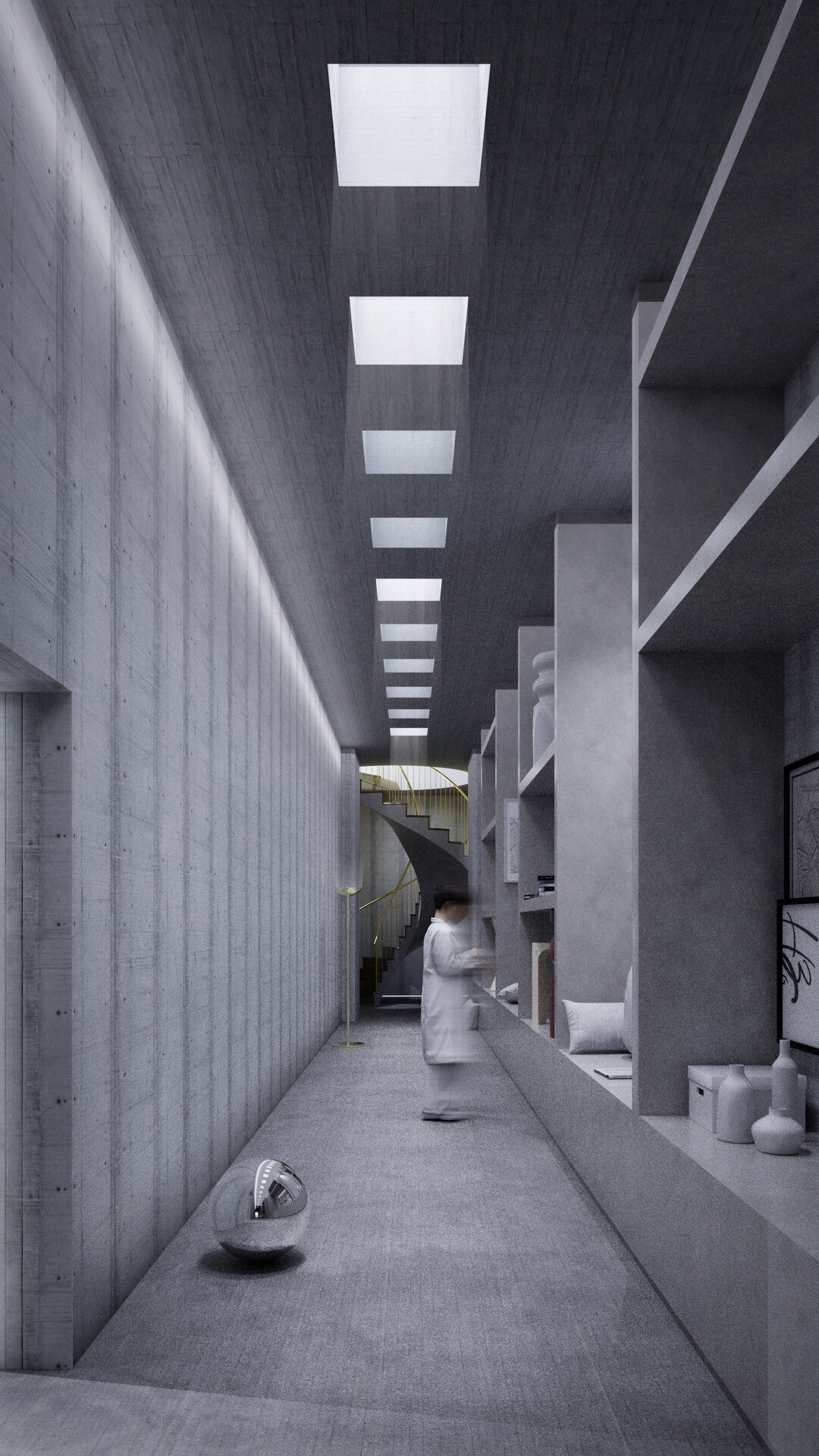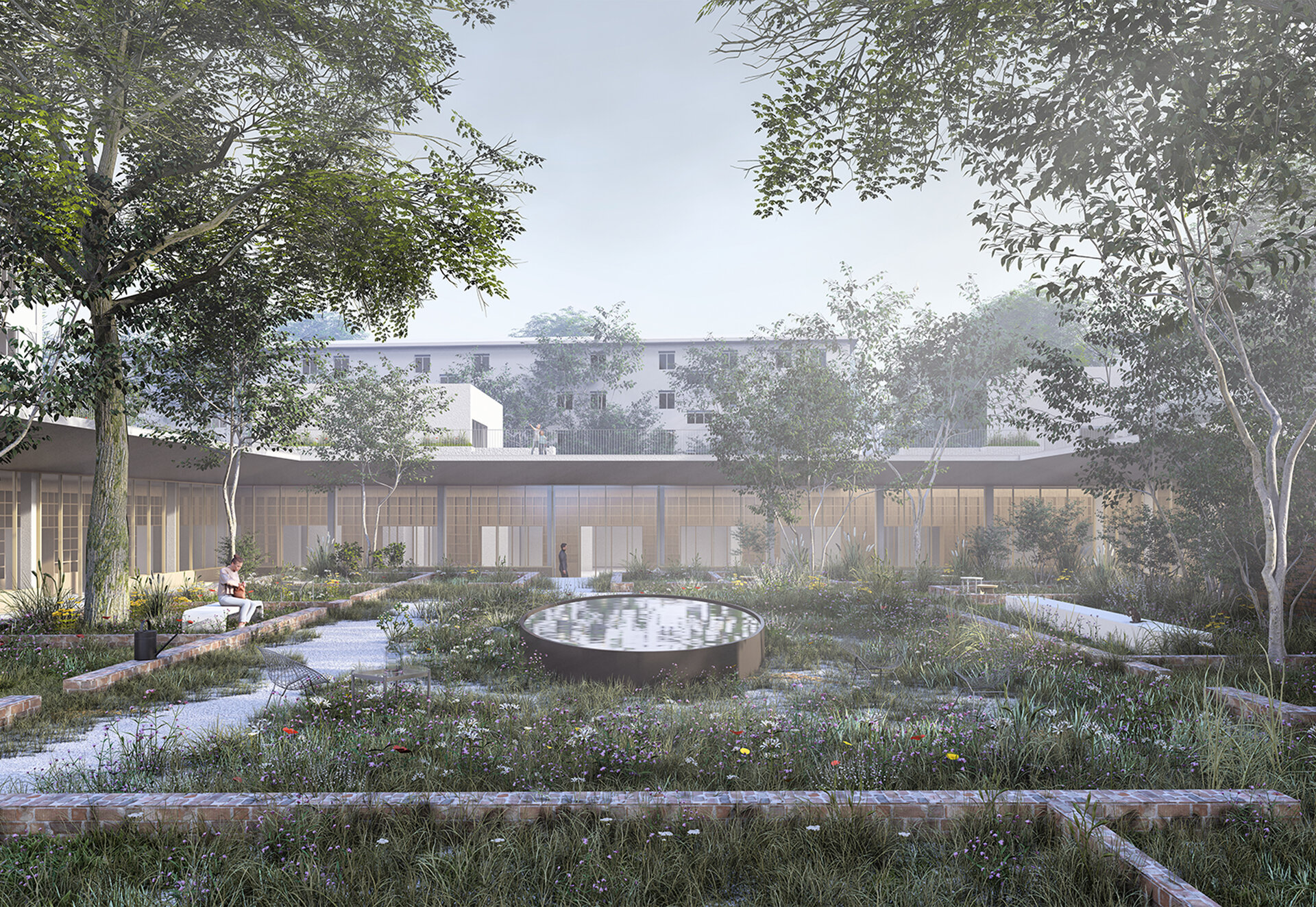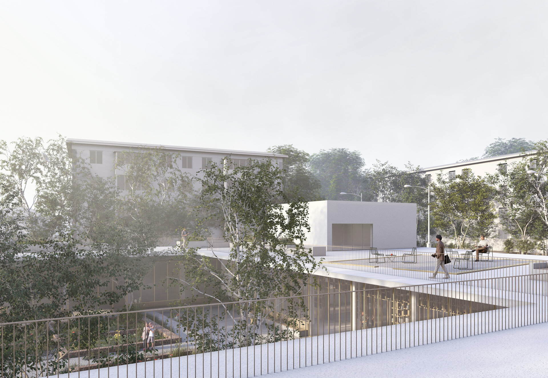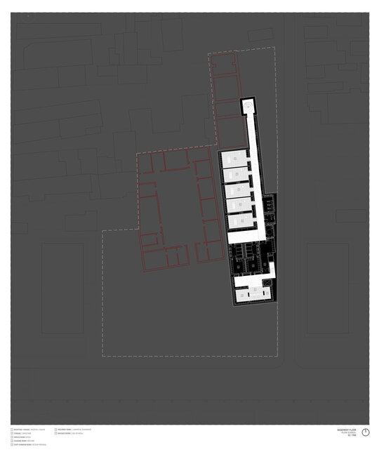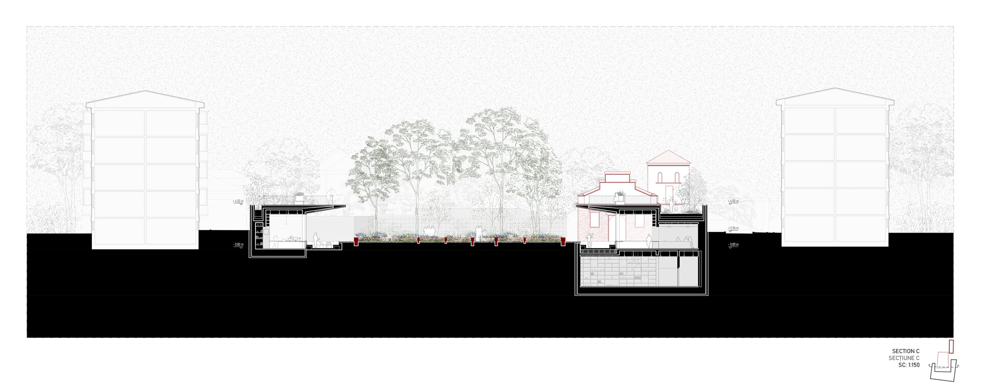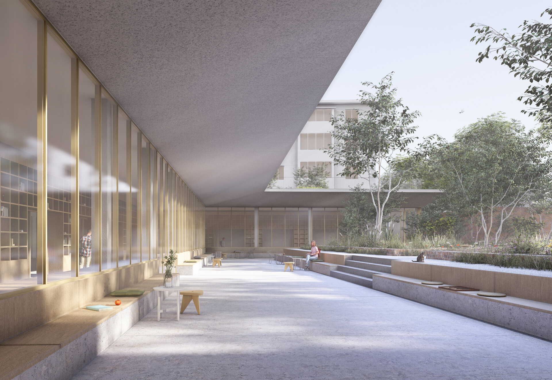 Locul se dezvăluie ca un palimpsest de memorie stratificată, fiecare palier al istoriei fiind lăsat să respire în noile forme. Proiectul valorifică variația topografică a sitului pentru a conecta străzile adiacente cu nivelul obiectelor istorice, transformând terenul într-un gest arhitectural deliberat. Inspirată de modul în care complexe de tip külliye integrau topografia naturală, intervenția propune o dală urbană, aflată la nivelul străzii funcționează ca o esplanadă superioară și curte de acces pentru ansamblu. Această platformă se aliniază cu fluxurile de circulație ale orașului și atrage pietonii dinspre stradă, devenind o nouă terasă urbană cu vedere asupra sitului. De aici, proiectul propune o tranziție fluidă către nivelul inferior al ansamblului istoric.