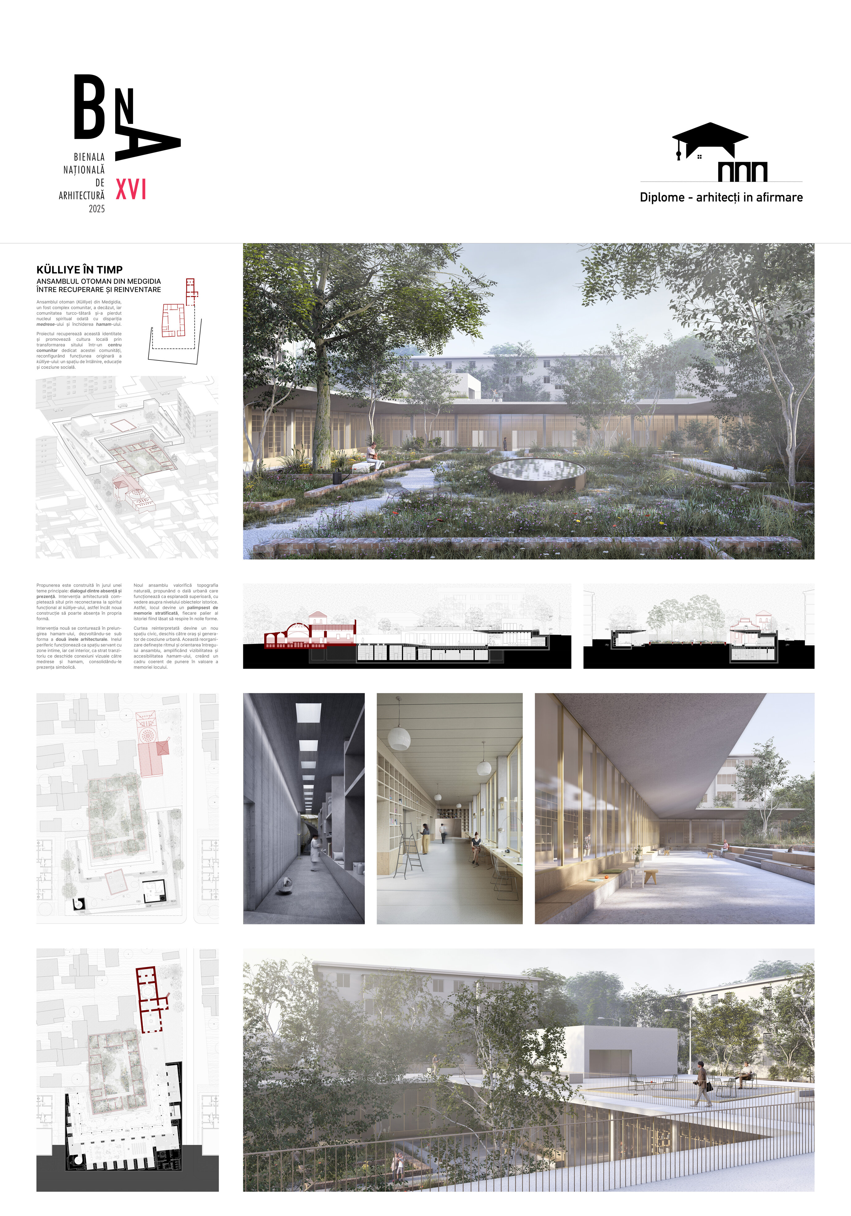 Külliye-ul este reactivat ca un model viu de coeziune, apartenență și reconectare comunitară. Intervenția nouă se conturează în prelungirea hamam-ului, dezvoltându-se sub forma a două inele arhitecturale. Inelul periferic funcționează ca spațiu servant, adăpostind totodată spații intime, iar inelul interior acționează ca strat tranzitoriu care deschide conexiuni vizuale și experiențiale către medrese și hamam, consolidându-le prezența simbolică. Astfel, obiectul istoric și intervenția nouă se împletesc într-un ansamblu coerent, regenerat, care păstrează vie memoria locului și redă comunității un spațiu al coeziunii urbane.