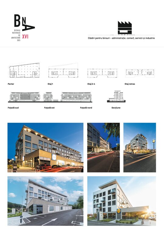 Volumetria este clară și riguroasă, cu două corpuri principale – unul de birouri, cu regim de înălțime S+P+4E+Er, și unul de comerț, cu regim S+P – articulate într-un ansamblu coerent. Cele două componente nu sunt doar juxtapuse, ci se completează reciproc: spațiile comerciale oferă vitalitate urbană și deschidere, în timp ce birourile exprimă stabilitate, perspectivă și verticalitate. Această dualitate este gândită pentru a susține o dinamică urbană complexă, care să îmbine fluxurile cotidiene ale orașului cu nevoile de concentrare și reprezentare ale mediului profesional.