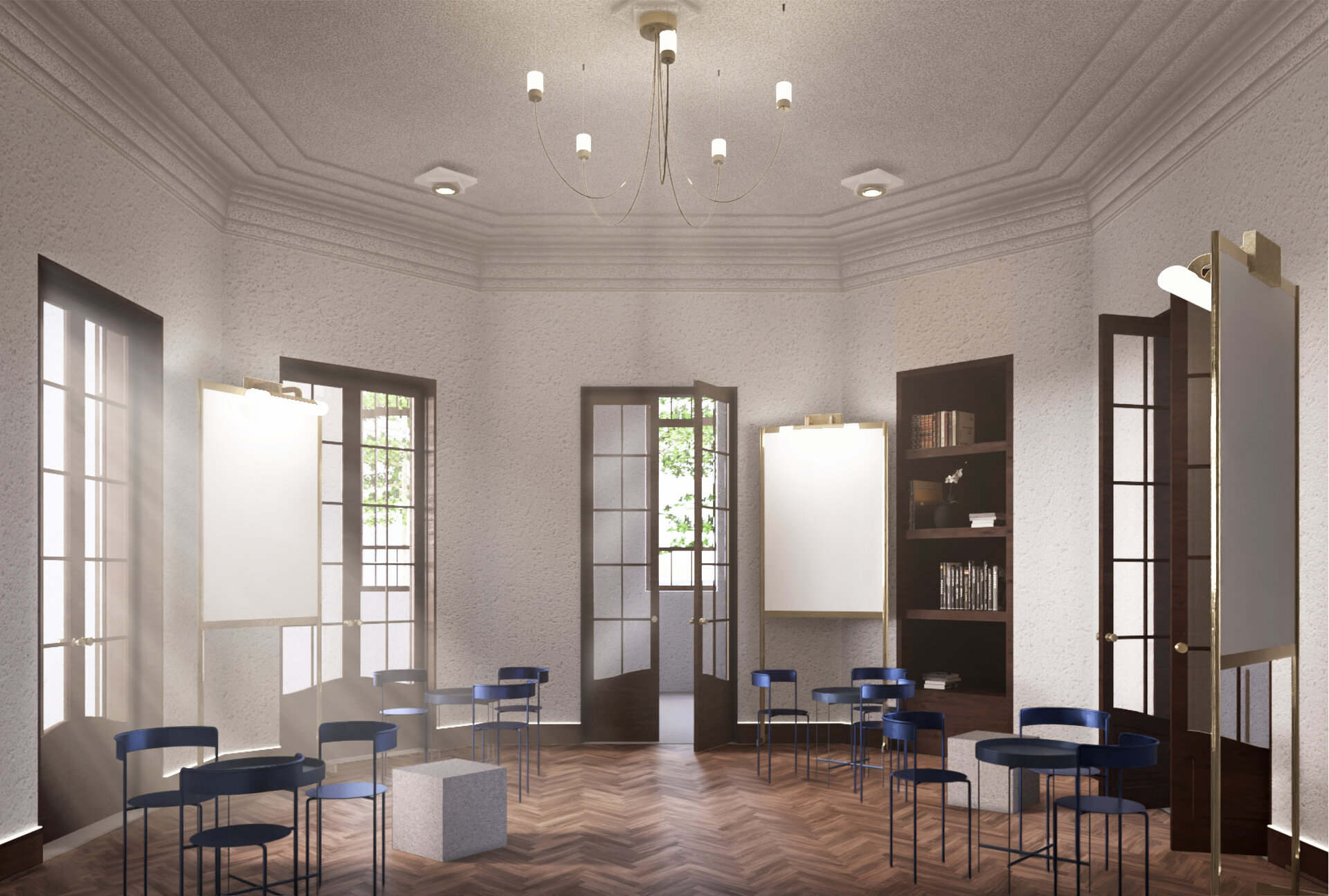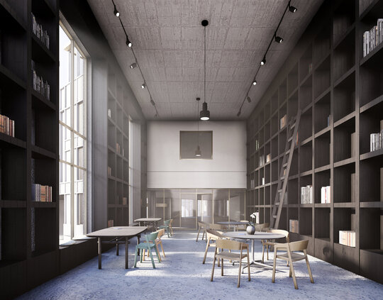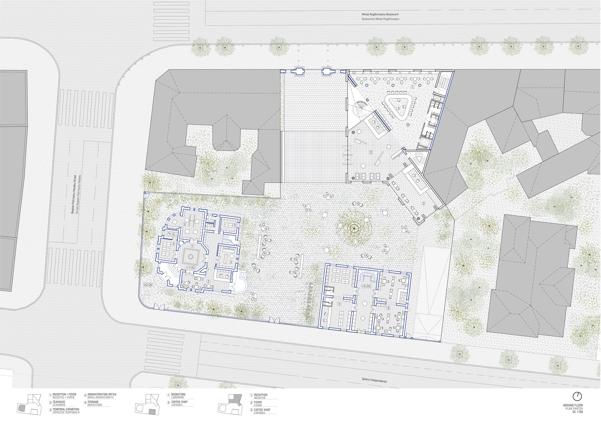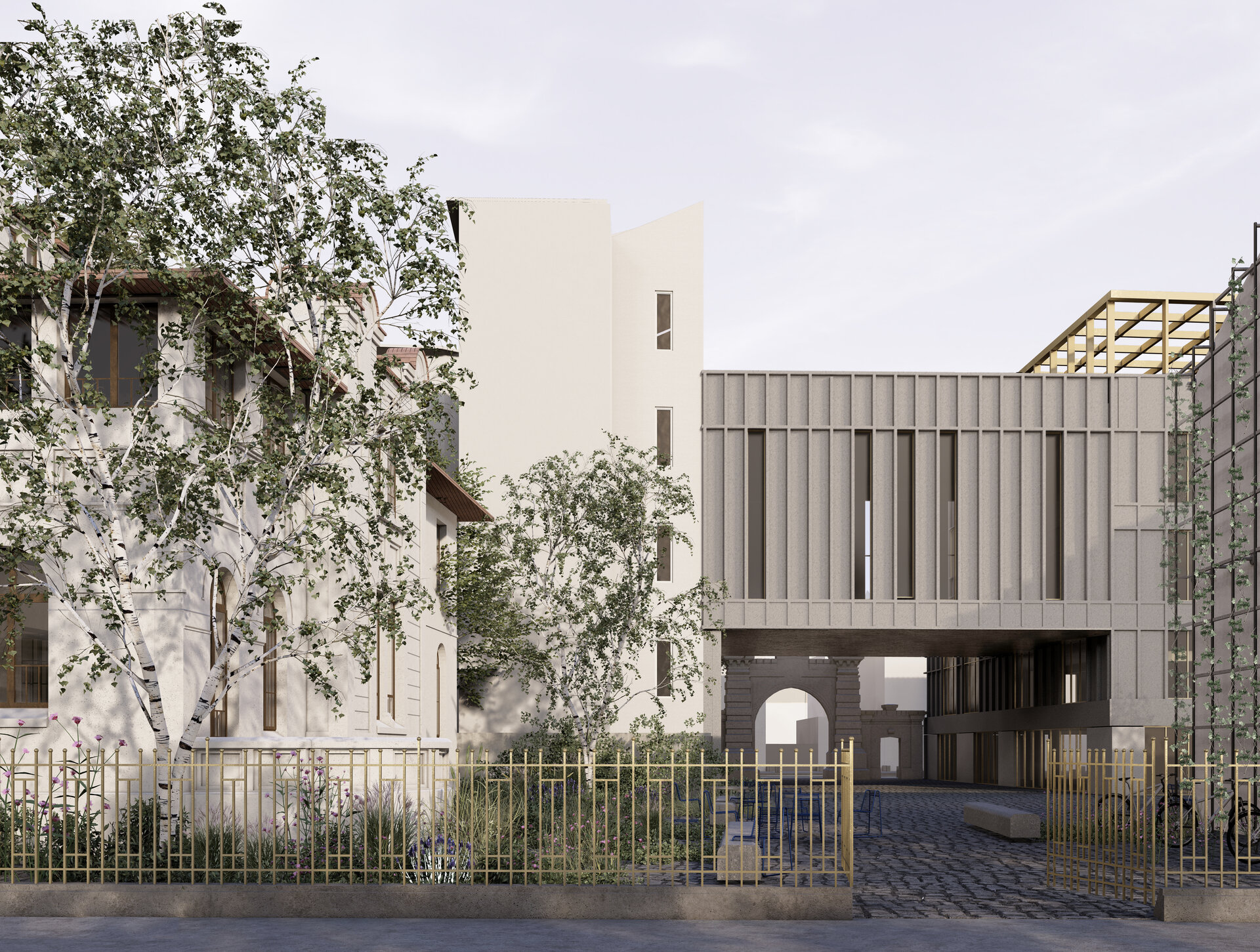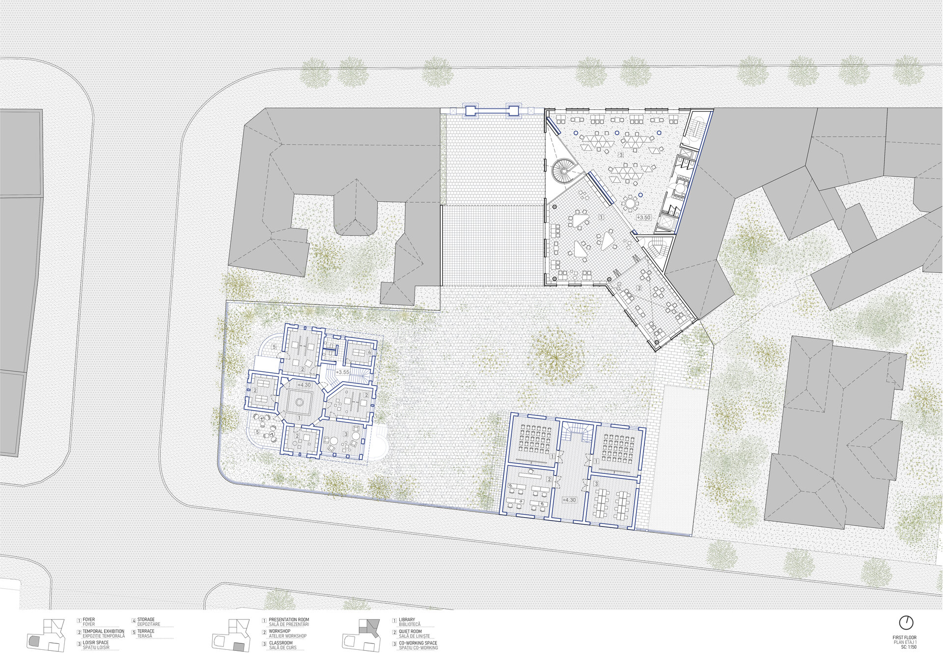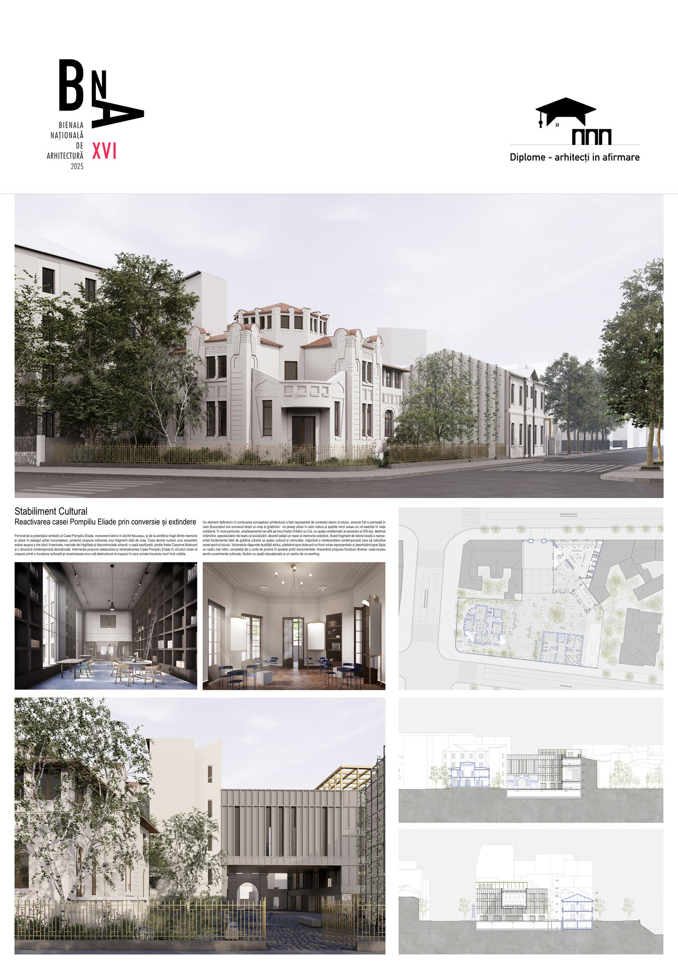 În locul unei simple restaurări neutre, proiectul propune o regândire funcțională și poetică a ansamblului: o casă-muzeu dedicată evenimentelor culturale temporare; o librărie cu spații educaționale pentru ateliere și dialog comunitar; și un centru de co-working contemporan, în care spațiile de lucru sunt articulate printr-o ierarhie fluidă și deschisă.