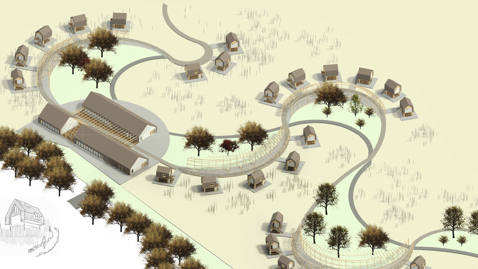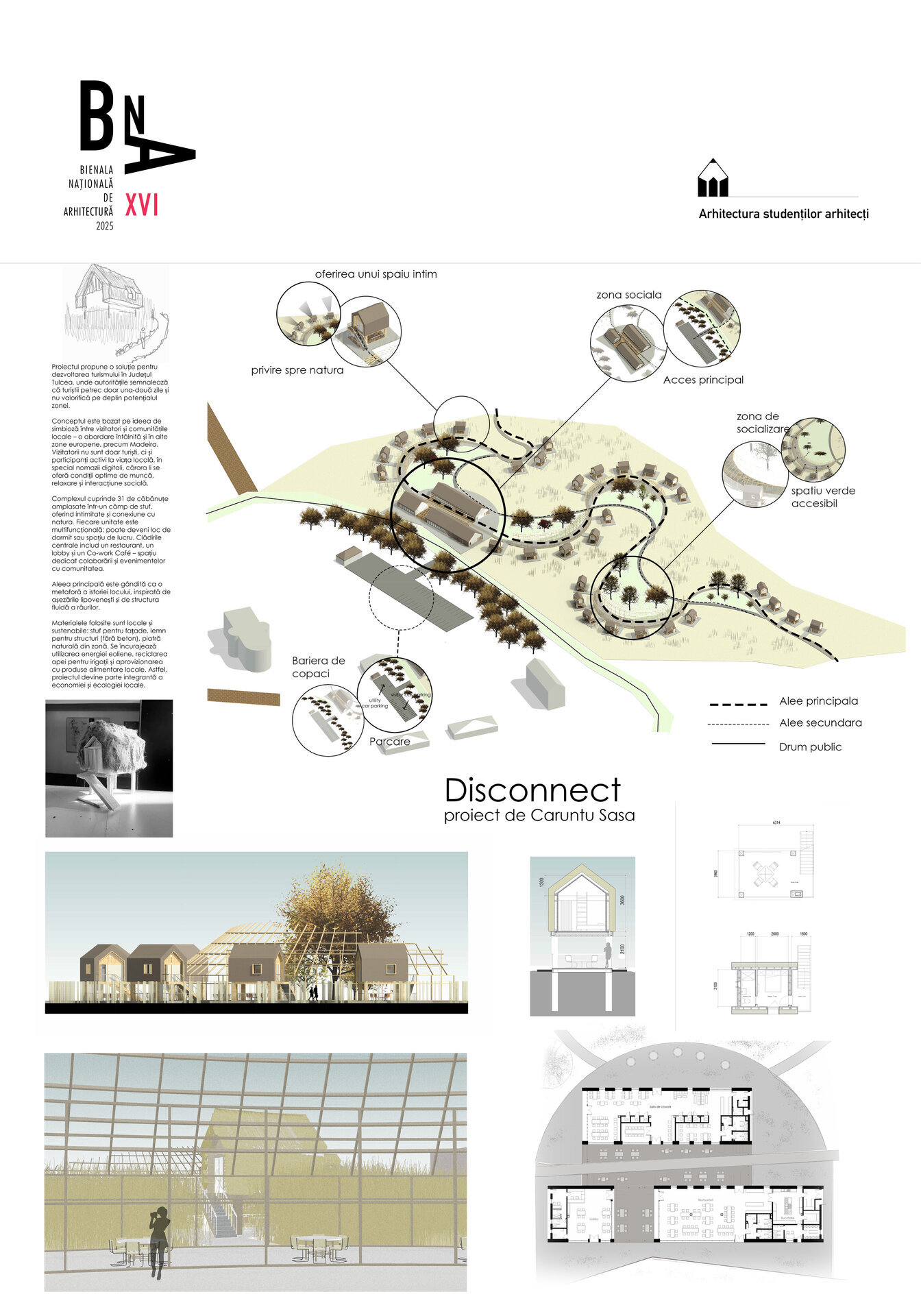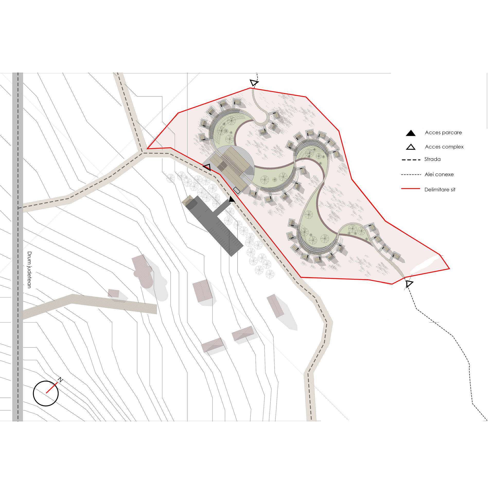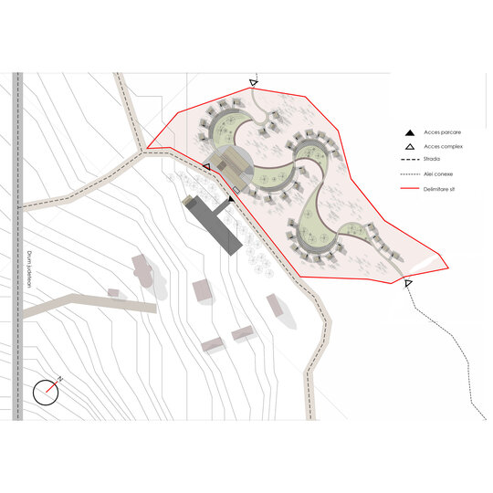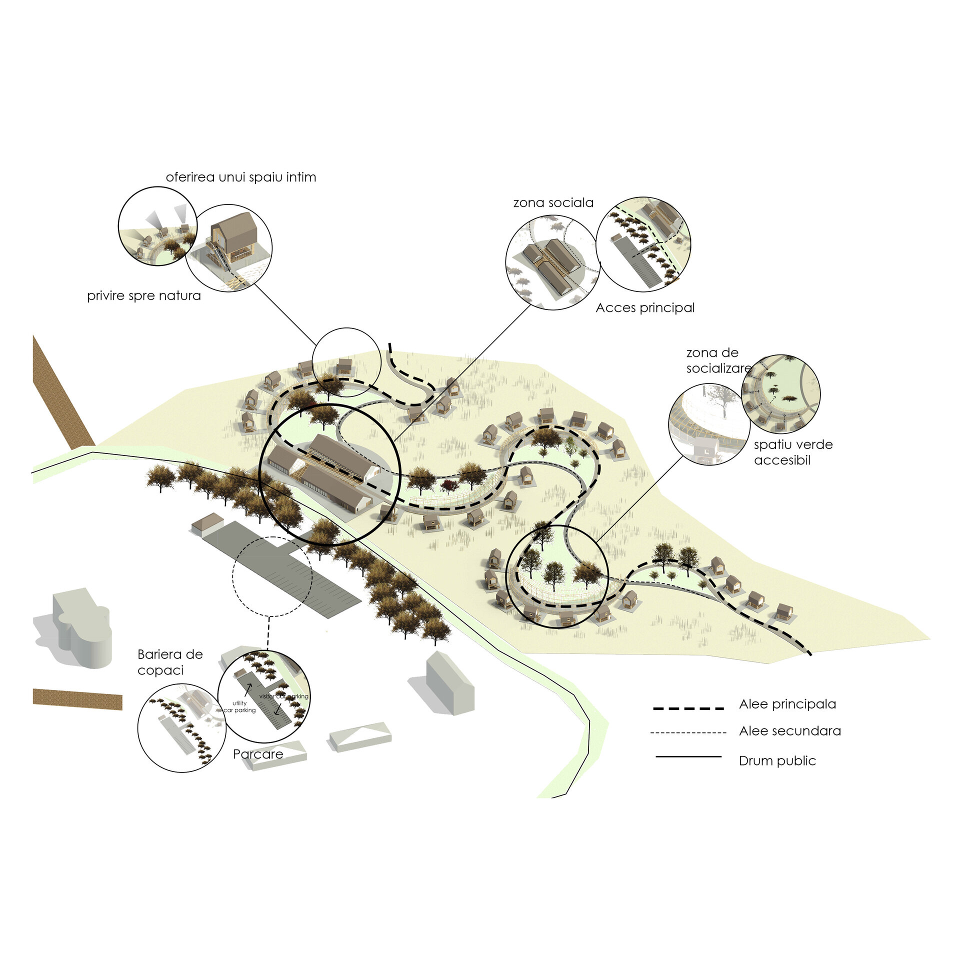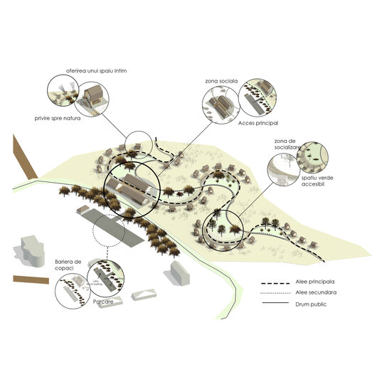 râurile (aleea principală), pe lângă care s-au așezat lipovenii (căbănuțele în stil lipovenesc) și râul care se curbează din ce în ce mai mult (zonele sociale de-a lungul aleii). Aceasta nu are doar un rol de a aminti istoria locului, ci și de a delimita intimitatea: clădirile din față – zona socială, spațiile sociale – zona mai retrasă, căbănuțele – zona personală.