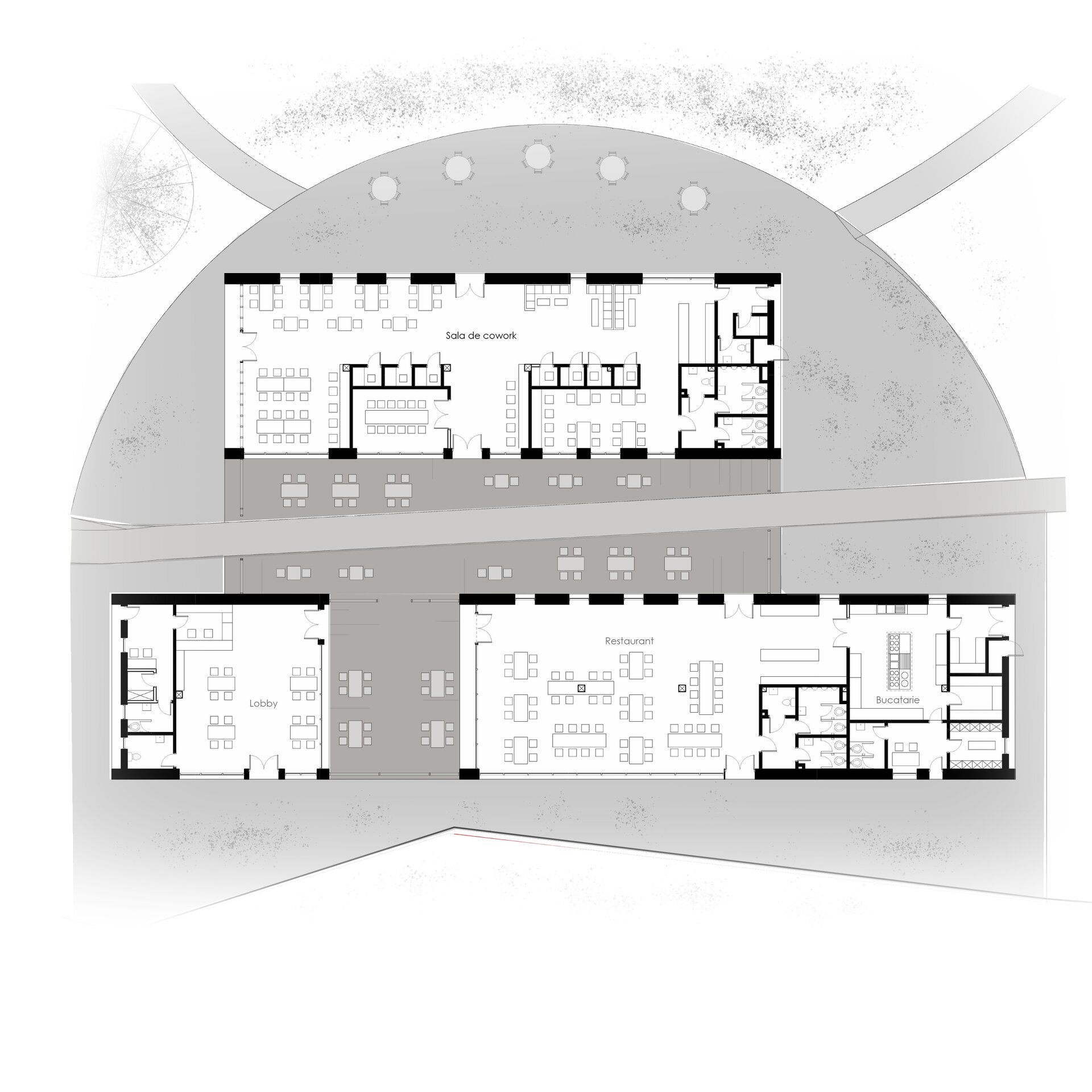 Pe de altă parte, clădirile care te întâmpină în complex au ca scop socializarea, networking-ul și un punct de lucru colectiv.