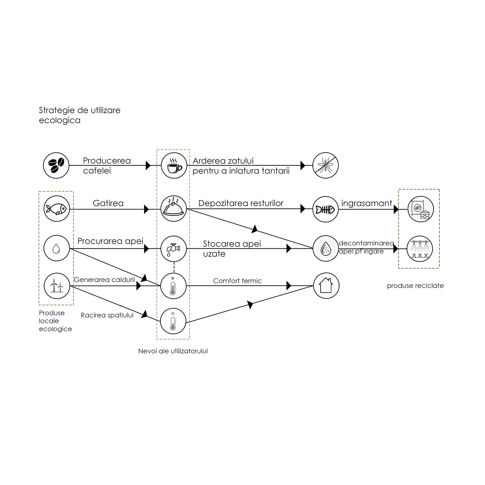 Abordarea utilizării este tot una ecologică: cât mai multe resurse să fie produse local și reciclate. Spre exemplu, energia poate fi procurată de la producătorii locali din zonă (mori eoliene), mâncarea specifică la fel, iar apa poate fi reciclată și folosită pentru irigare în zonă, deoarece locația se confruntă des cu secetă. Astfel, complexul produce venit pentru zonă sub forma unor bunuri destul de căutate și este implicat direct în economia locală.