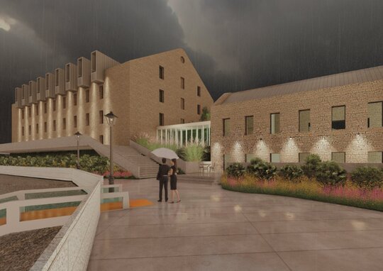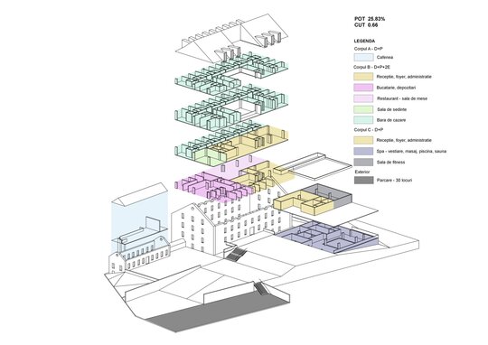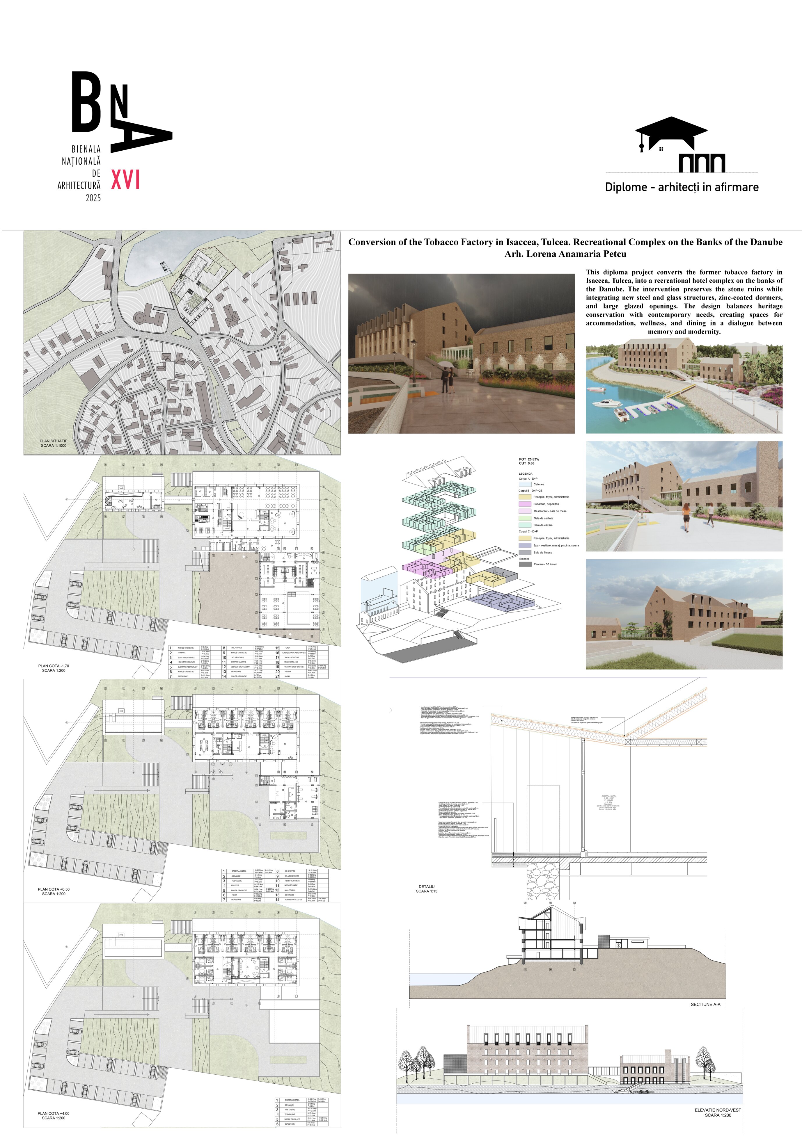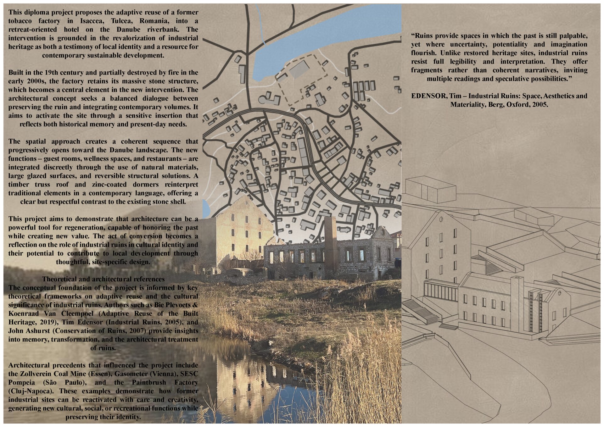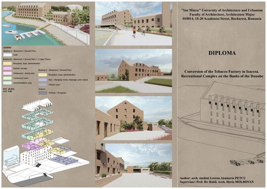 Proiectul de diplomă transformă fosta fabrică de tutun din Isaccea, Tulcea, într-un complex hotelier de recreere. Ruinele din piatră sunt păstrate și completate de volume noi din beton și sticlă, într-un dialog între memorie industrială și contemporaneitate.