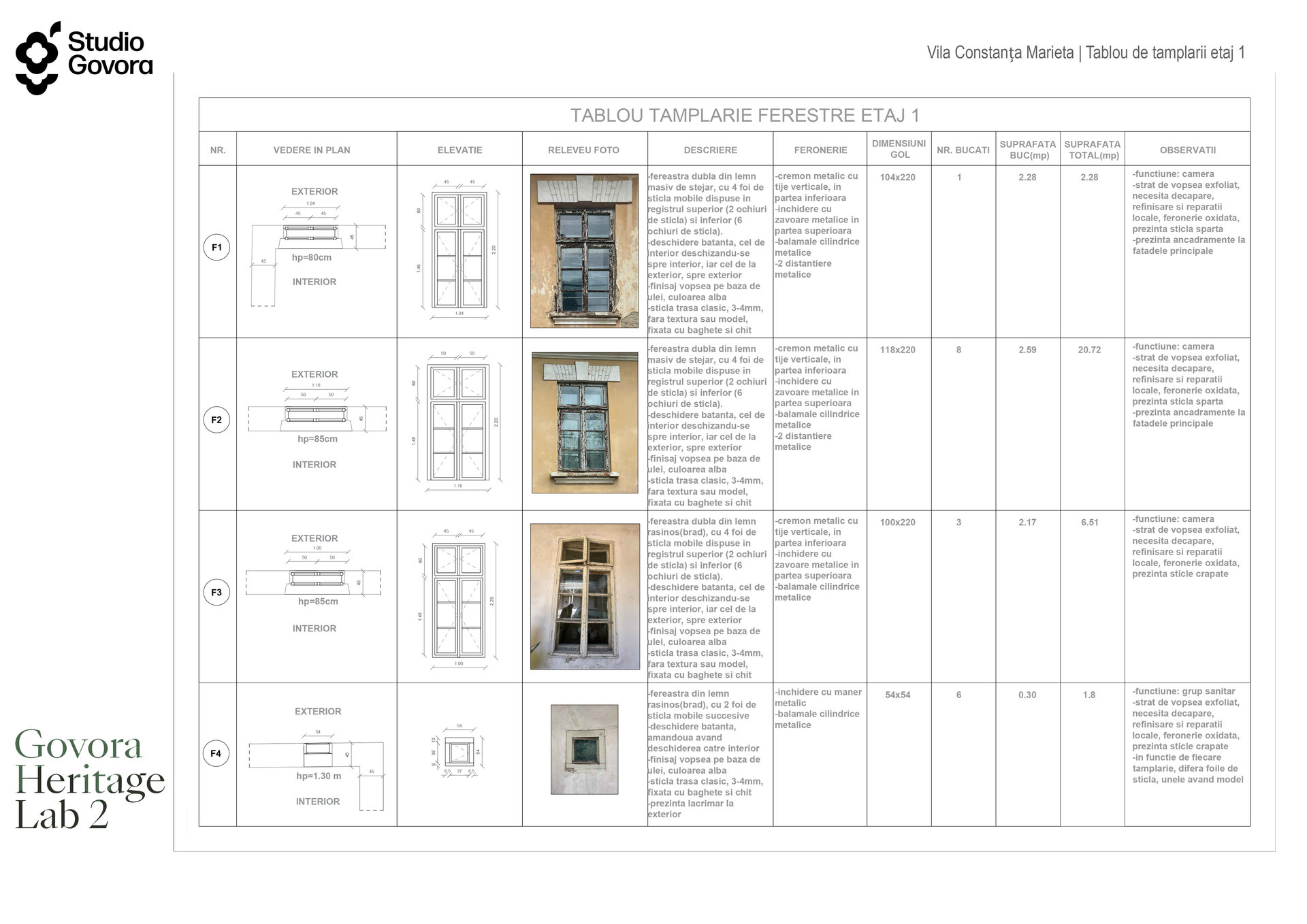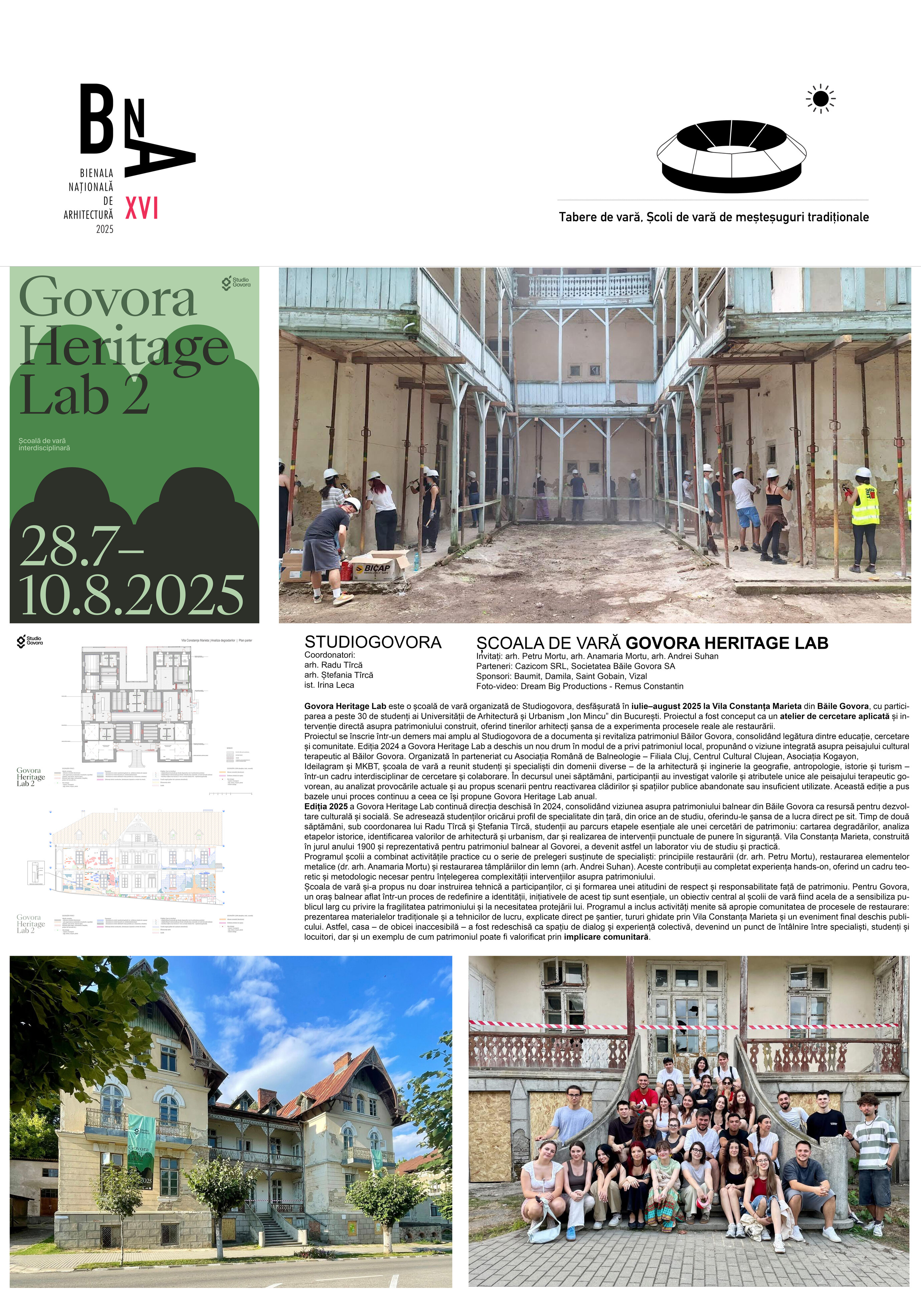 Ediția 2025 a Govora Heritage Lab continuă direcția deschisă în 2024, consolidând viziunea asupra patrimoniului balnear din Băile Govora ca resursă pentru dezvoltare culturală și socială. Se adresează studenților oricărui profil de specialitate din țară, din orice an de studiu, oferindu-le șansa de a lucra direct pe sit. Timp de două săptămâni, sub coordonarea lui Radu Tîrcă și Ștefania Tîrcă, studenții au parcurs etapele esențiale ale unei cercetări de patrimoniu: cartarea degradărilor, analiza etapelor istorice, identificarea valorilor de arhitectură și urbanism, dar și realizarea de intervenții punctuale de punere în siguranță. Vila Constanța Marieta, construită în jurul anului 1900 și reprezentativă pentru patrimoniul balnear al Govorei, a devenit astfel un laborator viu de studiu și practică.