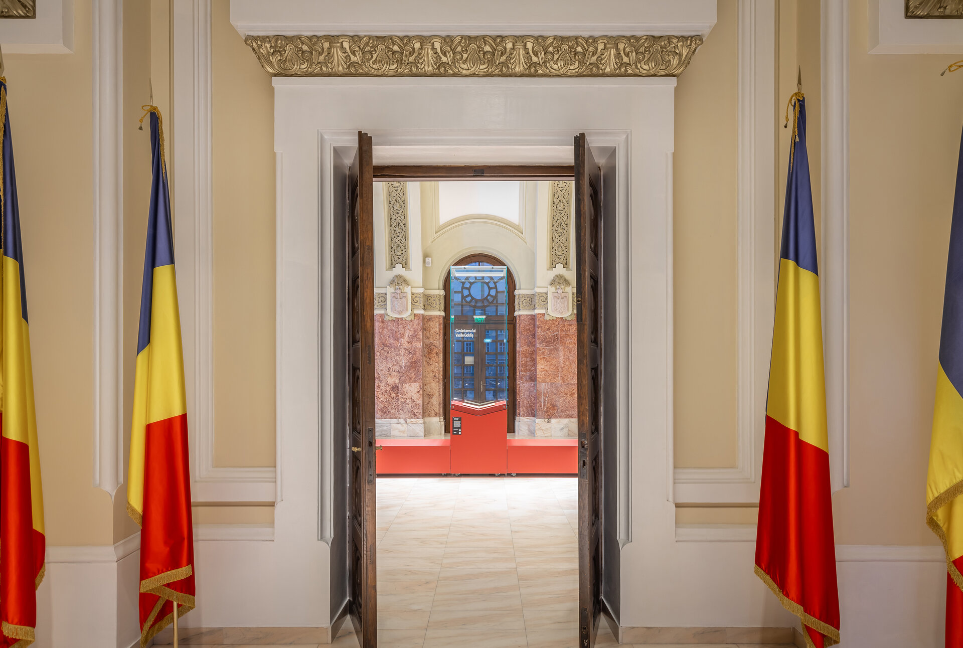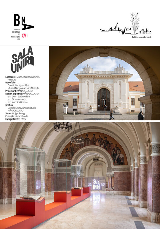 Sala Unirii, plină de vuiet, este fundalul pe care cuvântarea lui Vasile Goldiș, la intervale fixe de timp, te întoarce în trecut, te emoționează, te face să simți evenimentul care a stat la baza formării statului român. Grandoarea și caracterul regal al sălii sunt accentuate de mobilierul de culoare cărămizie, în nuanța pietrei, care adăpostește Cuvântarea lui Vasile Goldiș, Cartea de aur a Serbărilor Unirii și Cartea Centenar. Elementele amovibile propuse permit desfășurarea unor multiple evenimente, semn că sala nu și-a pierdut caracterul grandios de adunare a oamenilor.