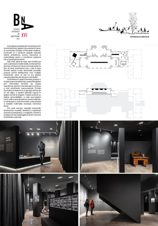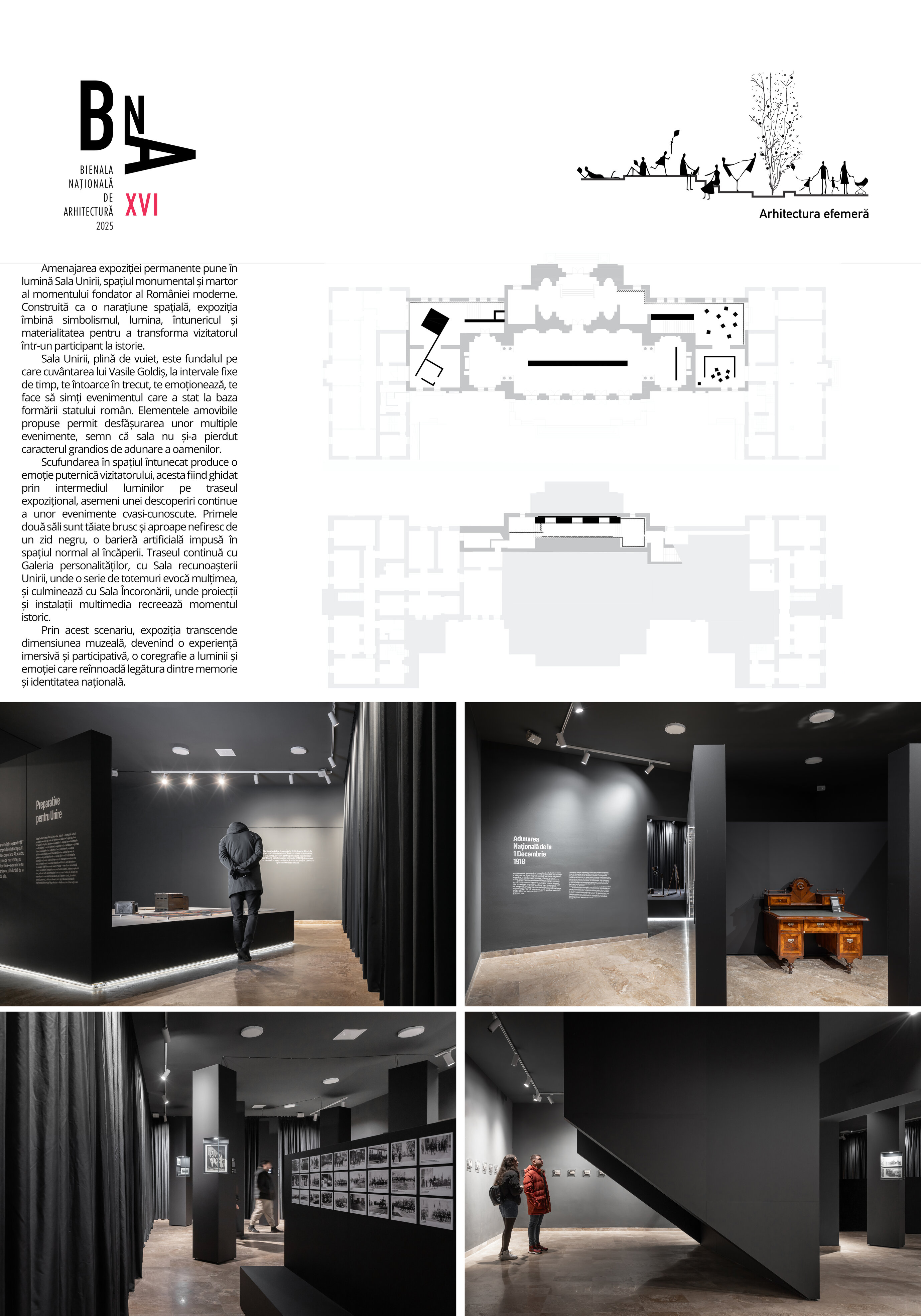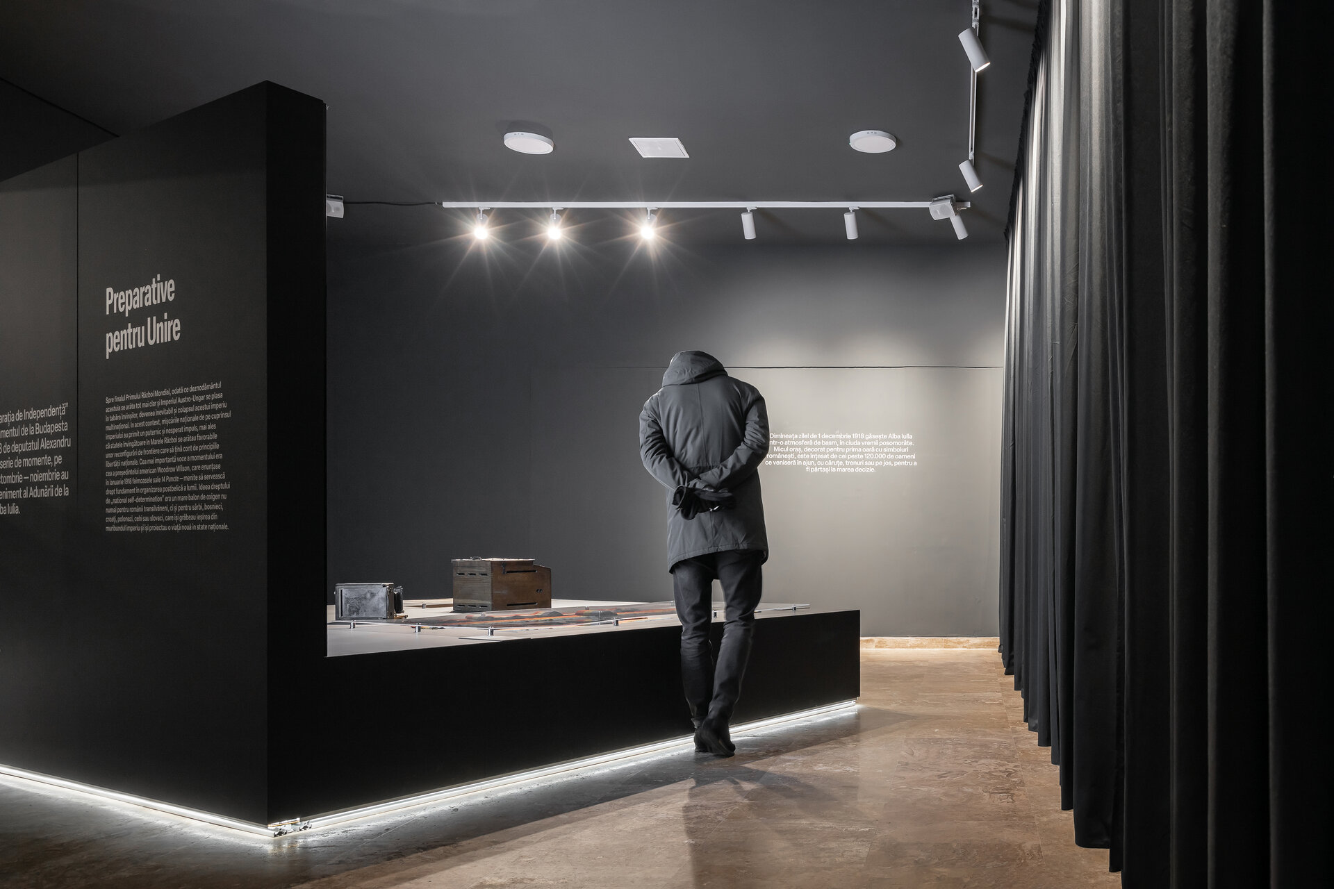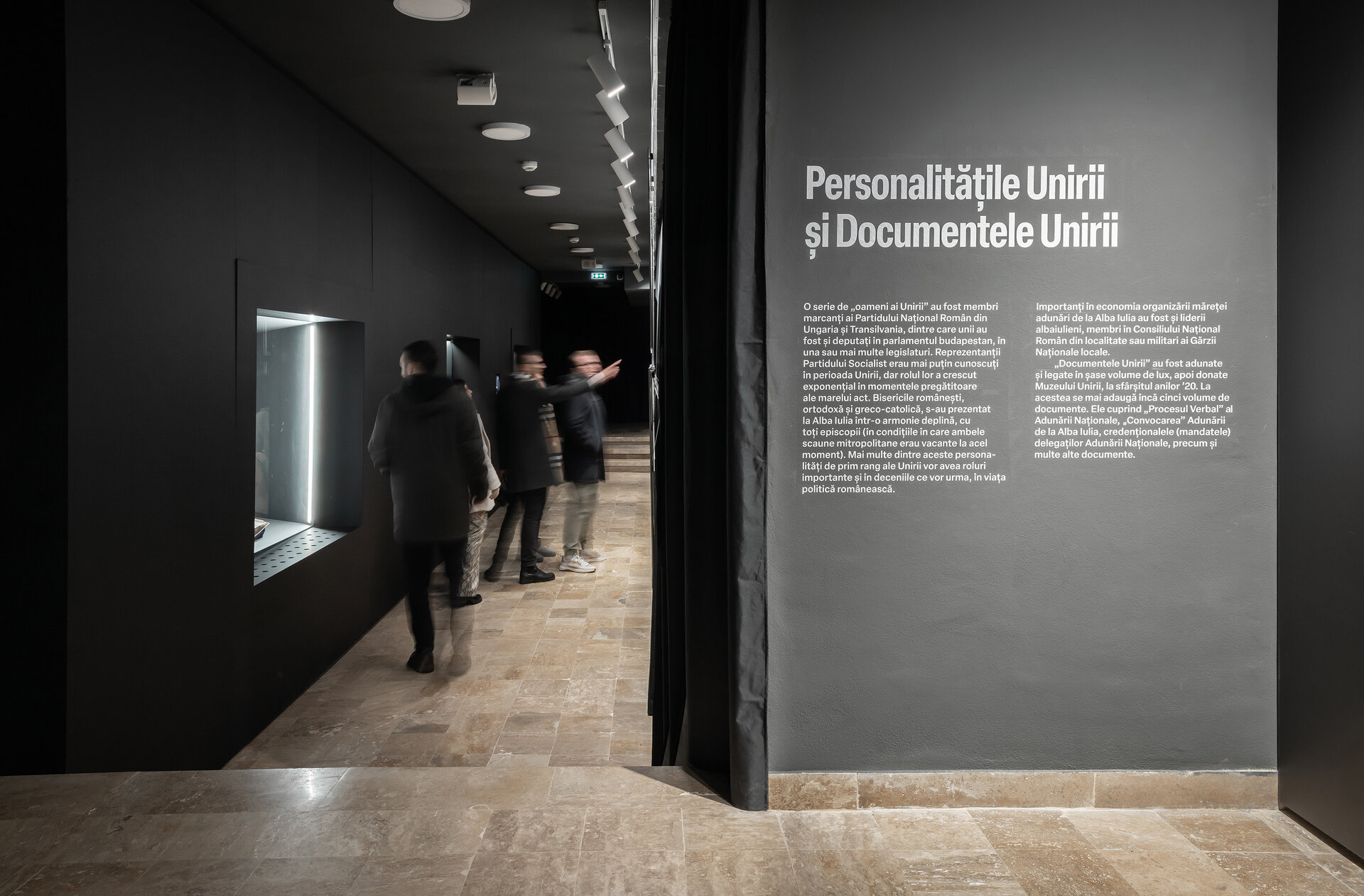 Scufundarea în spațiul întunecat produce o emoție puternică vizitatorului, acesta fiind ghidat prin intermediul luminilor pe traseul expozițional, asemeni unei descoperiri continue a unor evenimente cvasi-cunoscute. Primele două săli sunt tăiate brusc și aproape nefiresc de un zid negru, o barieră artificială impusă în spațiul normal al încăperii. Zidul semnifică despărțirea brutală îndurată de români, despărțire care acum, ca vizitator, te ghidează prin preparativele Unirii spre jumătatea opusă a sălii care reprezintă Unirea propriu-zisă. Zidul te conduce, formează încăperi, pune în valoare obiectele expuse ca pe o podină servită vizitatorului. Zidul formează spații stranii care prin intermediul luminii te invită să le descoperi etapizat, la un pas controlat, punctând elementele esențiale ale expoziției. Utilizatorul are la dispoziție un sistem interactiv prin care se înlesnește înțelegerea evenimentelor ce au stat la baza realizării Unirii, cât și a evenimentului propriu-zis.