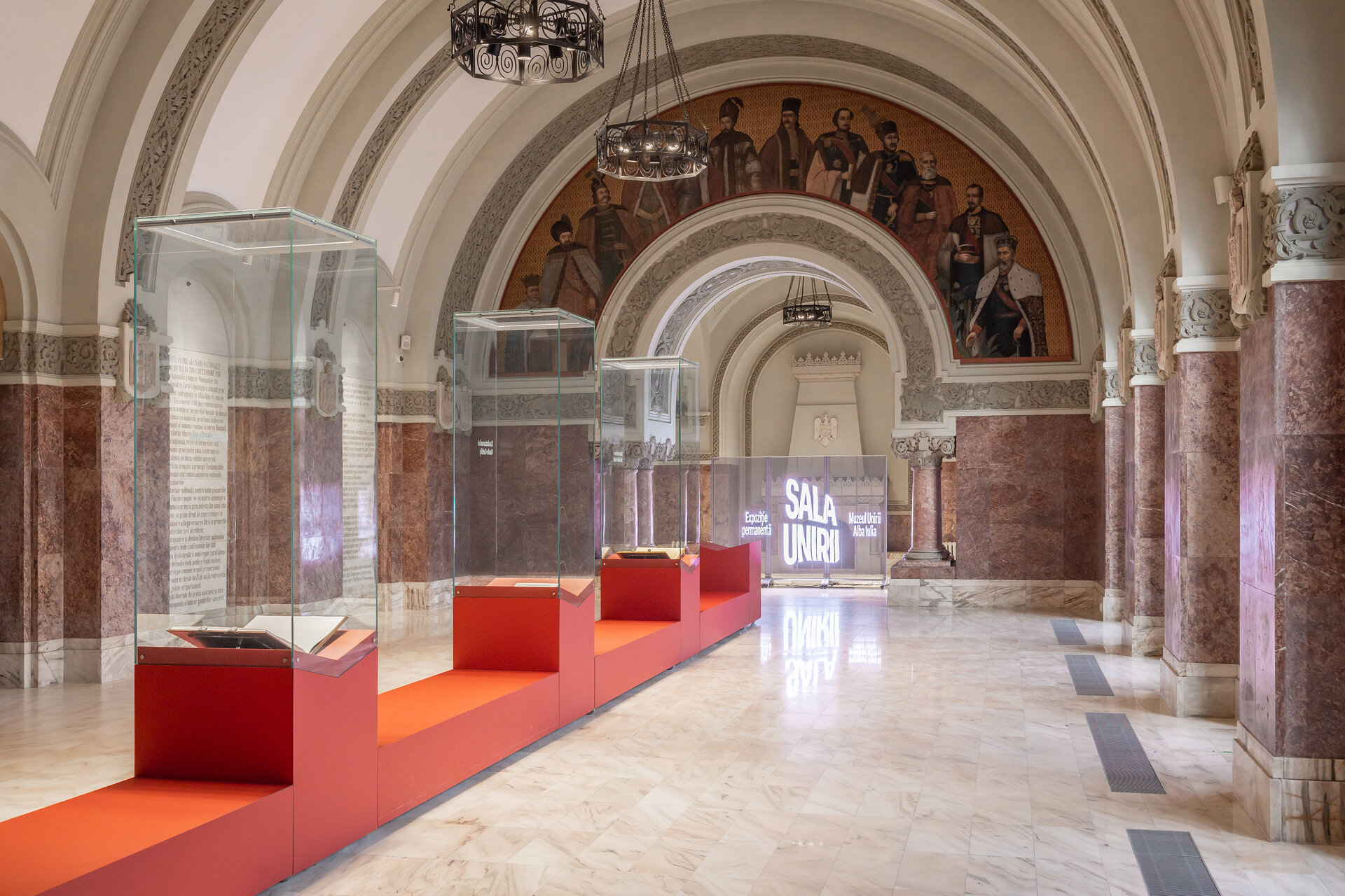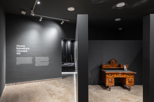 Amenajarea expoziției permanente, țesută în jurul Sălii Unirii, pune în lumină grandoarea și măreția spațiului ce a fost martor unui eveniment istoric de mare seamă pentru formarea României. Astfel, spațiul muzeal este o lume distinctă, cufundată în întuneric, care semnifică stăruința românilor de a se uni cu patria mamă, iar Sala Unirii reprezintă desăvârșirea neamului, ieșirea către lumină.