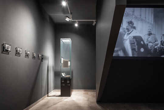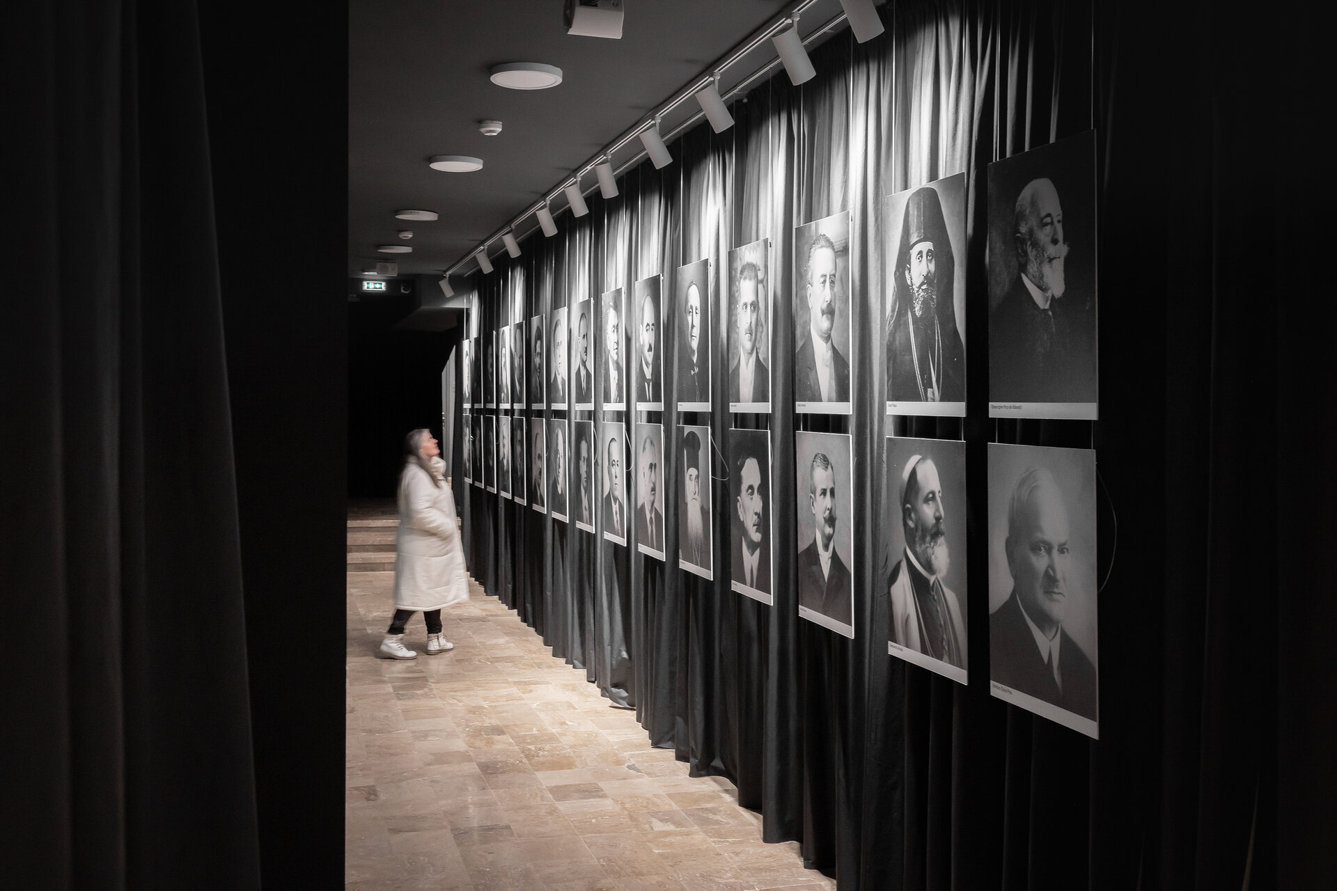 După această experiență, scara te invită omagios să cobori pe sub steagurile suspendate, asemeni unei manifestații imperiale, spre galeria personalităților. Privirea nu este una directă, ci este obturată pentru a forma o înlănțuire de spații care preced spațiul longitudinal din subsol, asemeni unei anticamere. Galeria personalităților este închisă pe trei laturi de o catifea groasă care animă spațiul longitudinal, în care o laterală este flancată de chipurile personalităților, ce formează ideea unei manifestații solemne. Pe latura opusă sunt expuse, în nișele nou create, piesele originale.