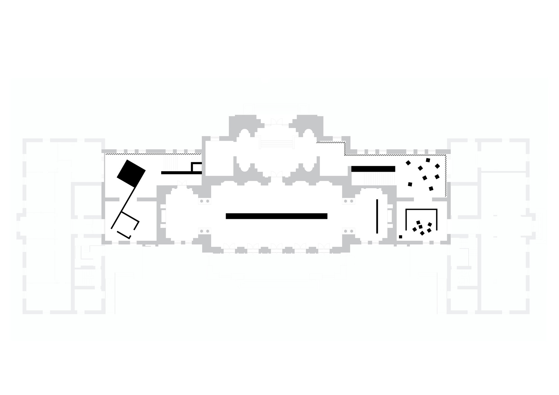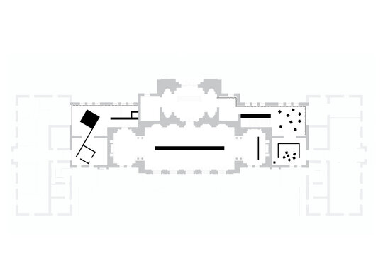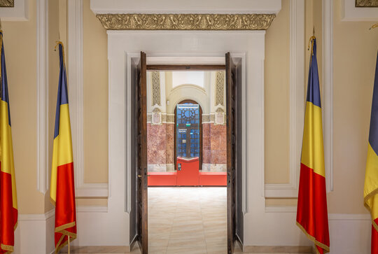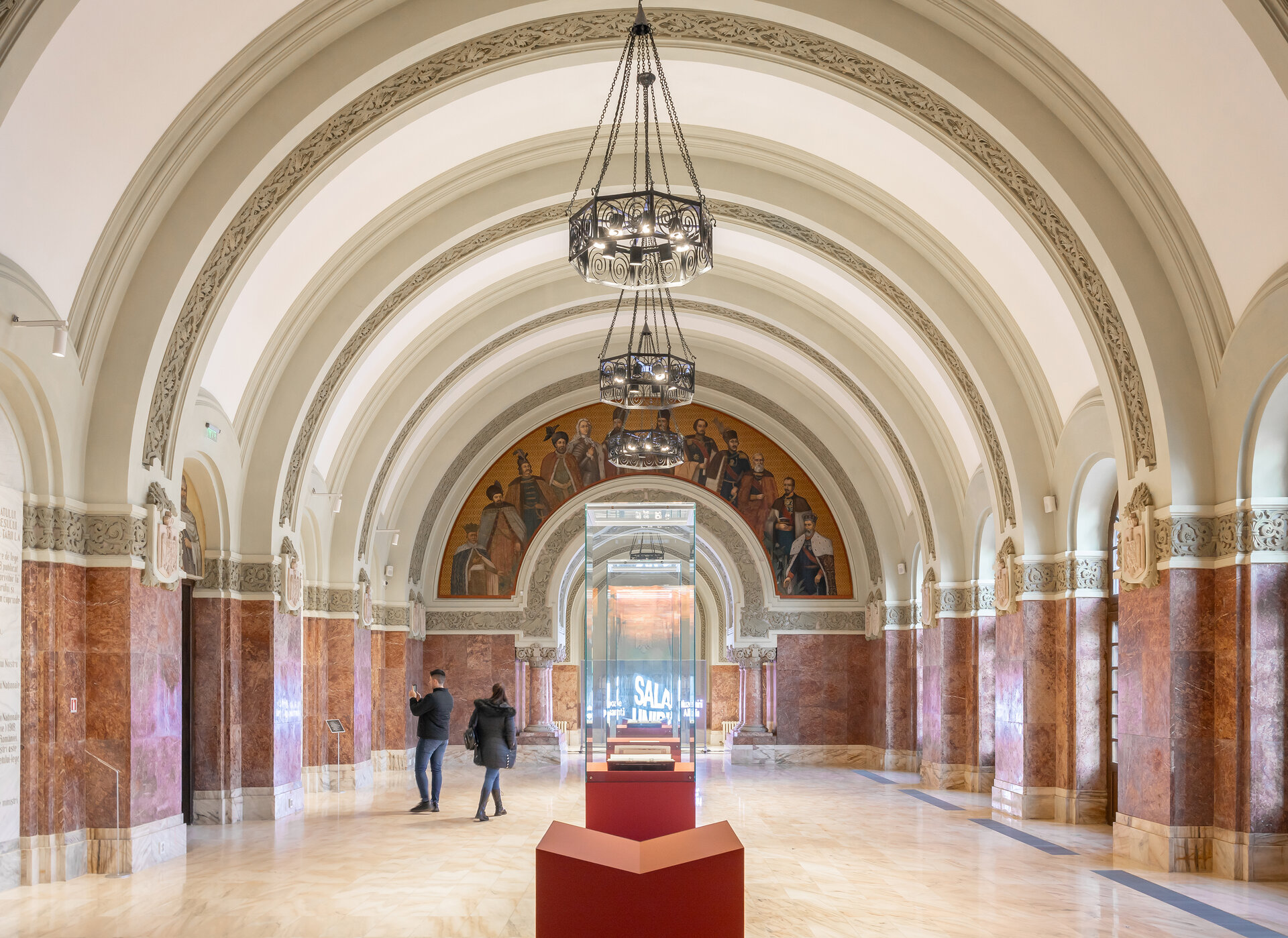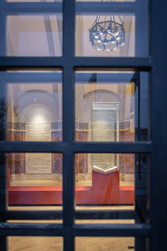 Sala Încoronării este dublată de un zid suspendat care îți permite să vezi partea inferioară a oamenilor din interior, dinamica intrinsecă a acestora. Zidul te forțează să ocolești, să explorezi piesele expuse, să înțelegi dinamica evenimentelor. În interiorul zidului rulează la intervale prestabilite filmul încoronării.