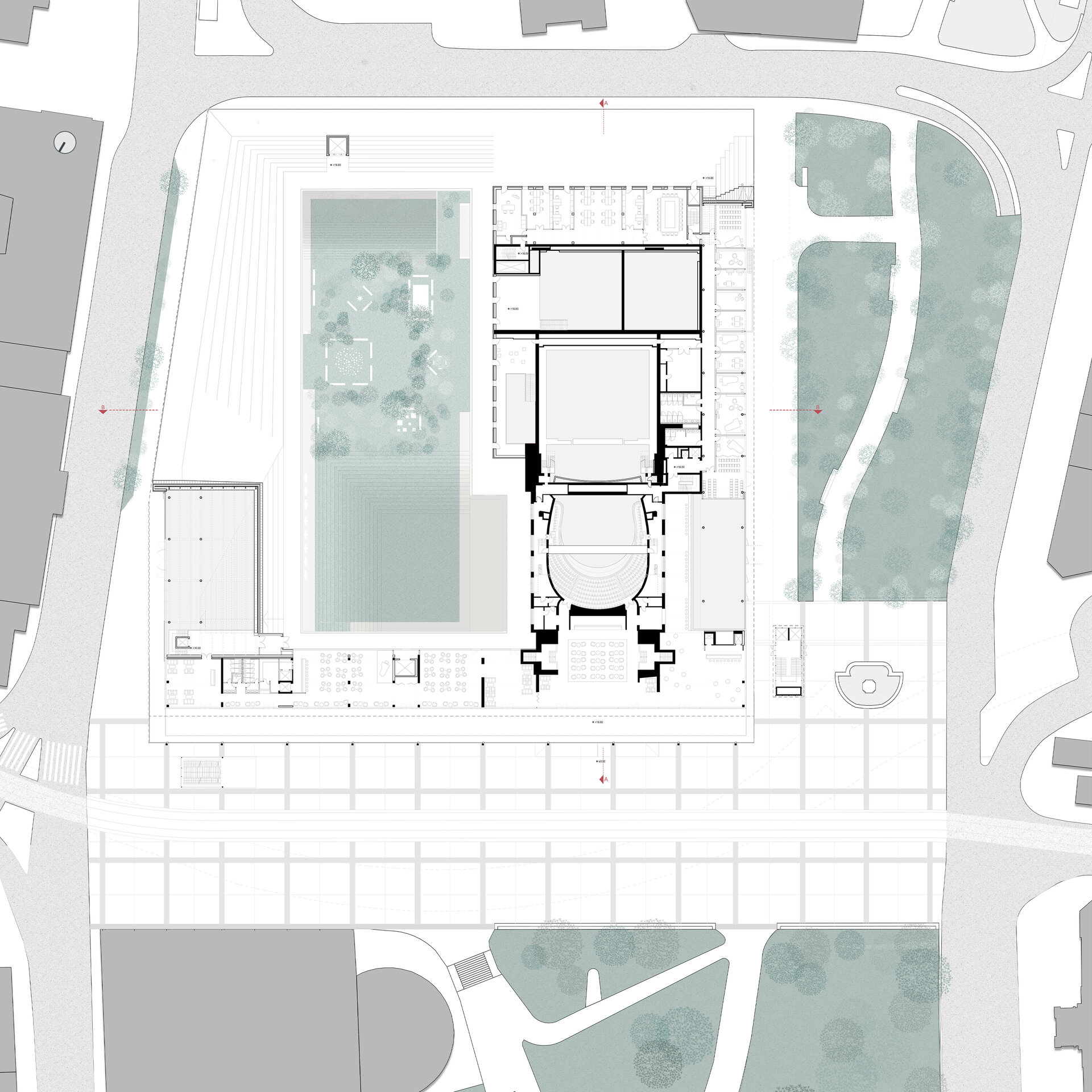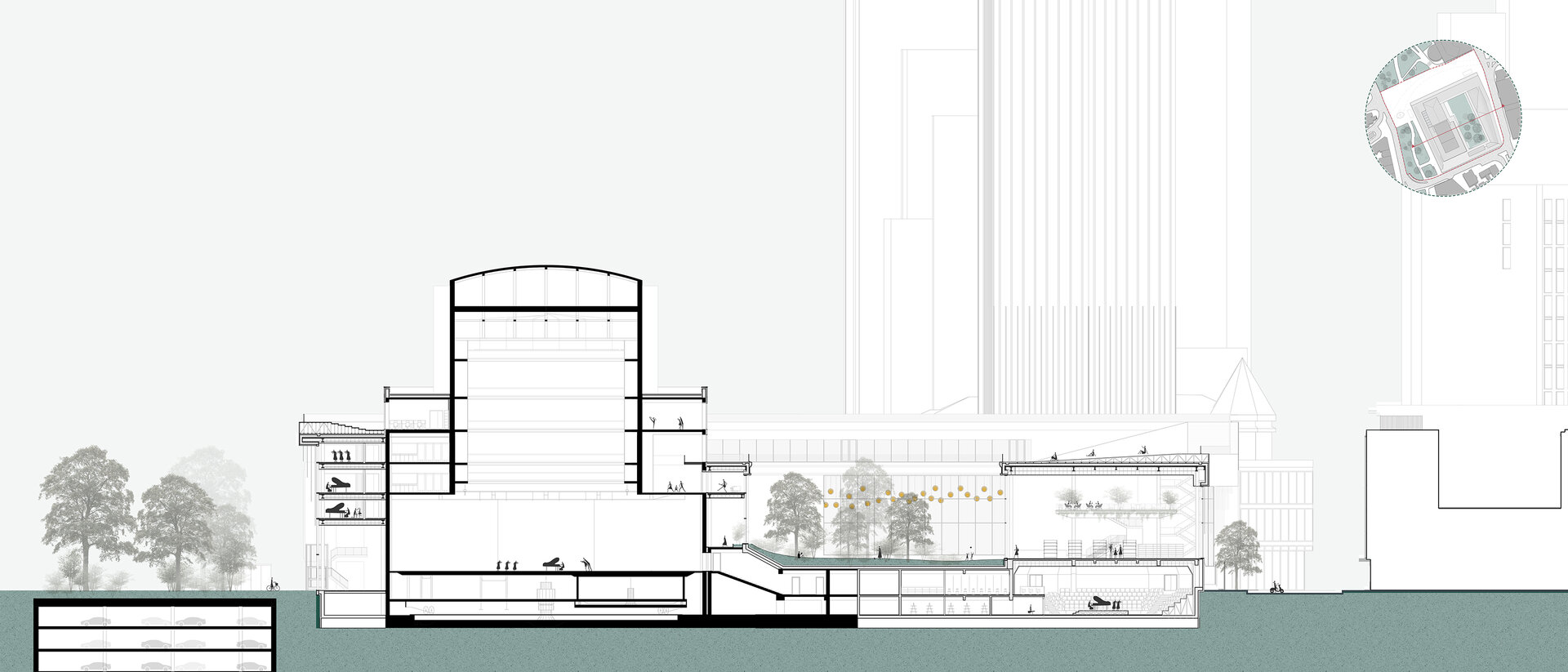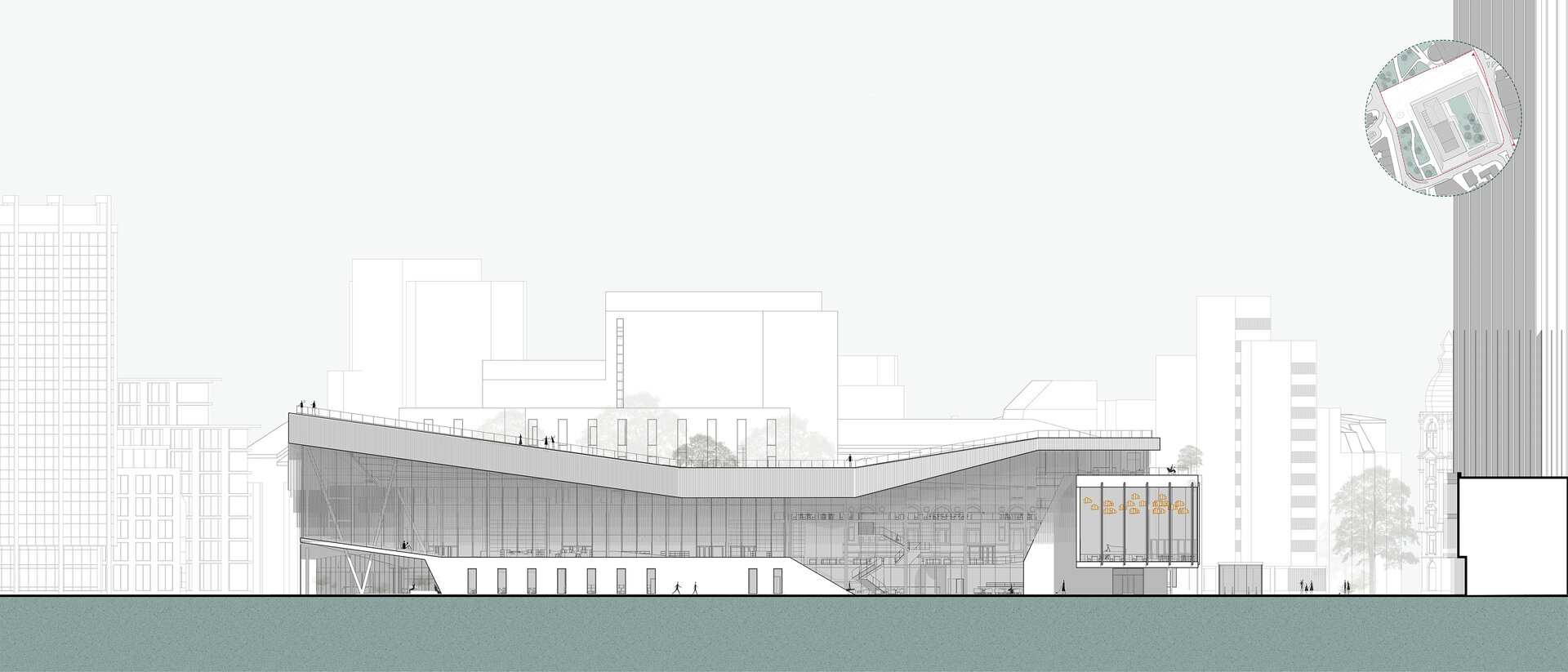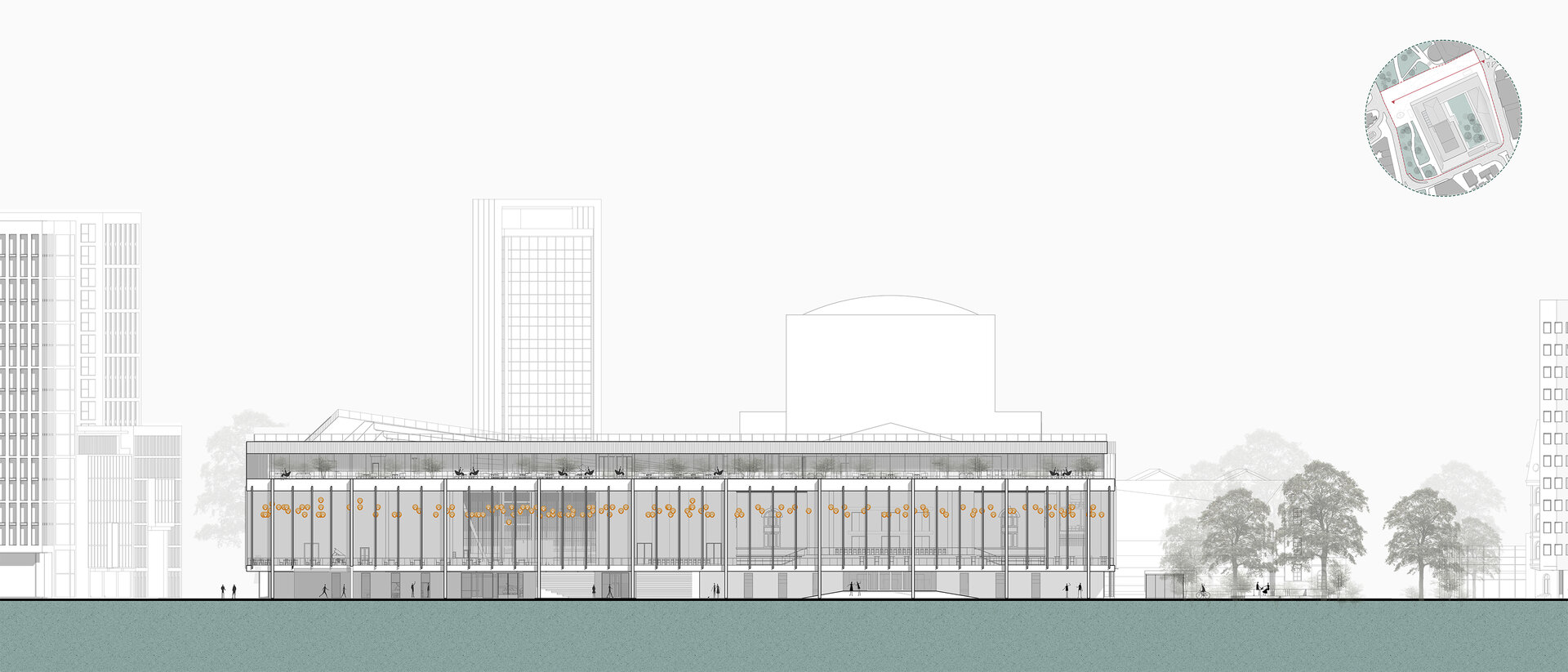În propunerea, sală de spectatori și turnul scenei rămân intacte, împreună cu foaierul „norilor” raționalist, care conține o operă de artă spațială de la Zoltan Kemény și astfel, din 2015, stă sub protecție culturală. Intervenția constă în deschiderea foaierului existent către public și continuarea lui pe toate cele patru laturi ale parcelei. Interiorul său găzduiește programe auxiliare, complementare operei, precum o mediatecă, cafenele și zone expoziționale pe lângă funcțiunea sa principală de foaier. Din el se accesează diferite săli multifuncționale, fiecare cu o arhitectură aurală distinctă, astfel încât să servească interpretarea muzicii în multiple stiluri diverse, cu scopul de a atrage și aduce un public mai larg și divers. Interior incintei constă dintr-o gradină publică, care deține un soundscape natural, protejat de zgomotele orașului și care dispune de o scenă la aer liber și experimente muzicale pentru copii. Transparență și permeabilitate permit o trecere ușoară între cele două lumi. În același timp, acoperișul intervenției devine o promenadă publică, care permite coridoare de belvedere asupra diferitele părți ale orașului. Astfel opera din Frankfurt, în prezent activă doar în două seri pe săptămână și în rest o limită în spațiul orașului, devine un spațiu public și accesibil, care să atragă și să educe publicul larg.