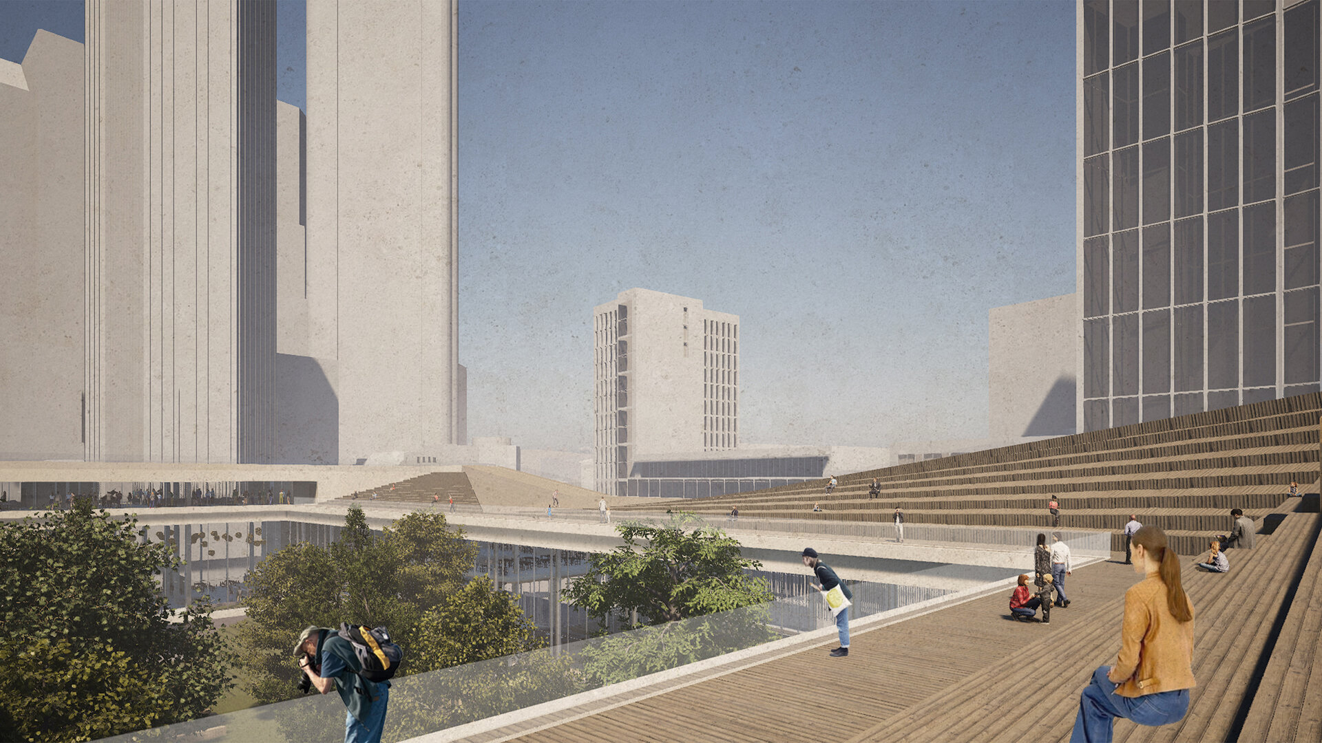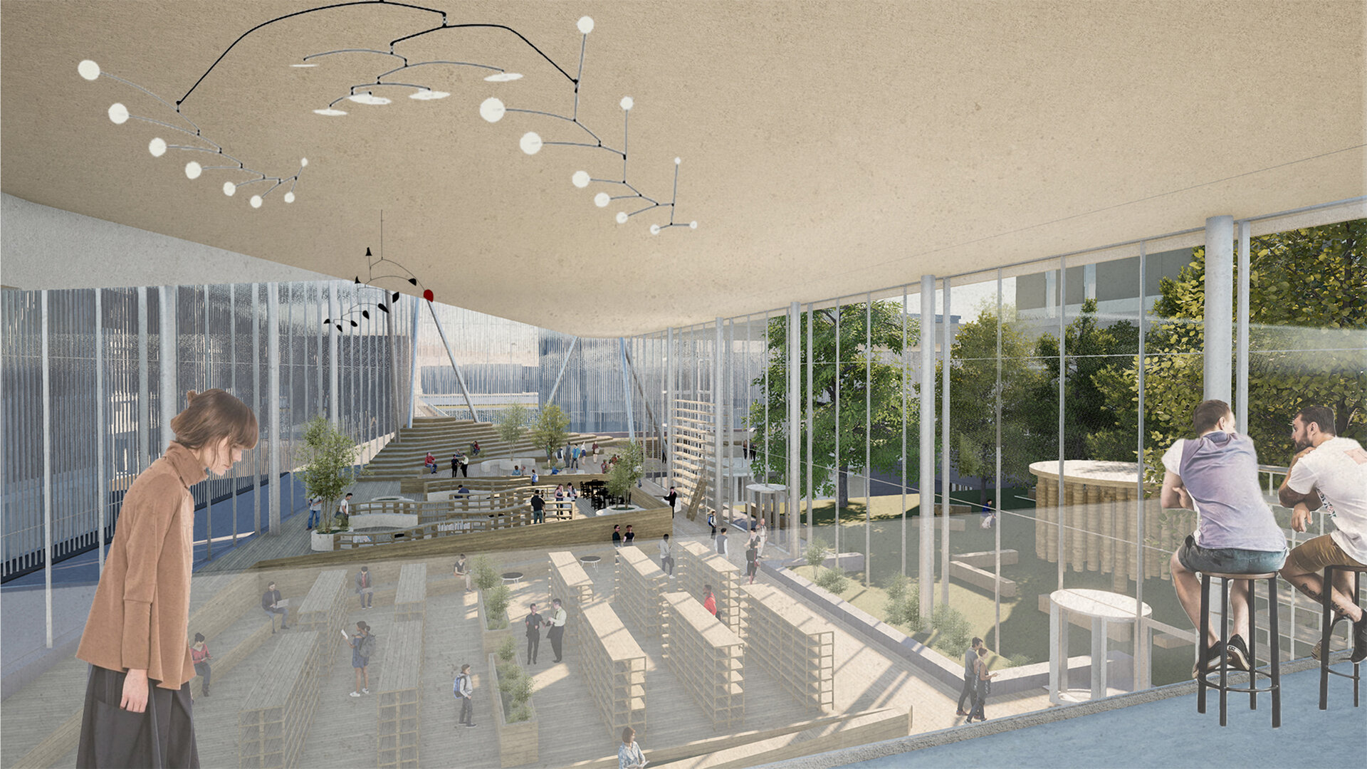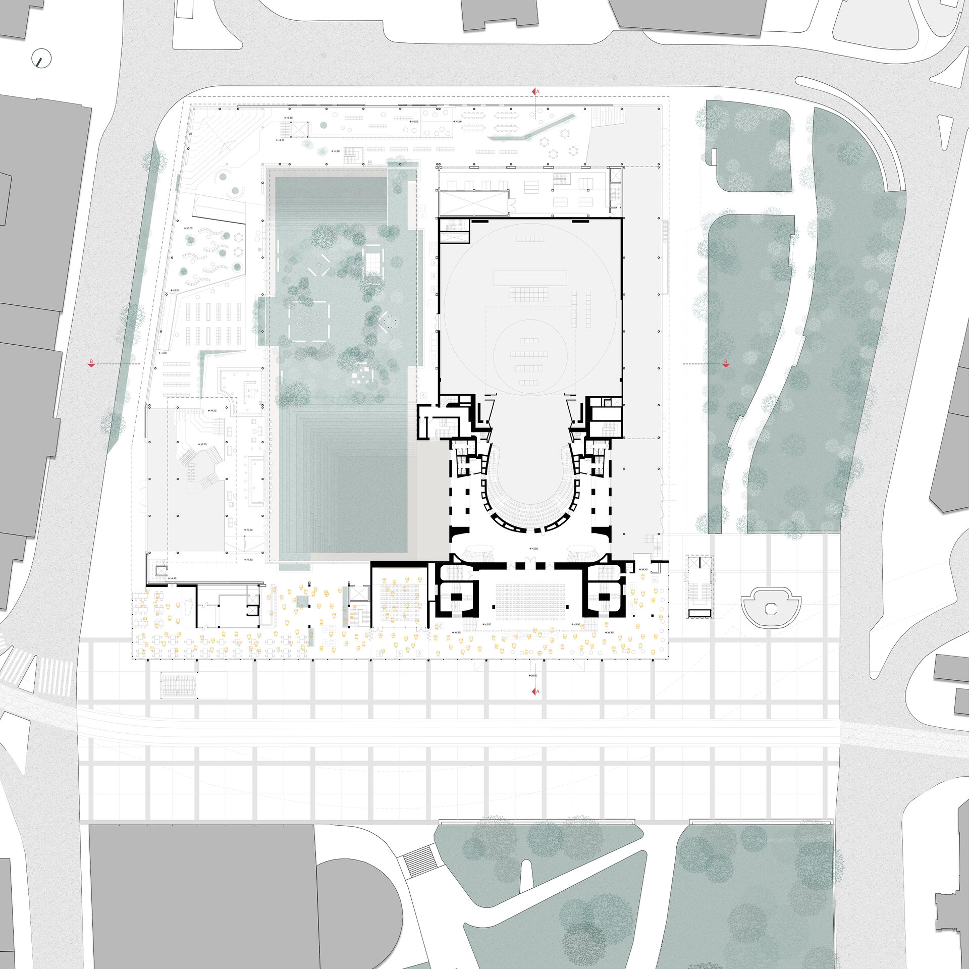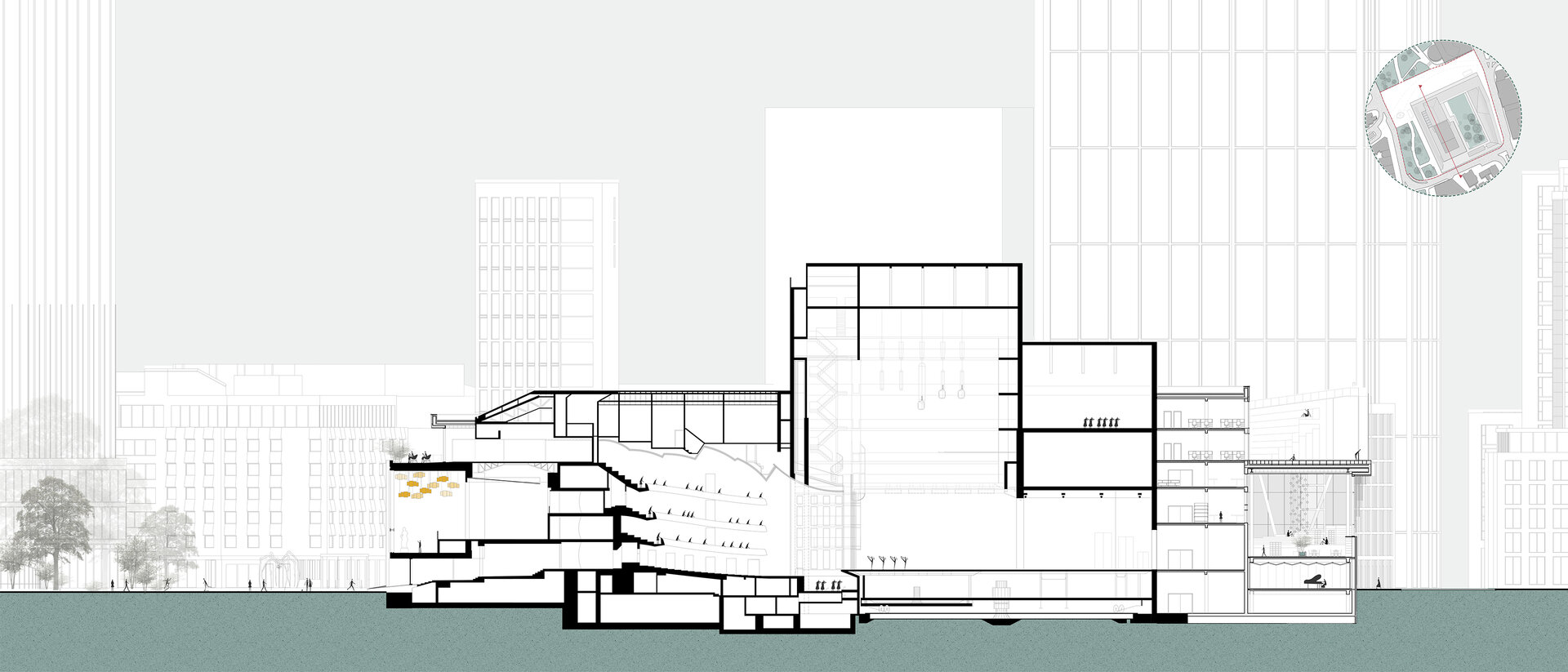 În propunerea, sală de spectatori și turnul scenei rămân intacte, împreună cu foaierul „norilor” raționalist, care conține o operă de artă spațială de la Zoltan Kemény și astfel, din 2015, stă sub protecție culturală. Intervenția constă în deschiderea foaierului existent către public și continuarea lui pe toate cele patru laturi ale parcelei. Interiorul său găzduiește programe auxiliare, complementare operei, precum o mediatecă, cafenele și zone expoziționale pe lângă funcțiunea sa principală de foaier. Din el se accesează diferite săli multifuncționale, fiecare cu o arhitectură aurală distinctă, astfel încât să servească interpretarea muzicii în multiple stiluri diverse, cu scopul de a atrage și aduce un public mai larg și divers. Interior incintei constă dintr-o gradină publică, care deține un soundscape natural, protejat de zgomotele orașului și care dispune de o scenă la aer liber și experimente muzicale pentru copii. Transparență și permeabilitate permit o trecere ușoară între cele două lumi. În același timp, acoperișul intervenției devine o promenadă publică, care permite coridoare de belvedere asupra diferitele părți ale orașului. Astfel opera din Frankfurt, în prezent activă doar în două seri pe săptămână și în rest o limită în spațiul orașului, devine un spațiu public și accesibil, care să atragă și să educe publicul larg.