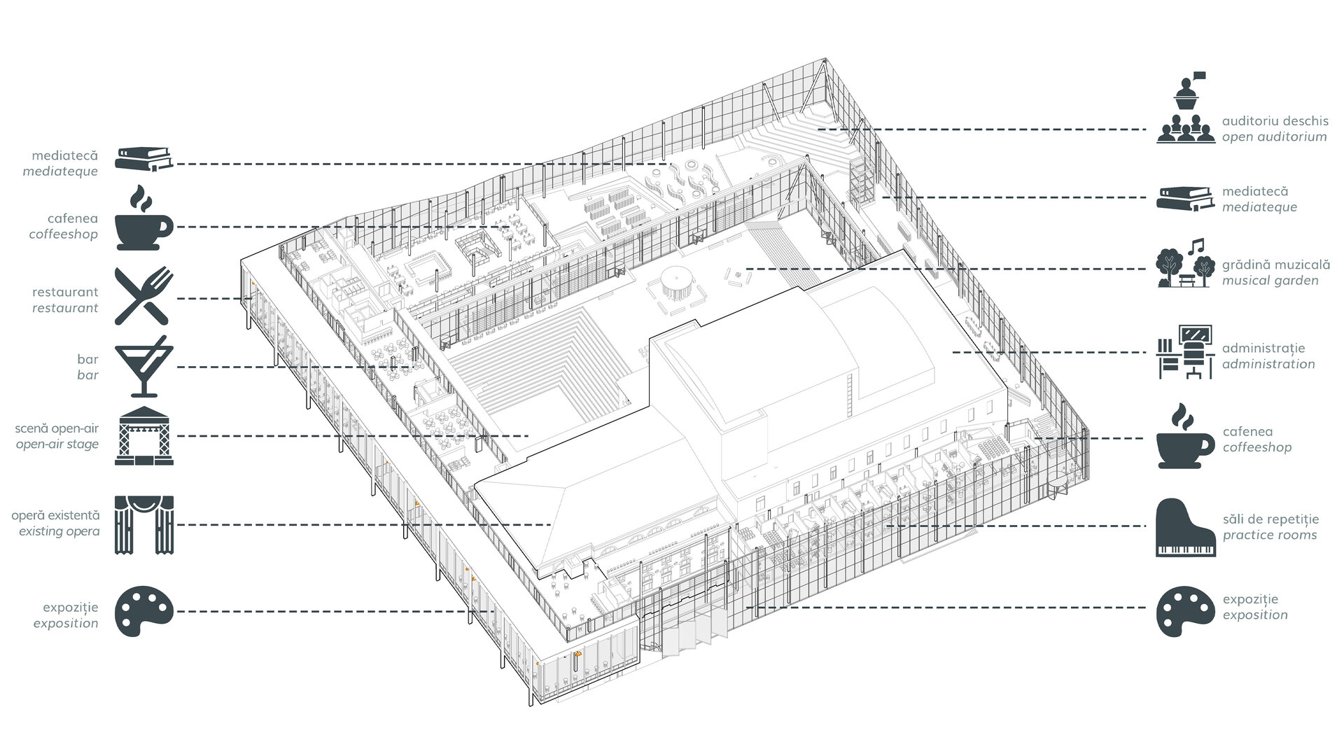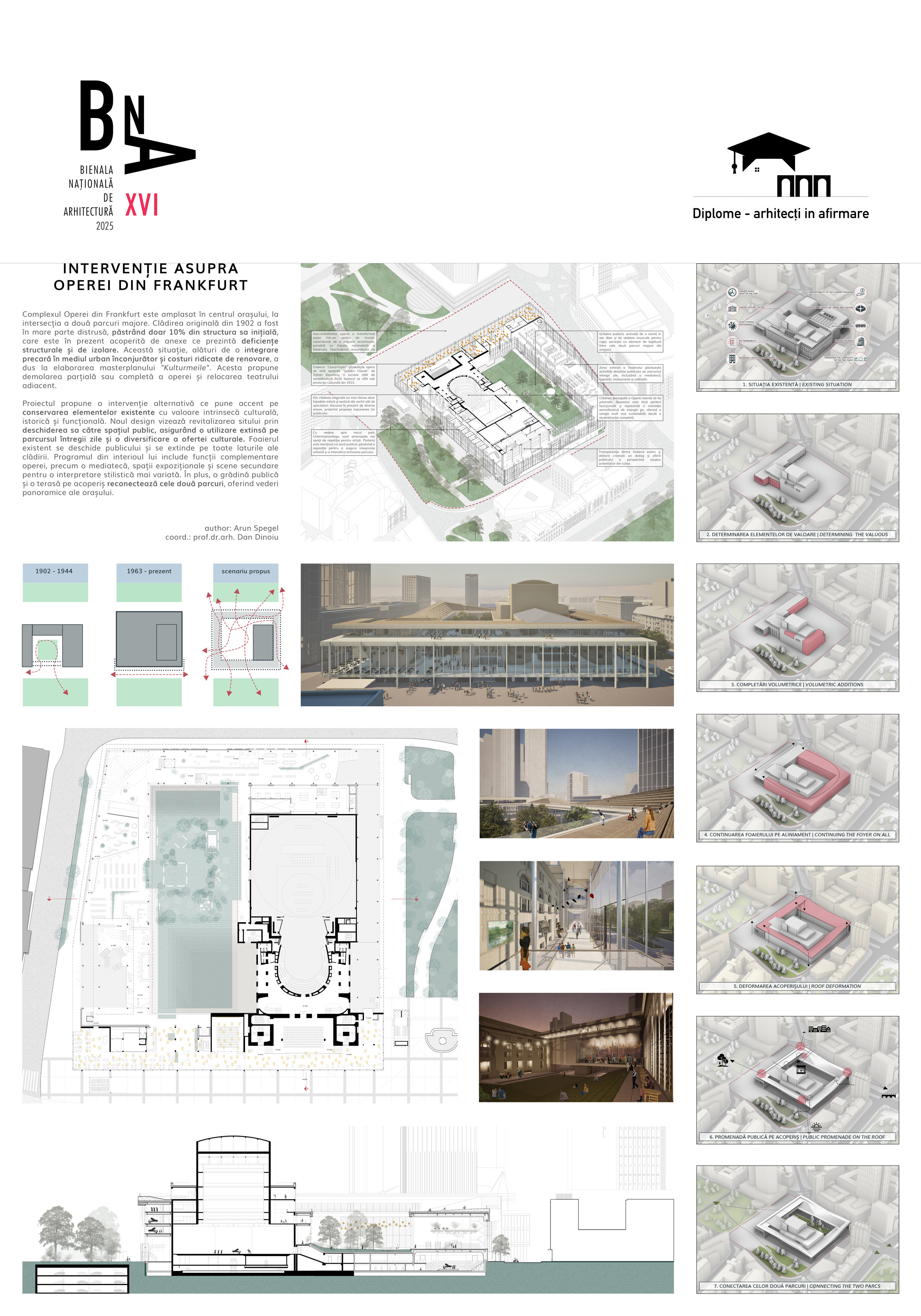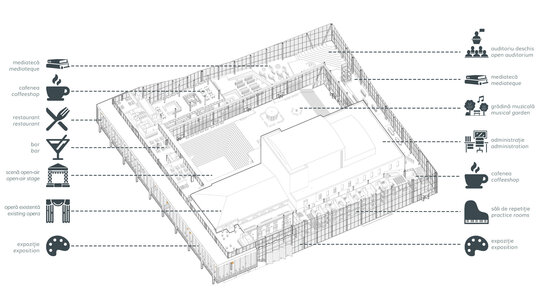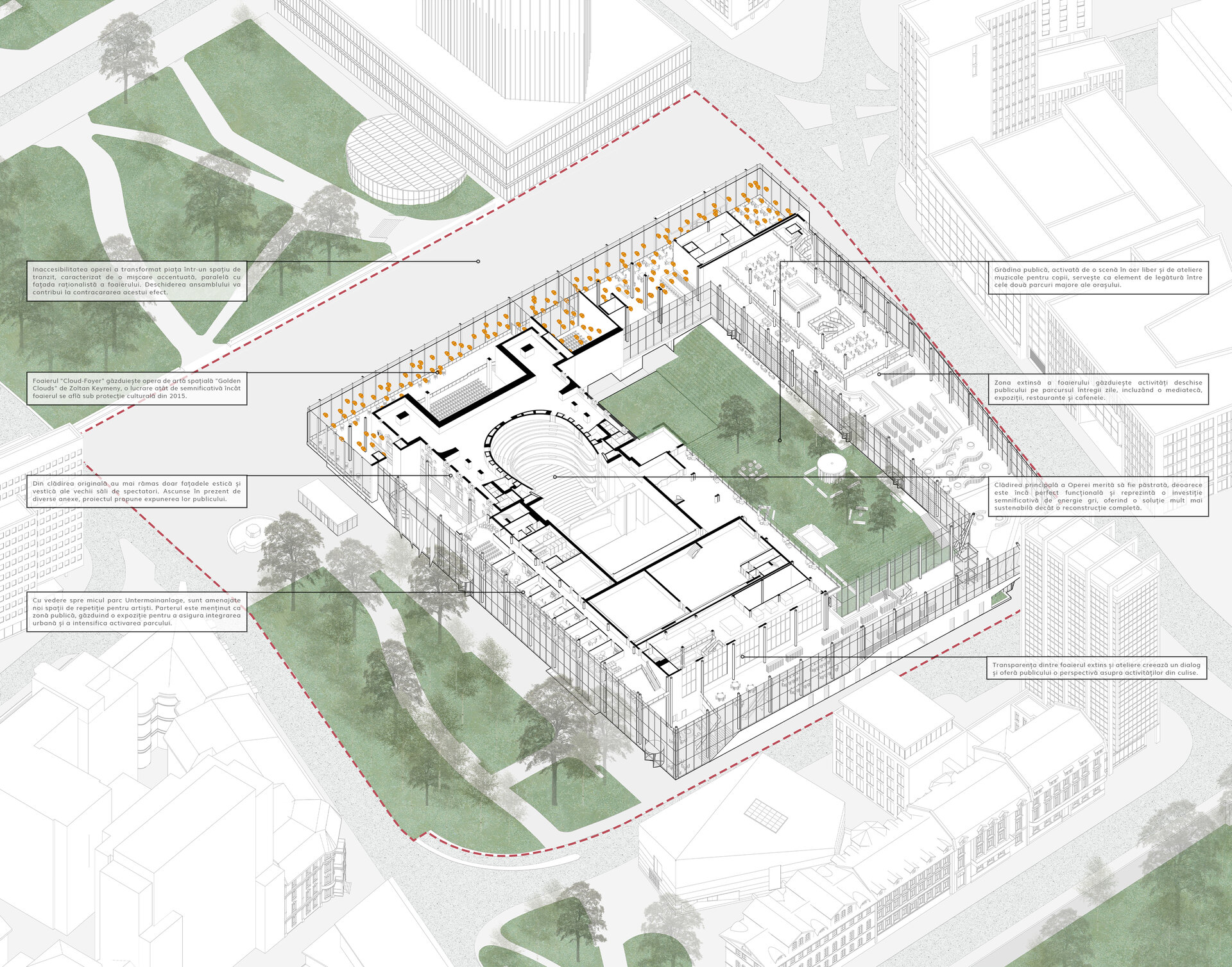 Dincolo de disfuncționalitățile tehnice și structurale, ansamblul actual este caracterizat de o ineficiență notabilă în utilizarea spațiului, o relație deficitară cu mediul urban înconjurător și o popularitate în declin a programului de teatru liric. Astfel, intervenția țintește o revitalizare a operei prin conectare la spațiu public, implementarea unui deschis publicului pe parcursul întregii zile și diversificarea ofertei culturale. O asemenea întărire a conexiunii între oraș și operă trebuie facilitată prin intermediul foaierului, care constituie elementul de legătură între viața urbană obișnuită și cea artistică a operei, având rolul de a media interacțiunea între cele două sfere în momentele în care cortina este trasă și a pregăti spectatorul înainte de a participa la actul artistic.