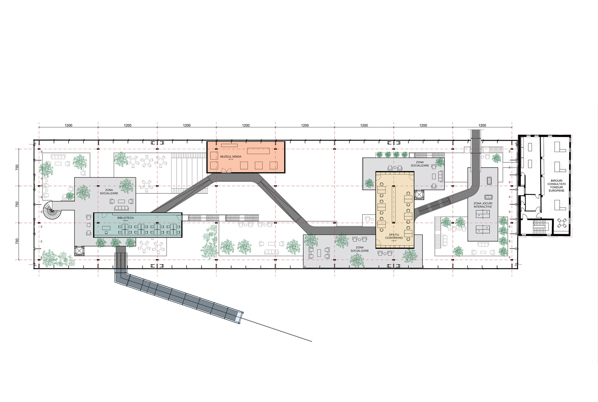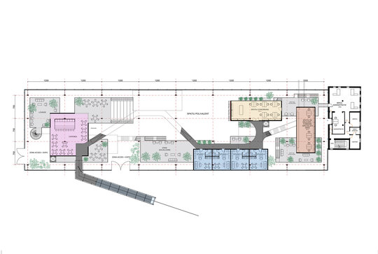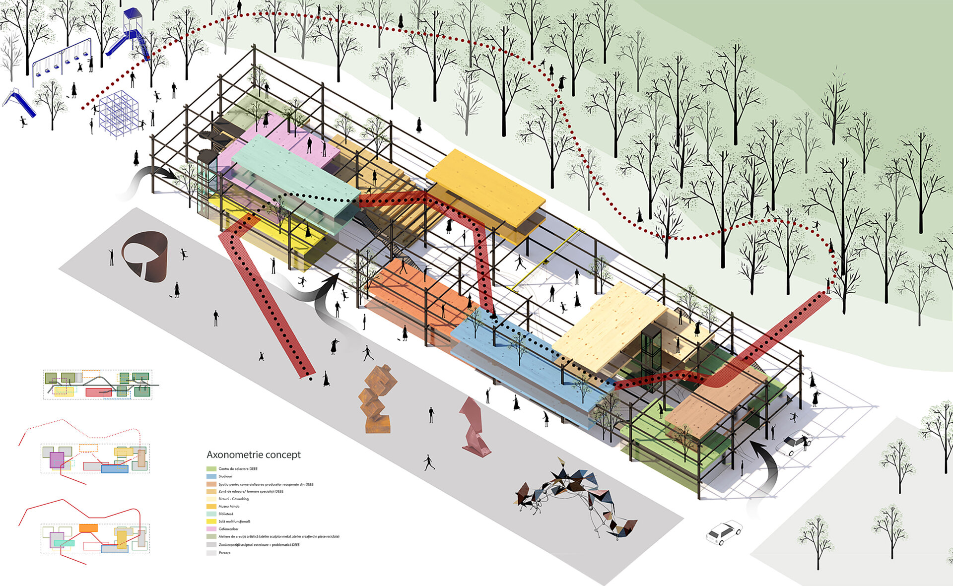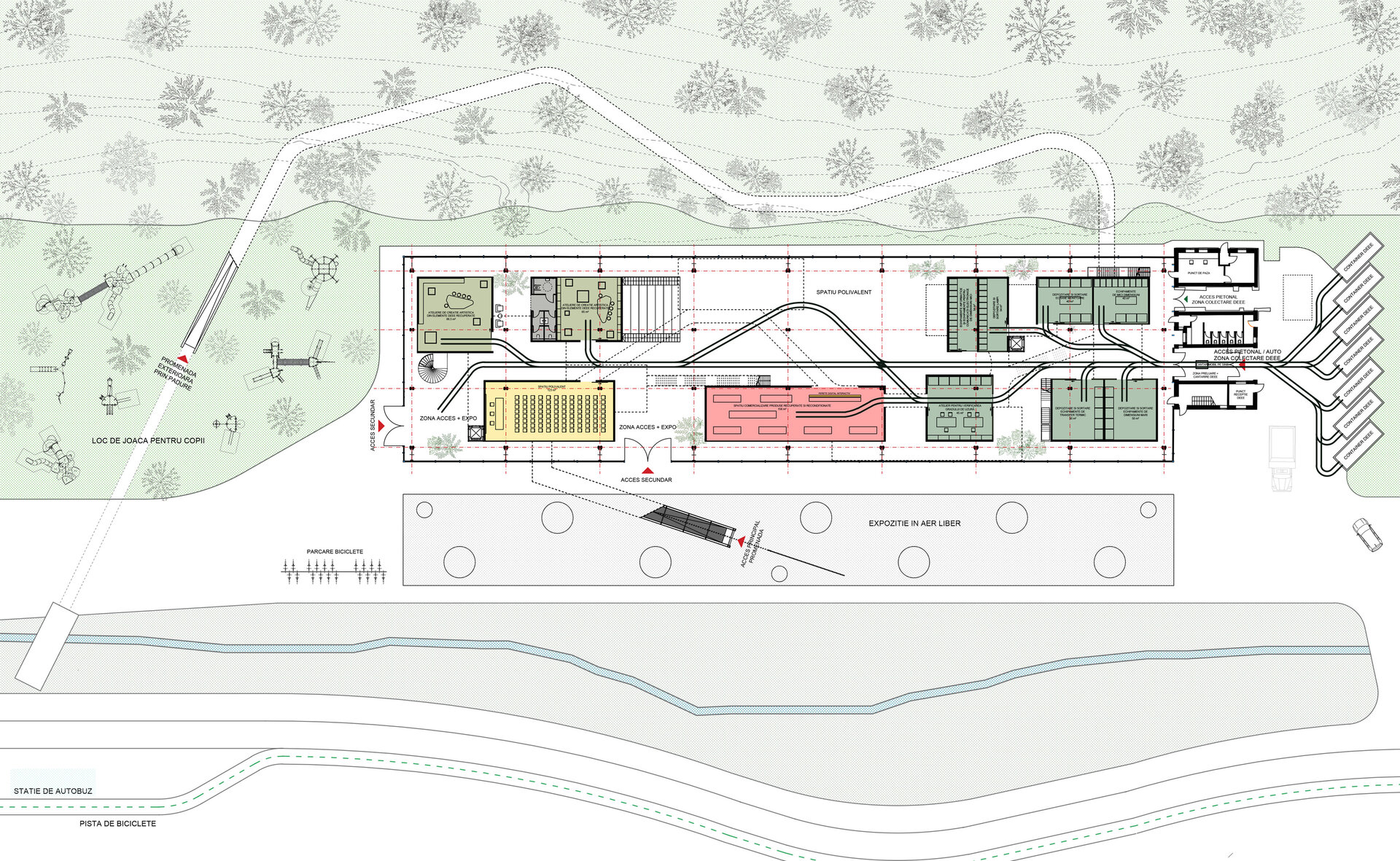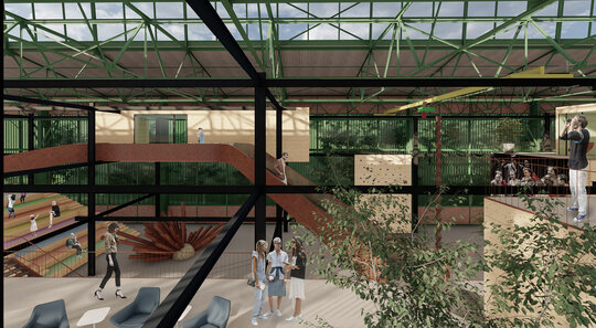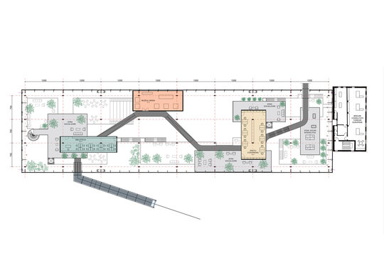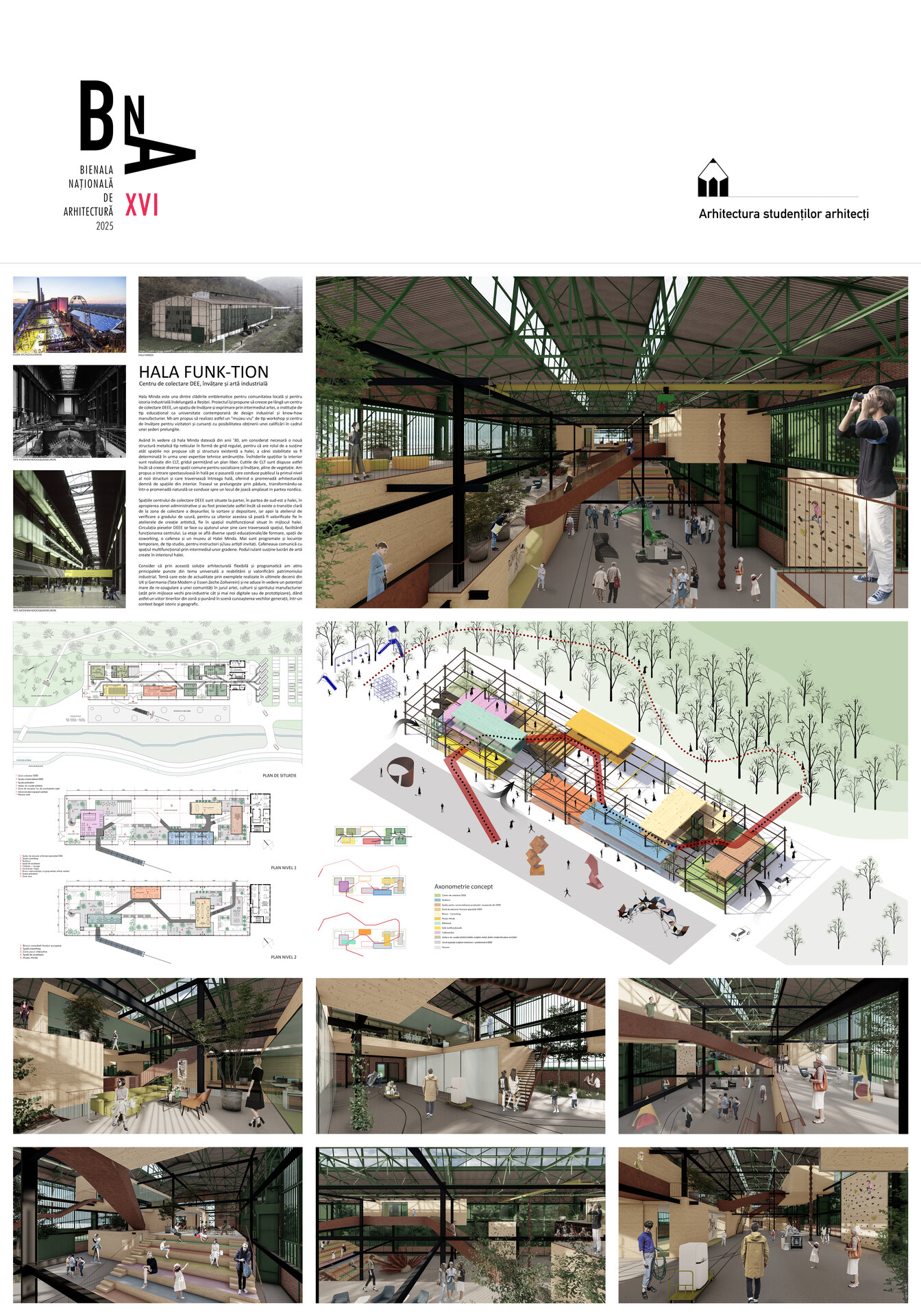 Având în vedere că hala Minda datează din anii '30, am considerat necesară o nouă structură metalică tip reticular în formă de grid regulat, pentru că are rolul de a susține atât spațiile noi propuse cât și structura existentă a halei, a cărei stabilitate va fi determinată în urma unei expertize tehnice amănunțite. Închiderile spațiilor la interior sunt realizate din CLT, gridul permițând un plan liber. Cutiile de CLT sunt dispuse astfel încât să creeze diverse spații comune pentru socializare și învățare, pline de vegetație. Am propus o intrare spectaculoasă în hală pe o pasarelă care conduce publicul la primul nivel al noii structuri și care traversează întreaga hală, oferind o promenadă arhitecturală demnă de spațiile din interior. Traseul se prelungește prin pădure, transformându-se într-o promenadă naturală ce conduce spre un locul de joacă amplasat in partea nordica.