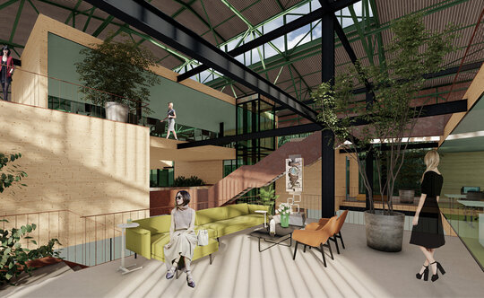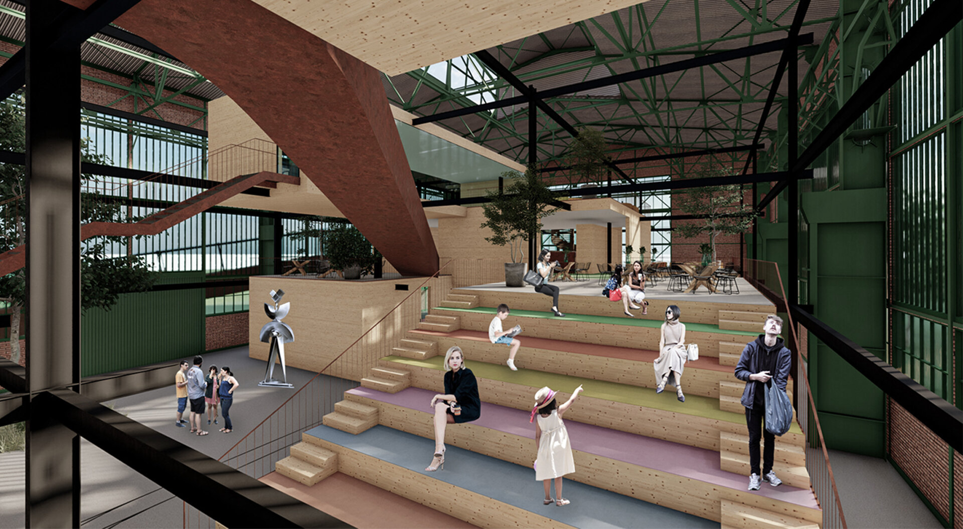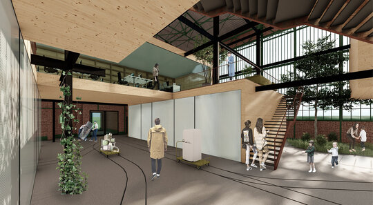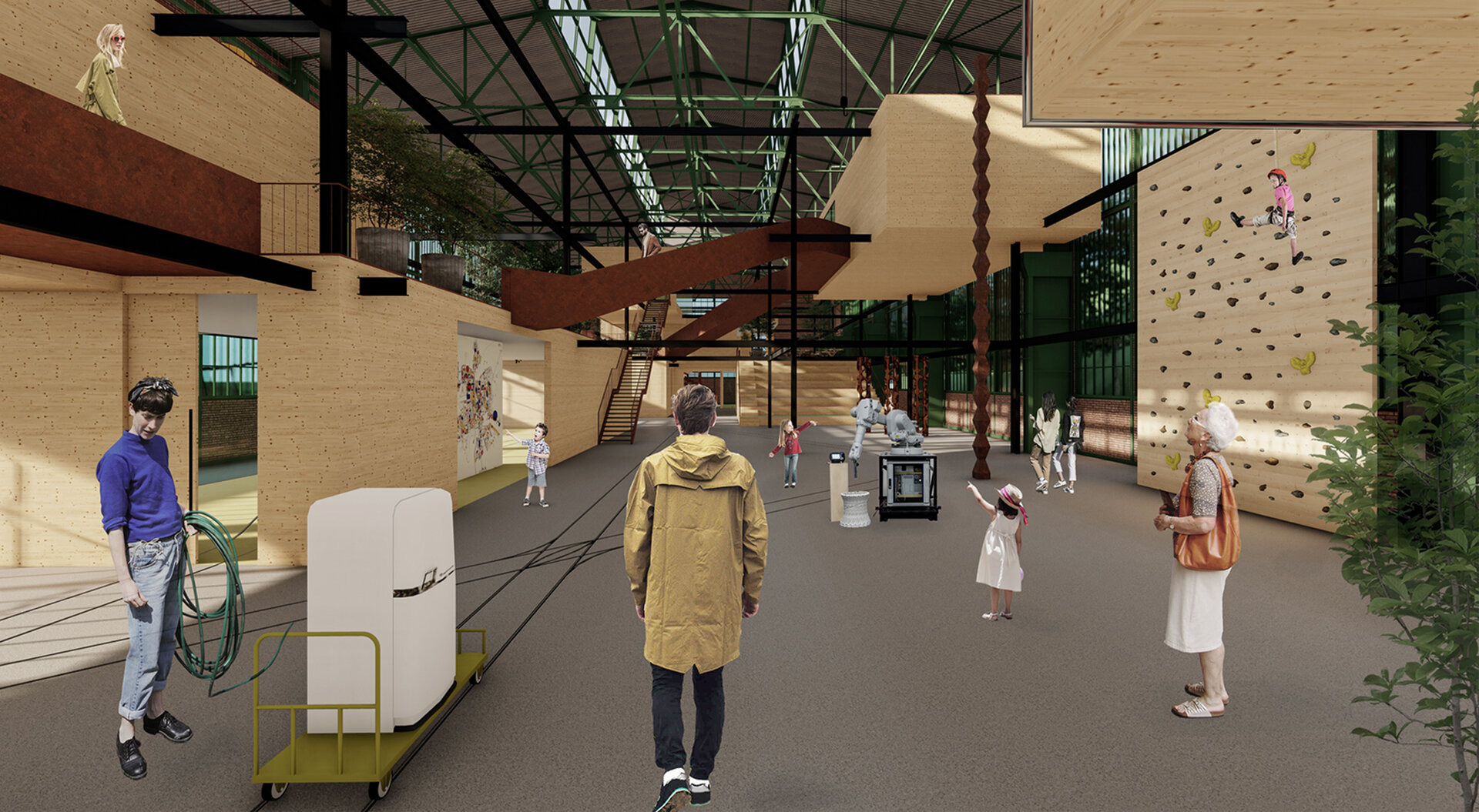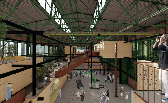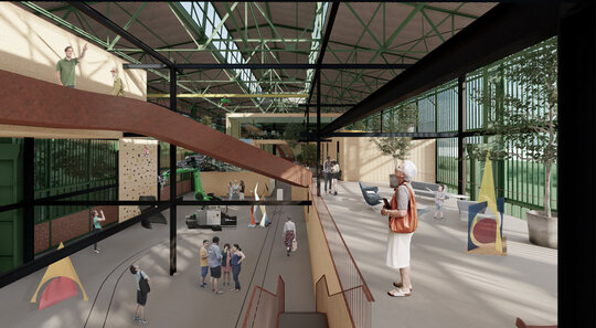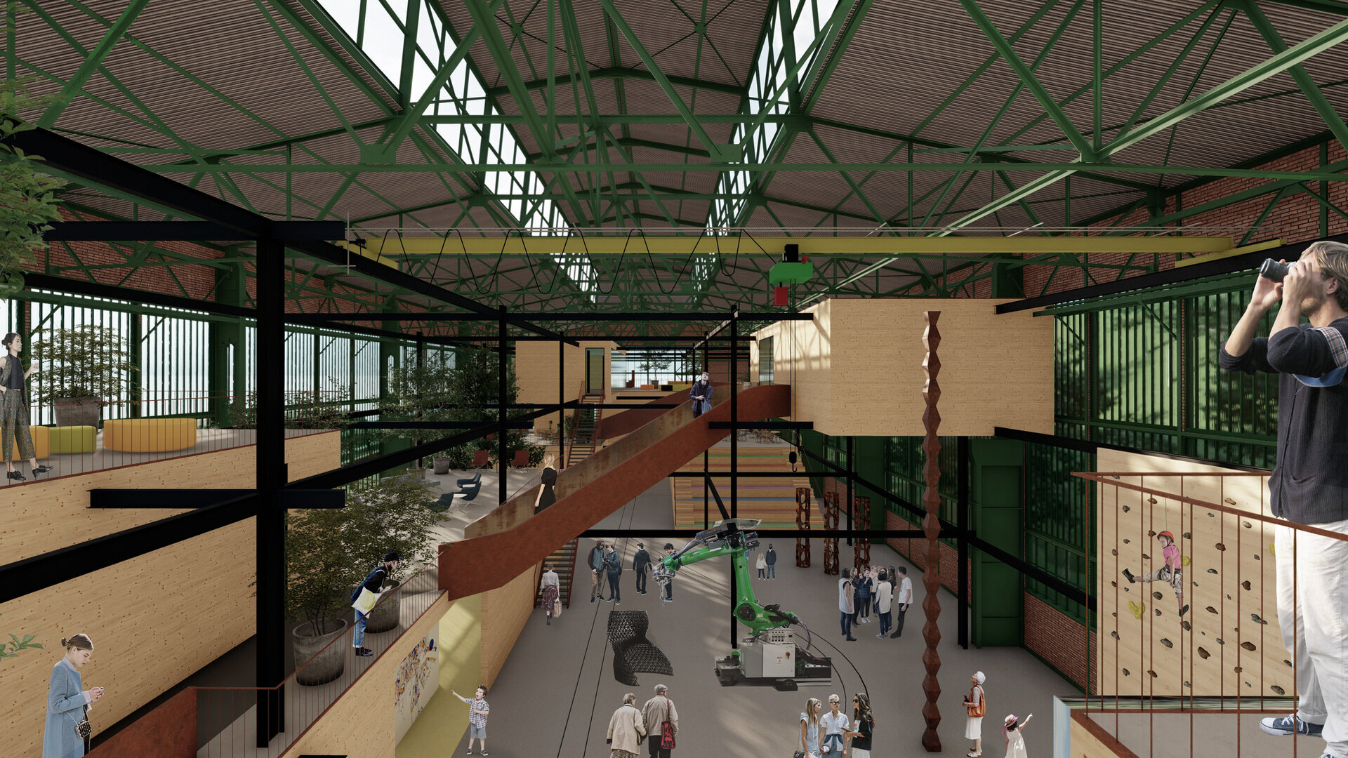 Având în vedere că hala Minda datează din anii '30, am considerat necesară o nouă structură metalică tip reticular în formă de grid regulat, pentru că are rolul de a susține atât spațiile noi propuse cât și structura existentă a halei, a cărei stabilitate va fi determinată în urma unei expertize tehnice amănunțite. Închiderile spațiilor la interior sunt realizate din CLT, gridul permițând un plan liber. Cutiile de CLT sunt dispuse astfel încât să creeze diverse spații comune pentru socializare și învățare, pline de vegetație. Am propus o intrare spectaculoasă în hală pe o pasarelă care conduce publicul la primul nivel al noii structuri și care traversează întreaga hală, oferind o promenadă arhitecturală demnă de spațiile din interior. Traseul se prelungește prin pădure, transformându-se într-o promenadă naturală ce conduce spre un locul de joacă amplasat in partea nordica.