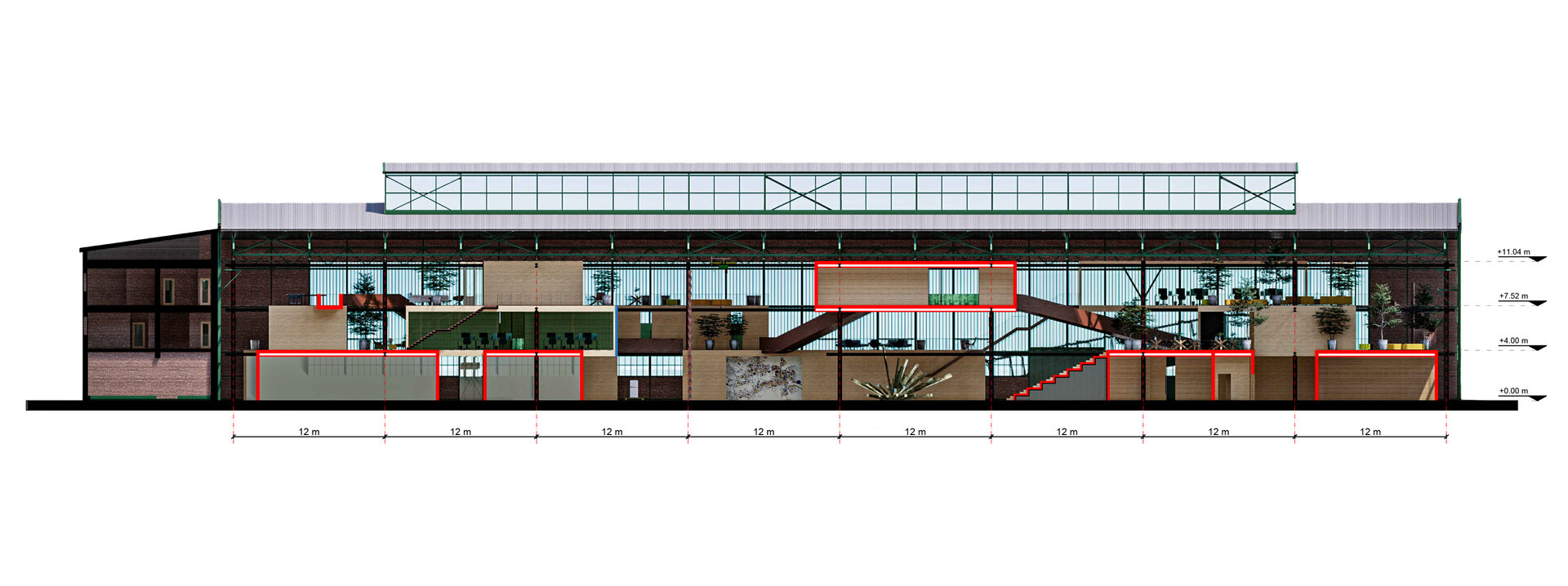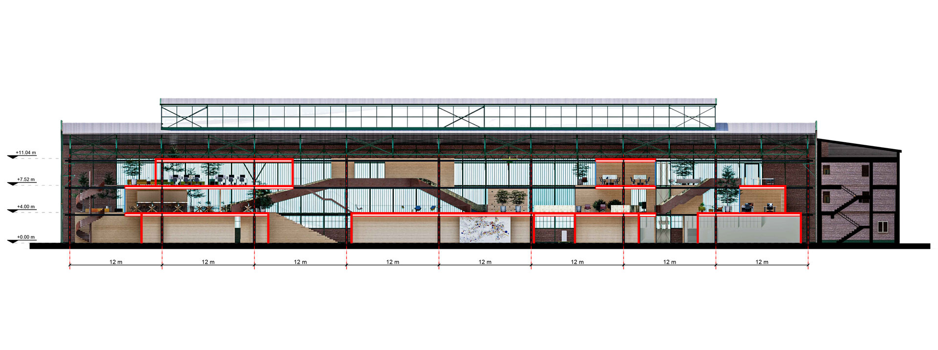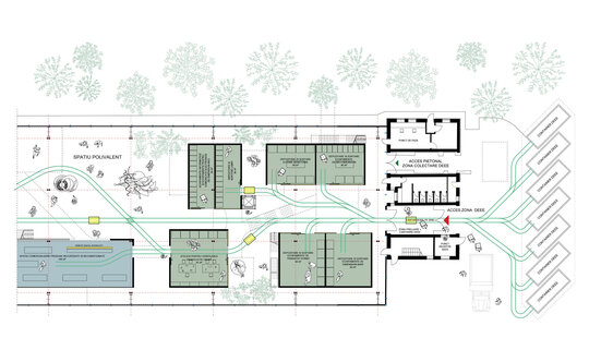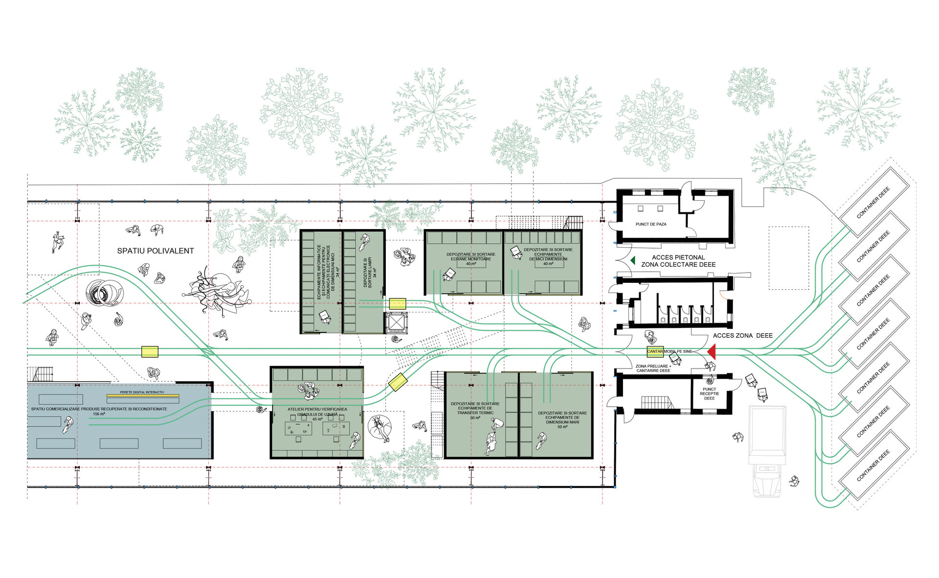 Spațiile centrului de colectare DEEE sunt situate la parter, în partea de sud-est a halei, în apropierea zonei administrative și au fost proiectate astfel încât să existe o tranziție clară de la zona de colectare a deșeurilor, la sortare și depozitare, iar apoi la atelierul de verificare a gradului de uzură, pentru ca ulterior acestea să poată fi valorificate fie în atelierele de creație artistică, fie în spațiul multifuncțional situat în mijlocul halei. Circulația pieselor DEEE se face cu ajutorul unor șine care traversează spațiul, facilitând funcționarea centrului. La etaje se află diverse spații educaționale/de formare, spații de coworking, o cafenea și un muzeu al Halei Minda. Mai sunt programate și locuințe temporare, de tip studio, pentru instructori și/sau artiști invitați. Cafeneaua comunică cu spațiul multifuncțional prin intermediul unor gradene. Podul rulant susține lucrări de artă create în interiorul halei.