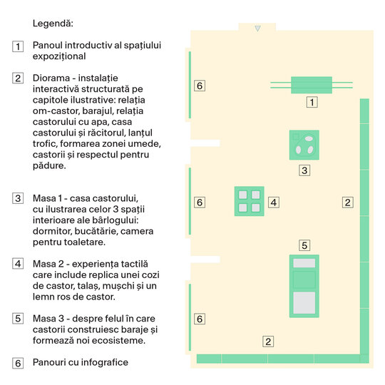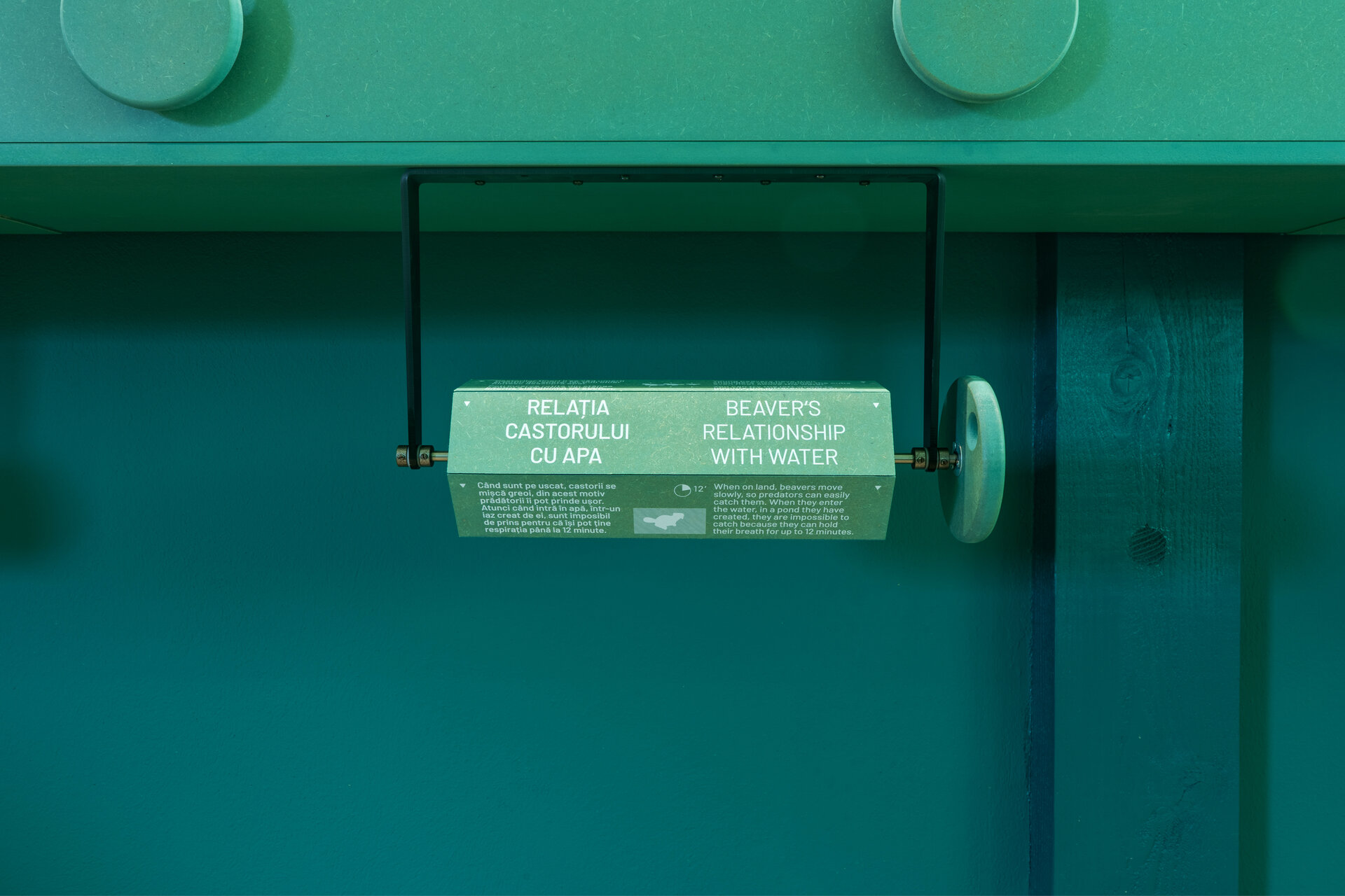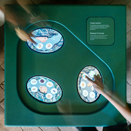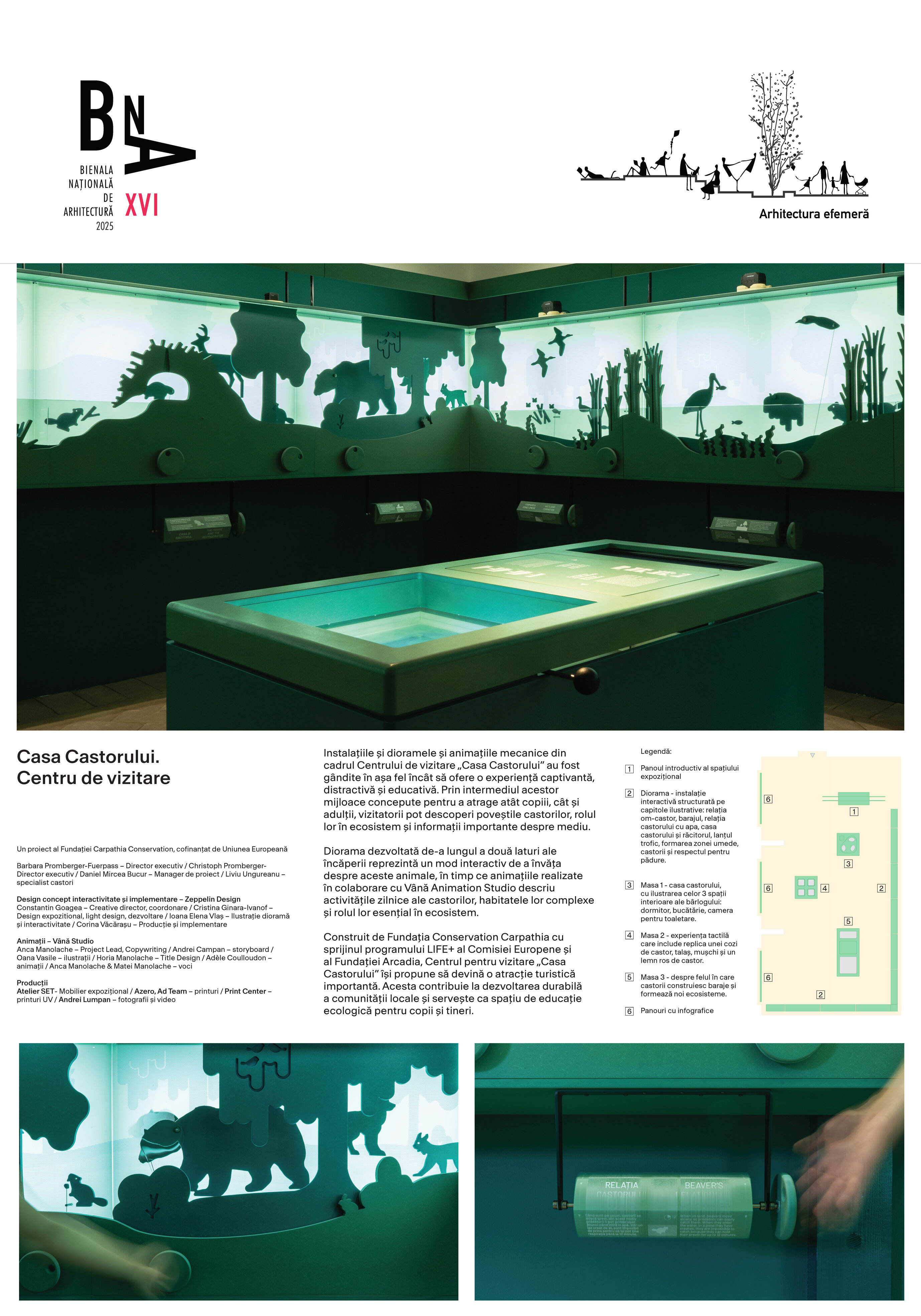 Diorama dezvoltată de-a lungul a două laturi ale încăperii reprezintă un mod interactiv de a învăța despre aceste animale, în timp ce animațiile realizate în colaborare cu Vână Animation Studio descriu activitățile zilnice ale castorilor, habitatele lor complexe și rolul lor esențial în ecosistem.