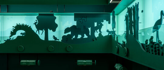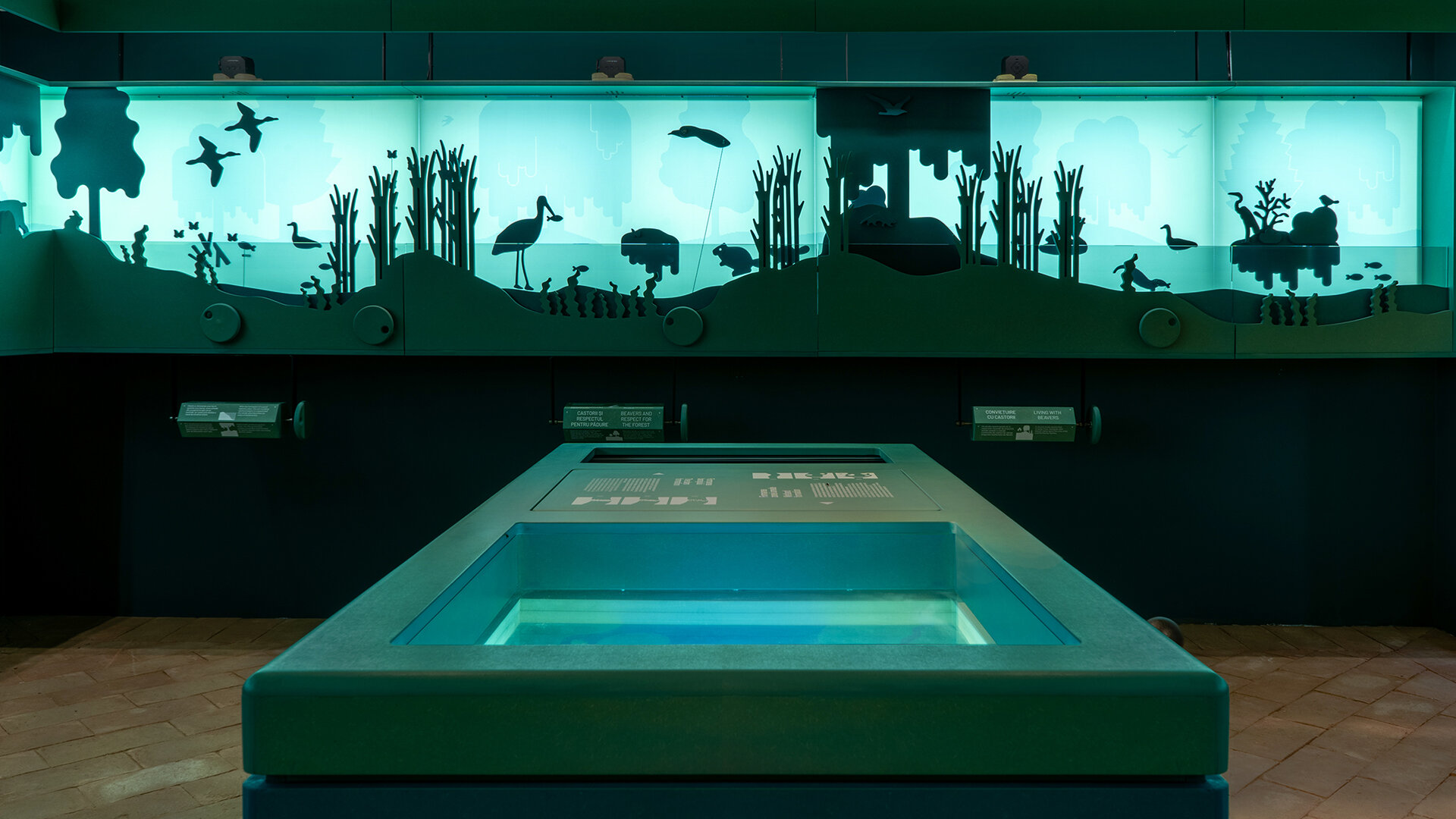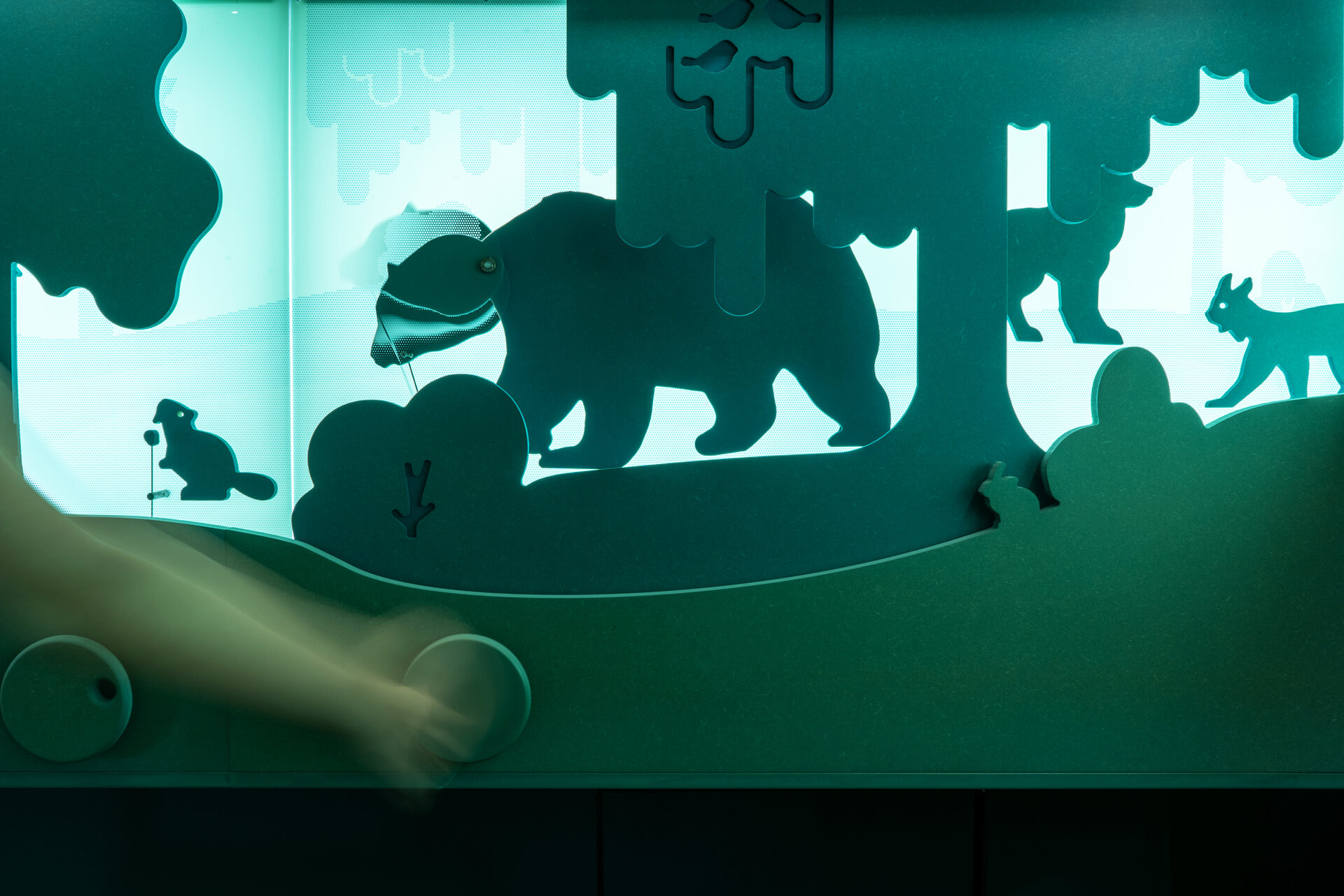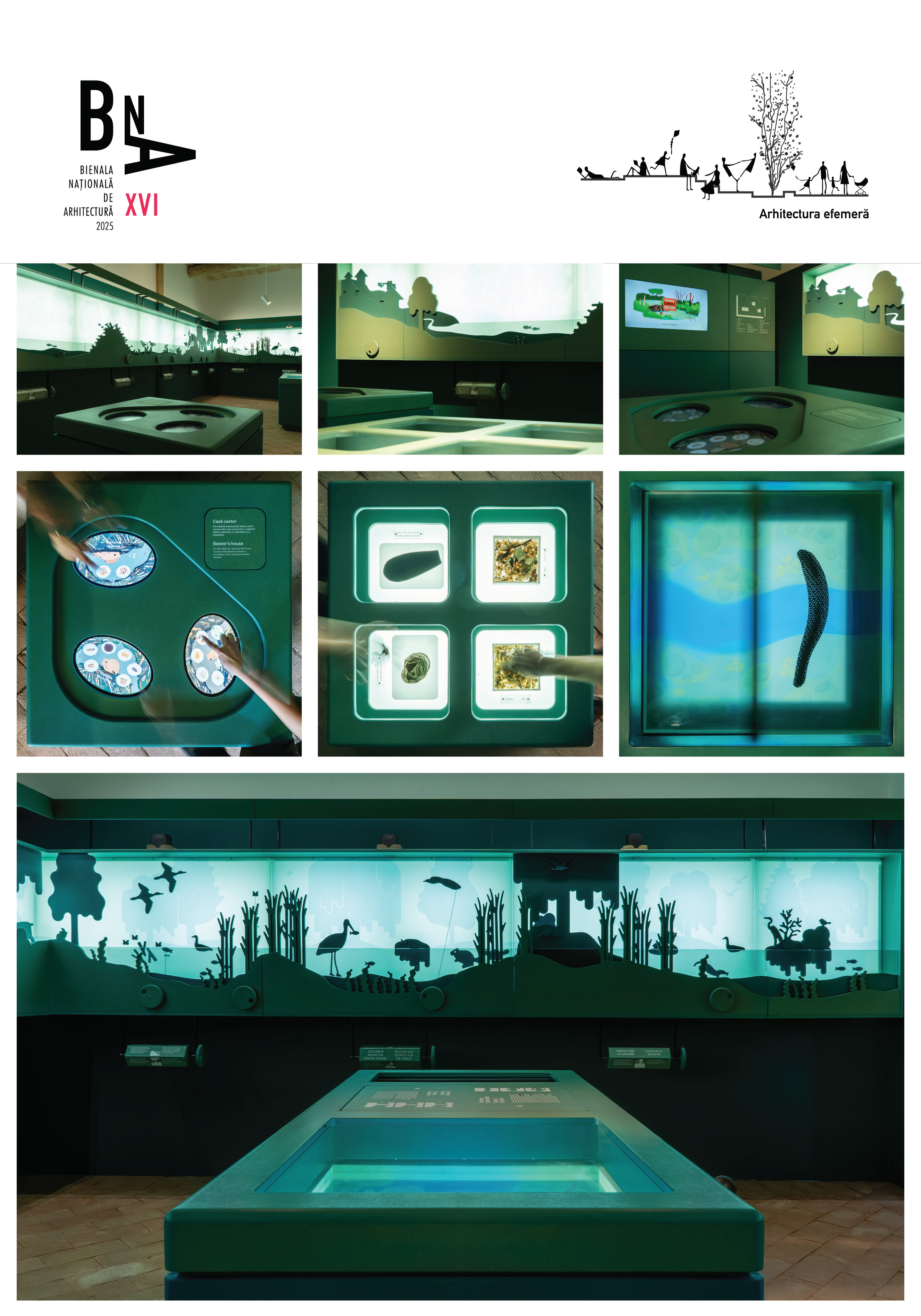 Diorama dezvoltată de-a lungul a două laturi ale încăperii reprezintă un mod interactiv de a învăța despre aceste animale, în timp ce animațiile realizate în colaborare cu Vână Animation Studio descriu activitățile zilnice ale castorilor, habitatele lor complexe și rolul lor esențial în ecosistem.