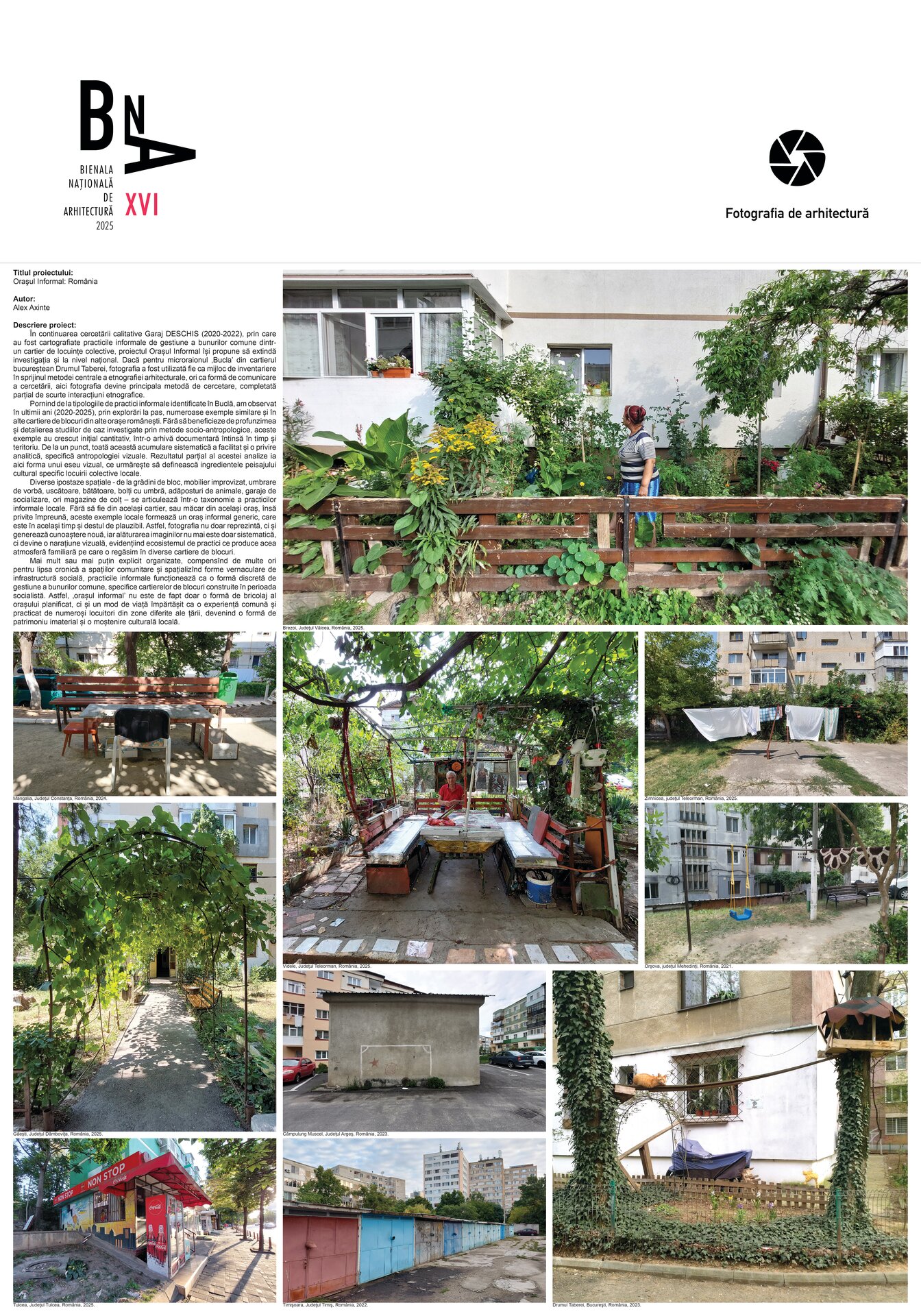 În continuarea cercetării calitative Garaj DESCHIS (2020-2022), prin care au fost cartografiate practicile informale de gestiune a bunurilor comune dintr-un cartier de locuințe colective, proiectul Orașul Informal își propune să extindă investigația și la nivel național. Dacă pentru microraionul ‚Bucla’ din cartierul bucureștean Drumul Taberei, fotografia a fost utilizată fie ca mijloc de inventariere în sprijinul metodei centrale a etnografiei arhitecturale, ori ca formă de comunicare a cercetării, aici fotografia devine principala metodă de cercetare, completată parțial de scurte interacțiuni etnografice.