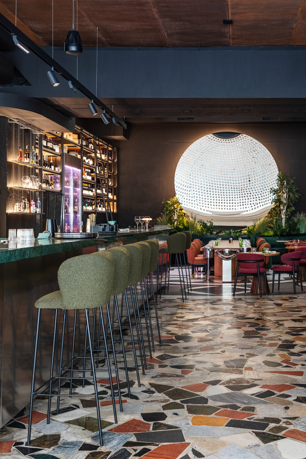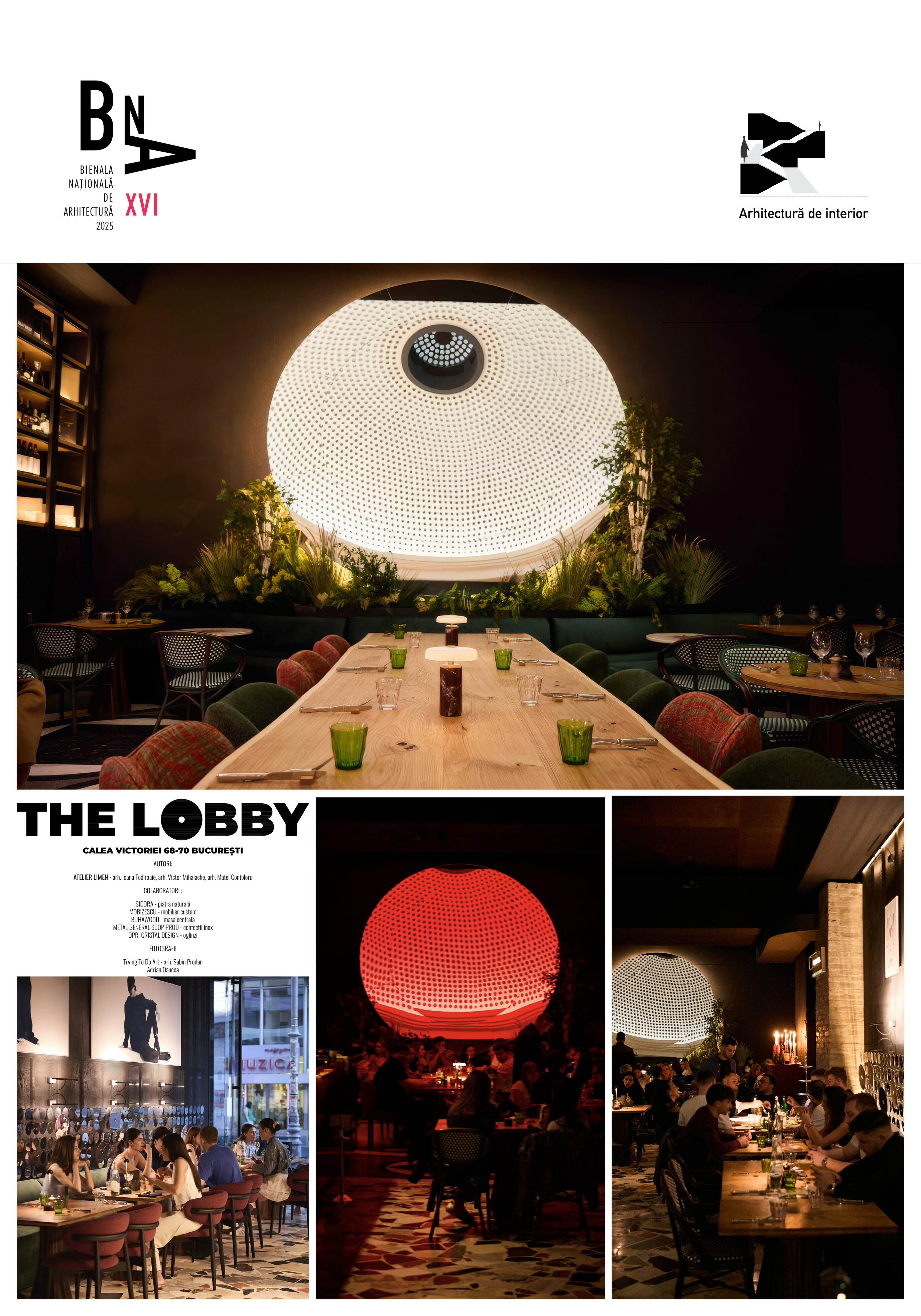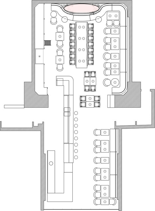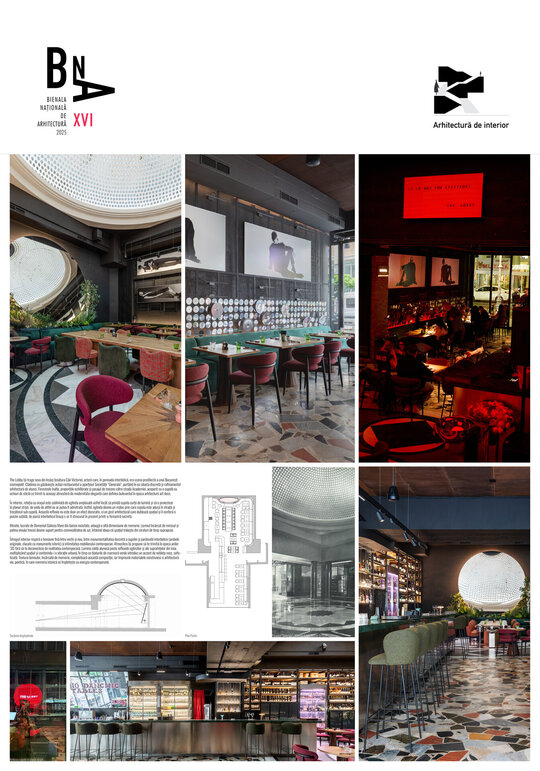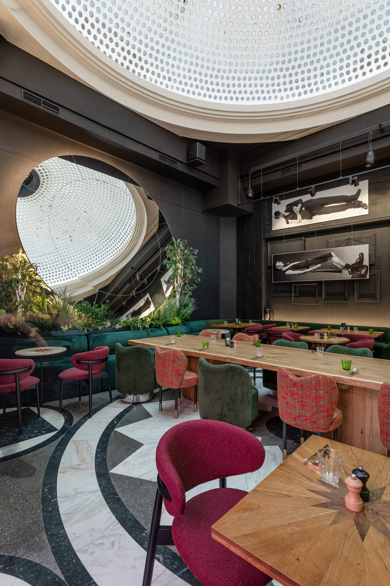 Întregul interior respiră o tensiune fină între vechi și nou, între monumentalitatea discretă a cupolei și pardoselii interbelice (ambele originale, clasate ca monumente istoric) și intimitatea mobilierului contemporan. Atmosfera își propune să te trimită în epoca anilor ‘30 fără să te deconecteze de realitatea contemporană. Lumina caldă alunecă peste reflexele oglinzilor și ale suprafețelor din inox, multiplicând spațiul și conferindu-i o vibrație urbană, în timp ce blaturile de marmură verde introduc un accent de noblețe rece, sofisticată. Textura lemnului, încărcată de memorie, completează această compoziție, iar împreună materialele construiesc o arhitectură vie, poetică, în care memoria istorică se împletește cu energia contemporană.