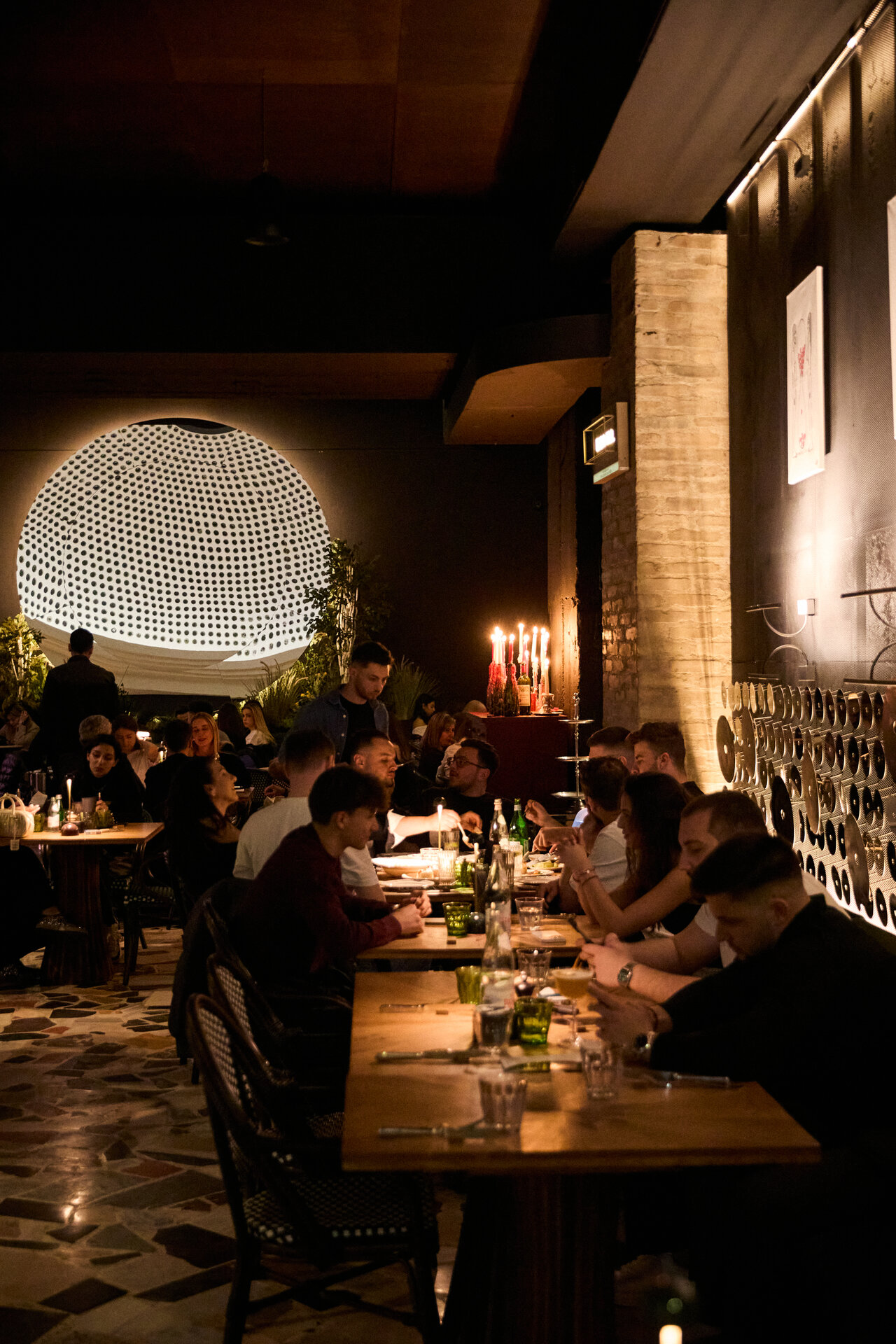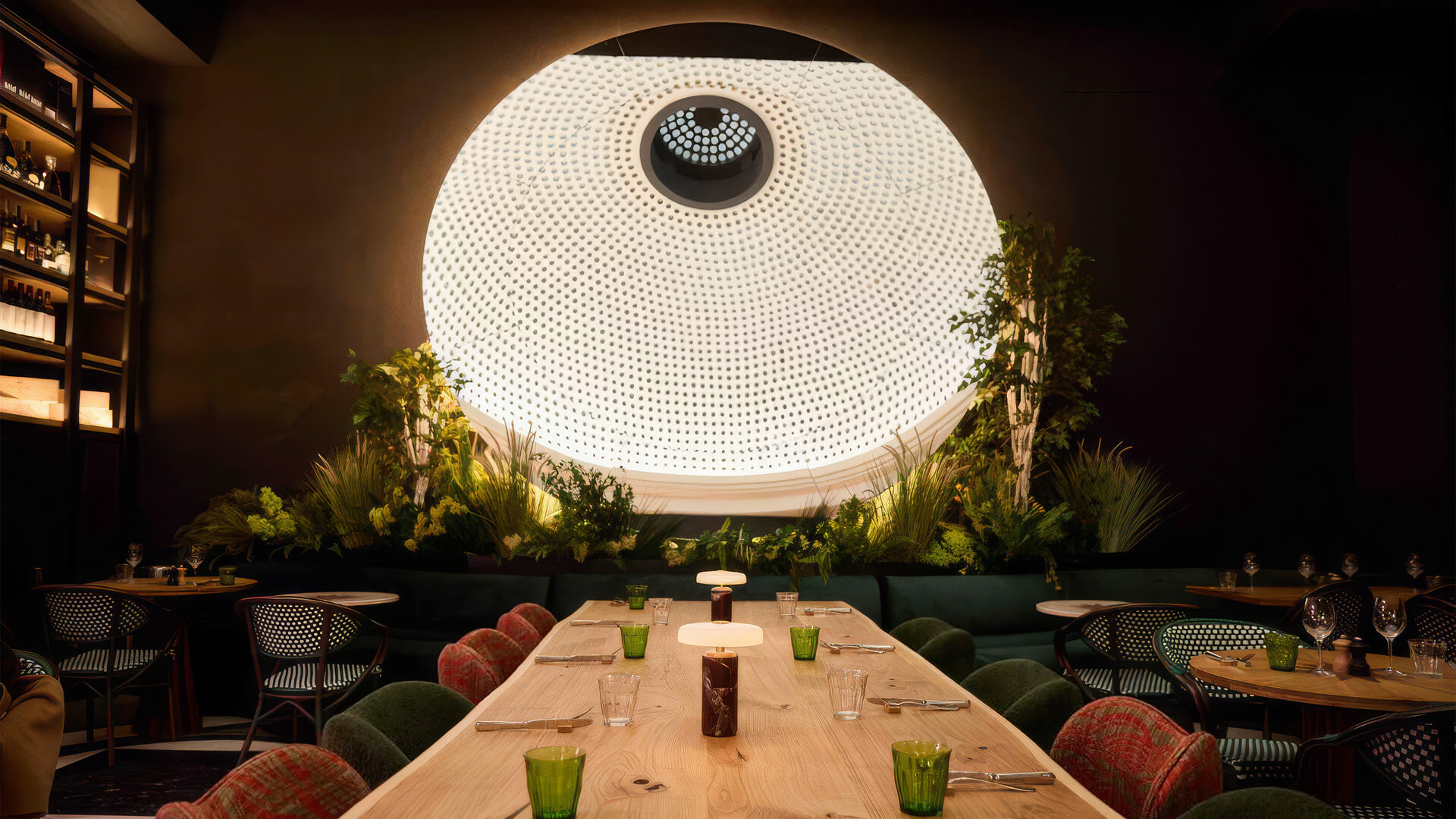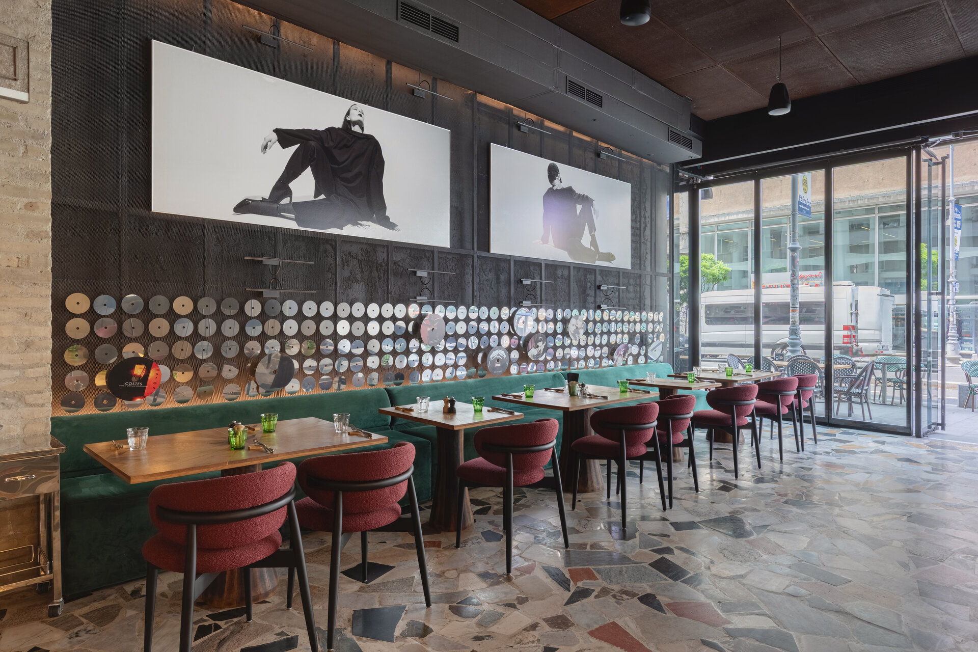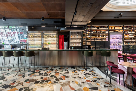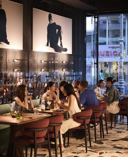 Întregul interior respiră o tensiune fină între vechi și nou, între monumentalitatea discretă a cupolei și pardoselii interbelice (ambele originale, clasate ca monumente istoric) și intimitatea mobilierului contemporan. Atmosfera își propune să te trimită în epoca anilor ‘30 fără să te deconecteze de realitatea contemporană. Lumina caldă alunecă peste reflexele oglinzilor și ale suprafețelor din inox, multiplicând spațiul și conferindu-i o vibrație urbană, în timp ce blaturile de marmură verde introduc un accent de noblețe rece, sofisticată. Textura lemnului, încărcată de memorie, completează această compoziție, iar împreună materialele construiesc o arhitectură vie, poetică, în care memoria istorică se împletește cu energia contemporană.