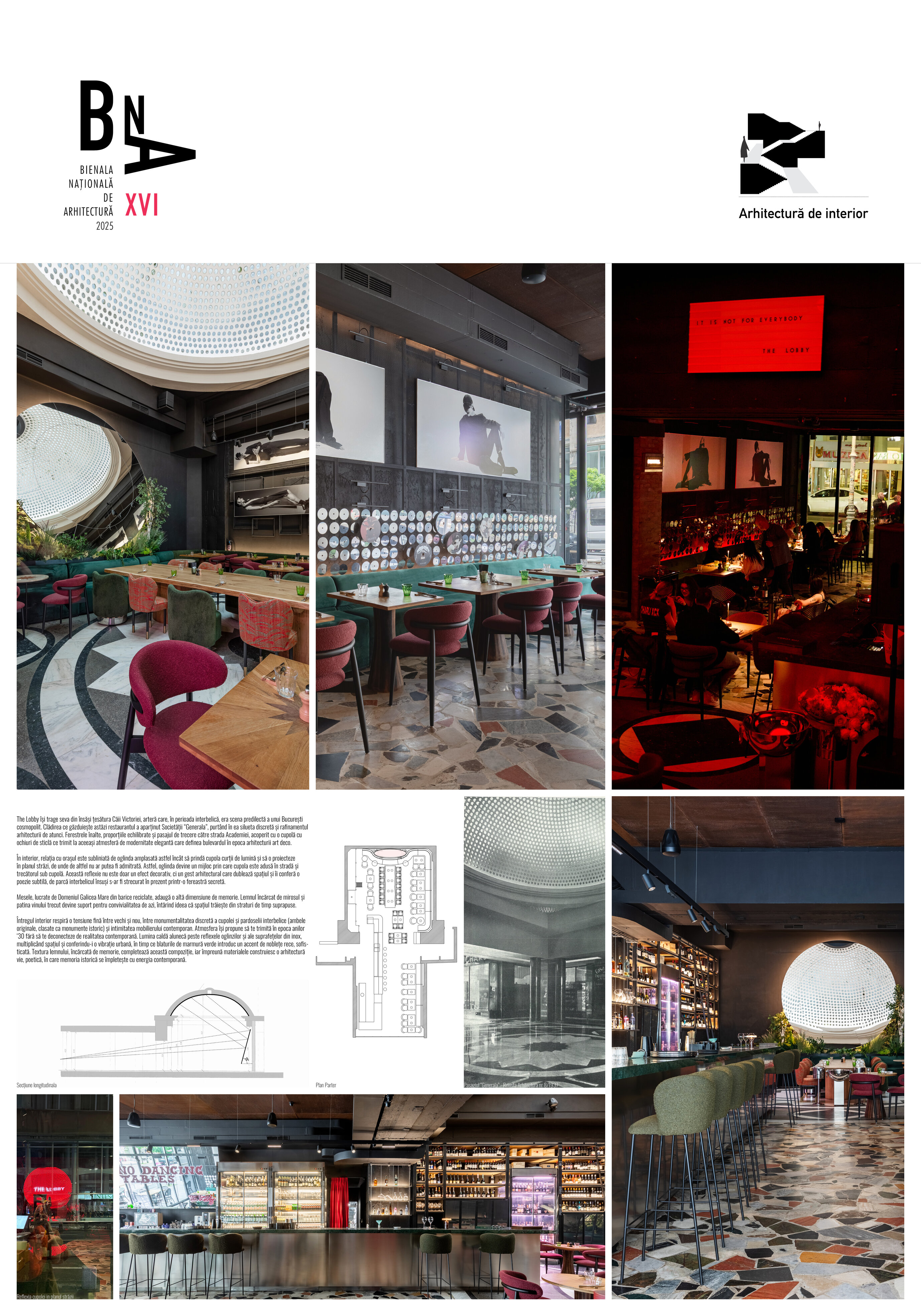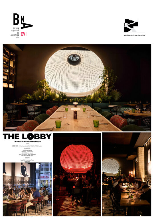 The Lobby își trage seva din însăși țesătura Căii Victoriei, arteră care, în perioada interbelică, era scena predilectă a unui București cosmopolit. Clădirea ce găzduiește astăzi restaurantul a aparținut Societății “Generala”, purtând în ea silueta discretă și rafinamentul arhitecturii de atunci. Ferestrele înalte, proporțiile echilibrate și pasajul de trecere către strada Academiei, acoperit cu o cupolă cu ochiuri de sticlă ce trimit la aceeași atmosferă de modernitate elegantă care definea bulevardul în epoca arhitecturii art deco.