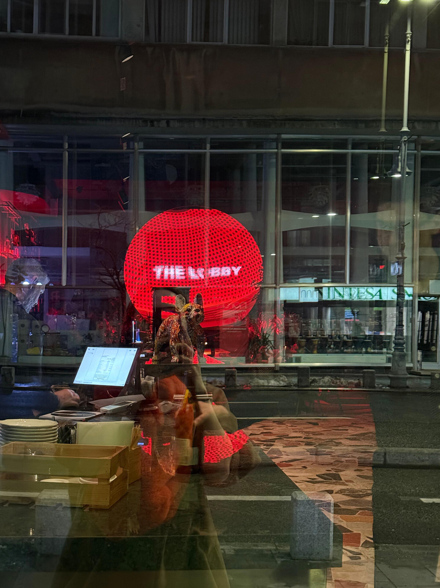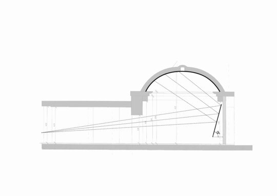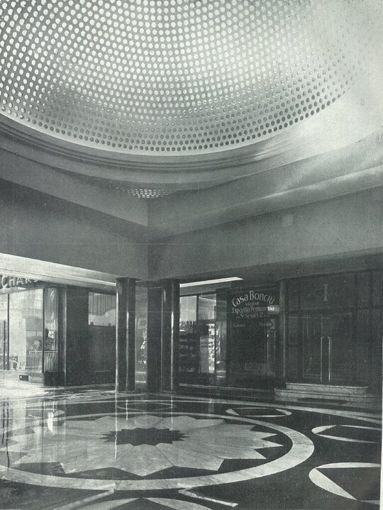 În interior, relația cu orașul este subliniată de oglinda amplasată astfel încât să prindă cupola curții de lumină și să o proiecteze în planul străzi, de unde de altfel nu ar putea fi admitrată. Astfel, oglinda devine un mijloc prin care cupola este adusă în stradă și trecătorul sub cupolă. Această reflexie nu este doar un efect decorativ, ci un gest arhitectural care dublează spațiul și îi conferă o poezie subtilă, de parcă interbelicul însuși s-ar fi strecurat în prezent printr-o fereastră secretă.