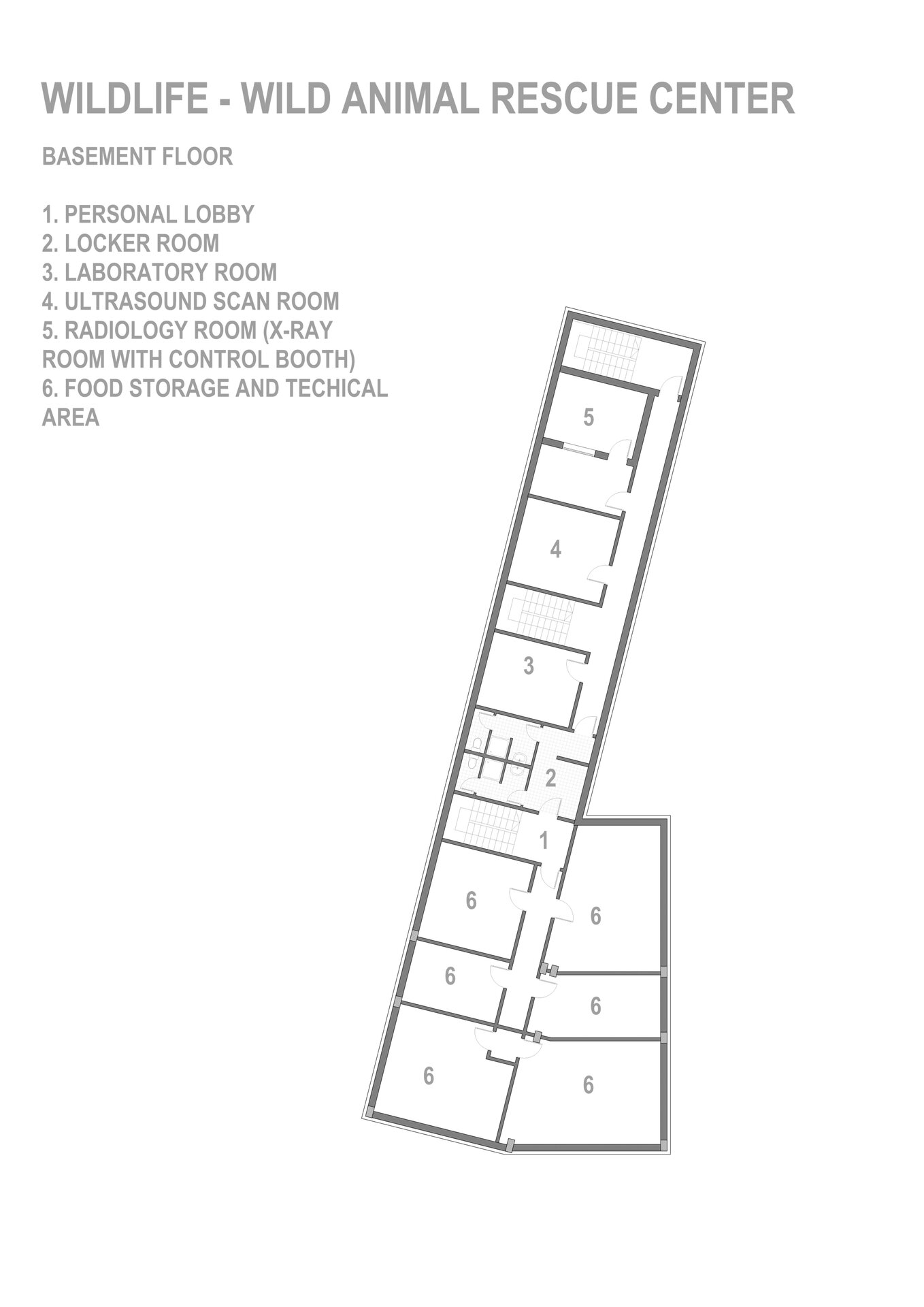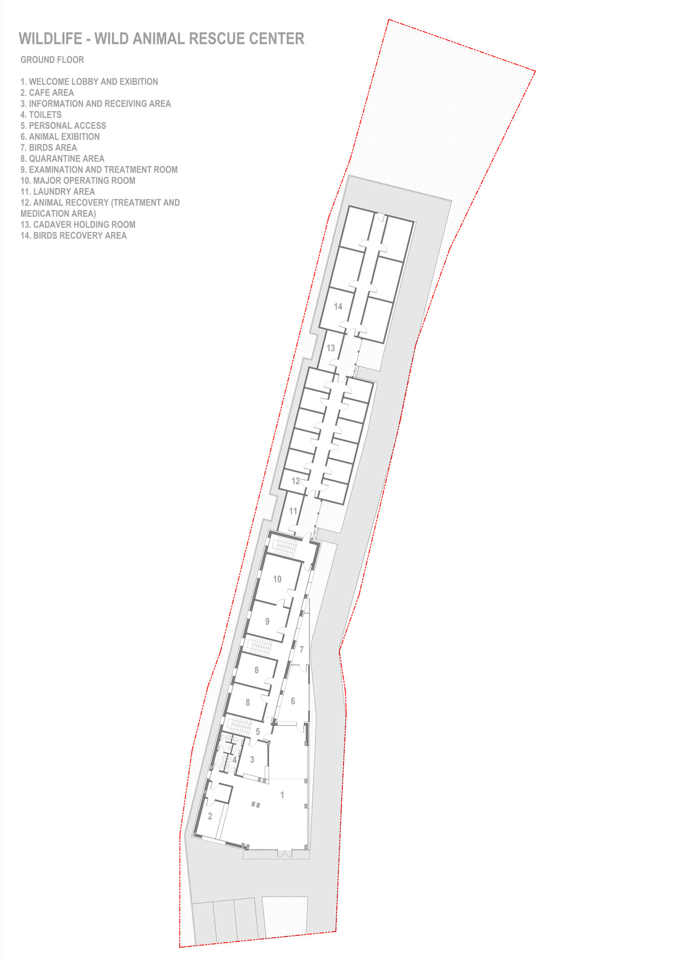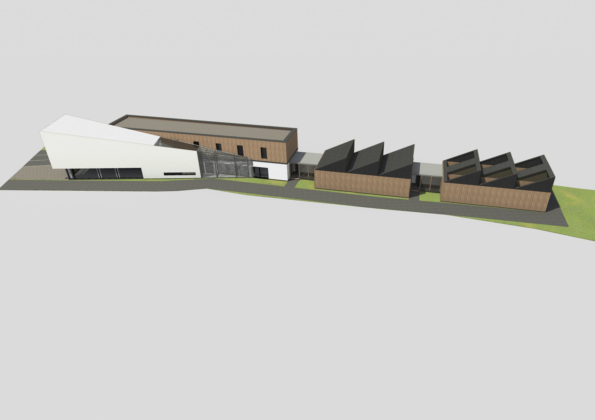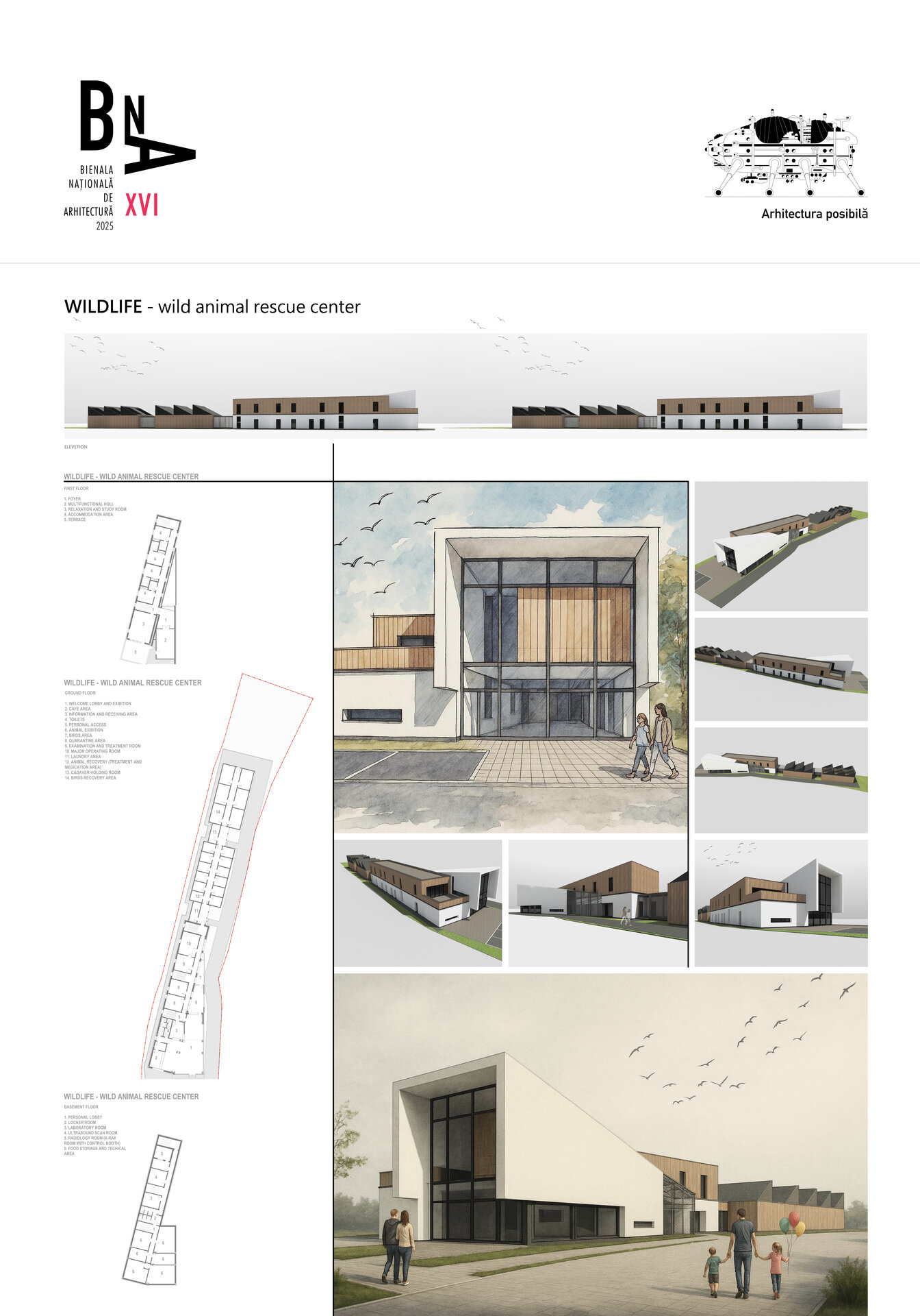 Pentru a îmbina zonele de funcțiuni publice destinate vizitatorilor centrului și zonele private de tratare și cercetare destinate animalelor sălbatice am grupat volumul arhitectural astfel: