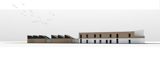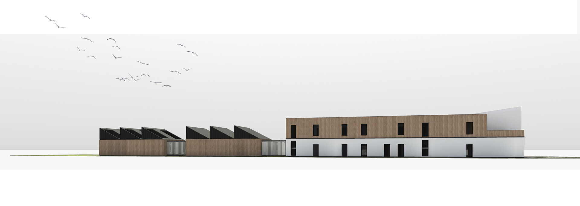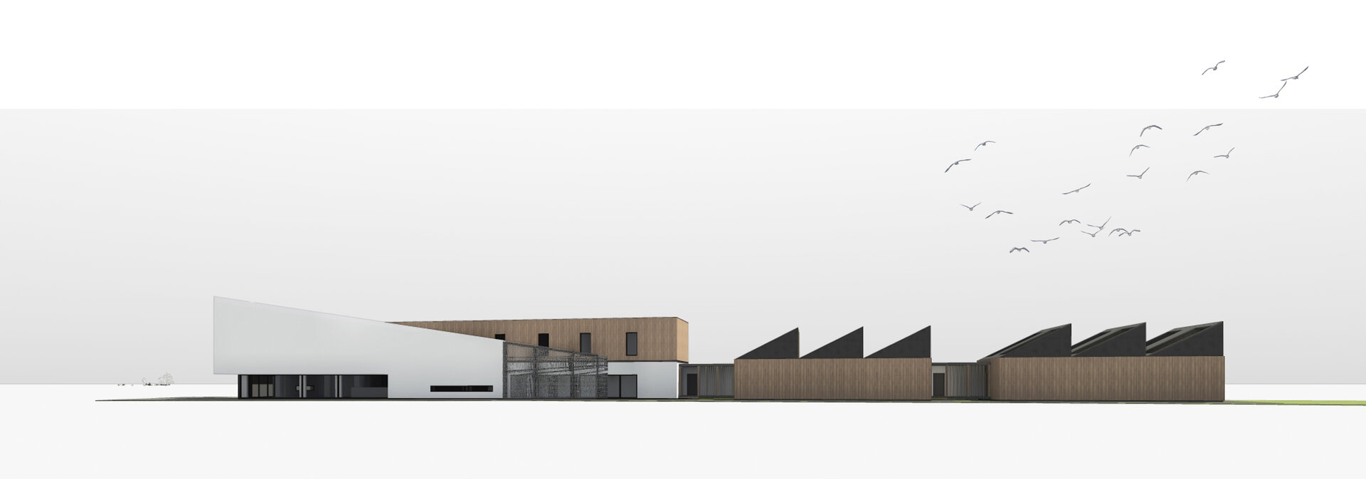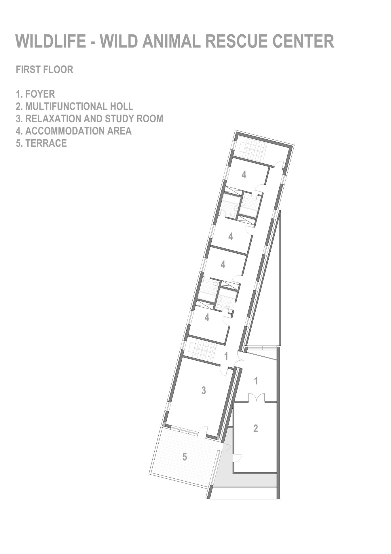 Pentru a îmbina zonele de funcțiuni publice destinate vizitatorilor centrului și zonele private de tratare și cercetare destinate animalelor sălbatice am grupat volumul arhitectural astfel:
