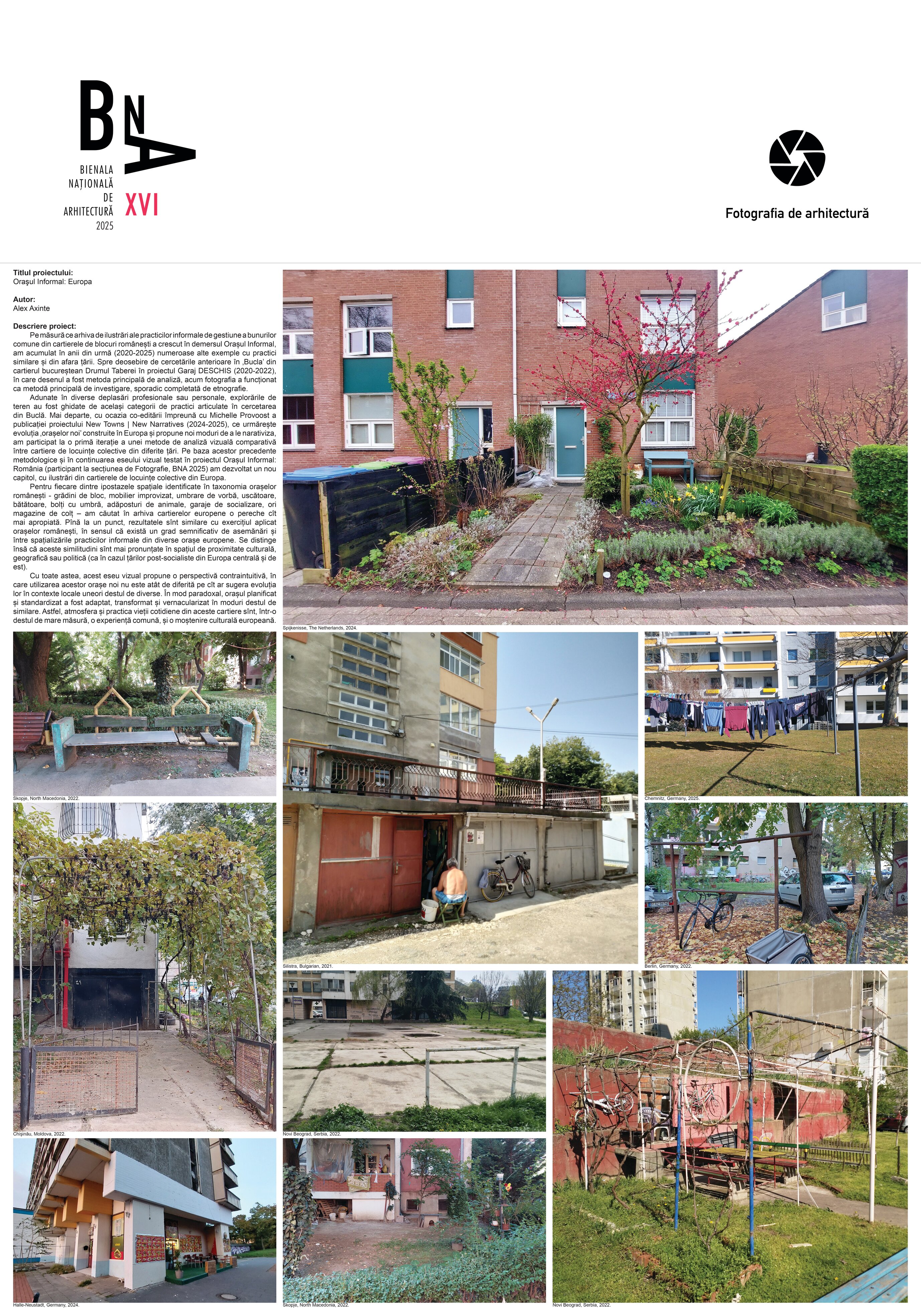 Adunate în diverse deplasări profesionale sau personale, explorările de teren au fost ghidate de același categorii de practici articulate în cercetarea din Buclă. Mai departe, cu ocazia co-editării împreună cu Michelle Provoost a publicației proiectului New Towns | New Narratives (2024-2025), ce urmărește evoluția ‚orașelor noi’ construite în Europa și propune noi moduri de a le narativiza, am participat la o primă iterație a unei metode de analiză vizuală comparativă între cartiere de locuințe colective din diferite țări. Pe baza acestor precedente metodologice și în continuarea eseului vizual testat în proiectul Orașul Informal: România (participant la secțiunea de Fotografie, BNA 2025) am dezvoltat un nou capitol, cu ilustrări din cartierele de locuințe colective din Europa.