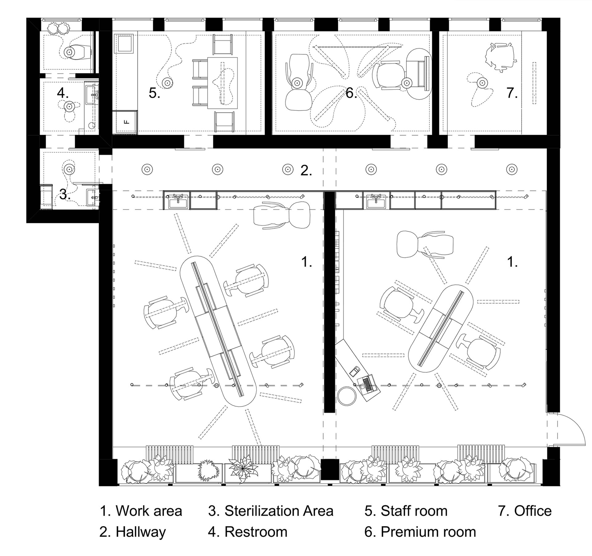 Punând accent pe activitatea propriu-zisă, designul interior a fost conceput într-un mod unic, în care zona de lucru este dispusă central, subliniind măiestria artistică a bărbierilor.