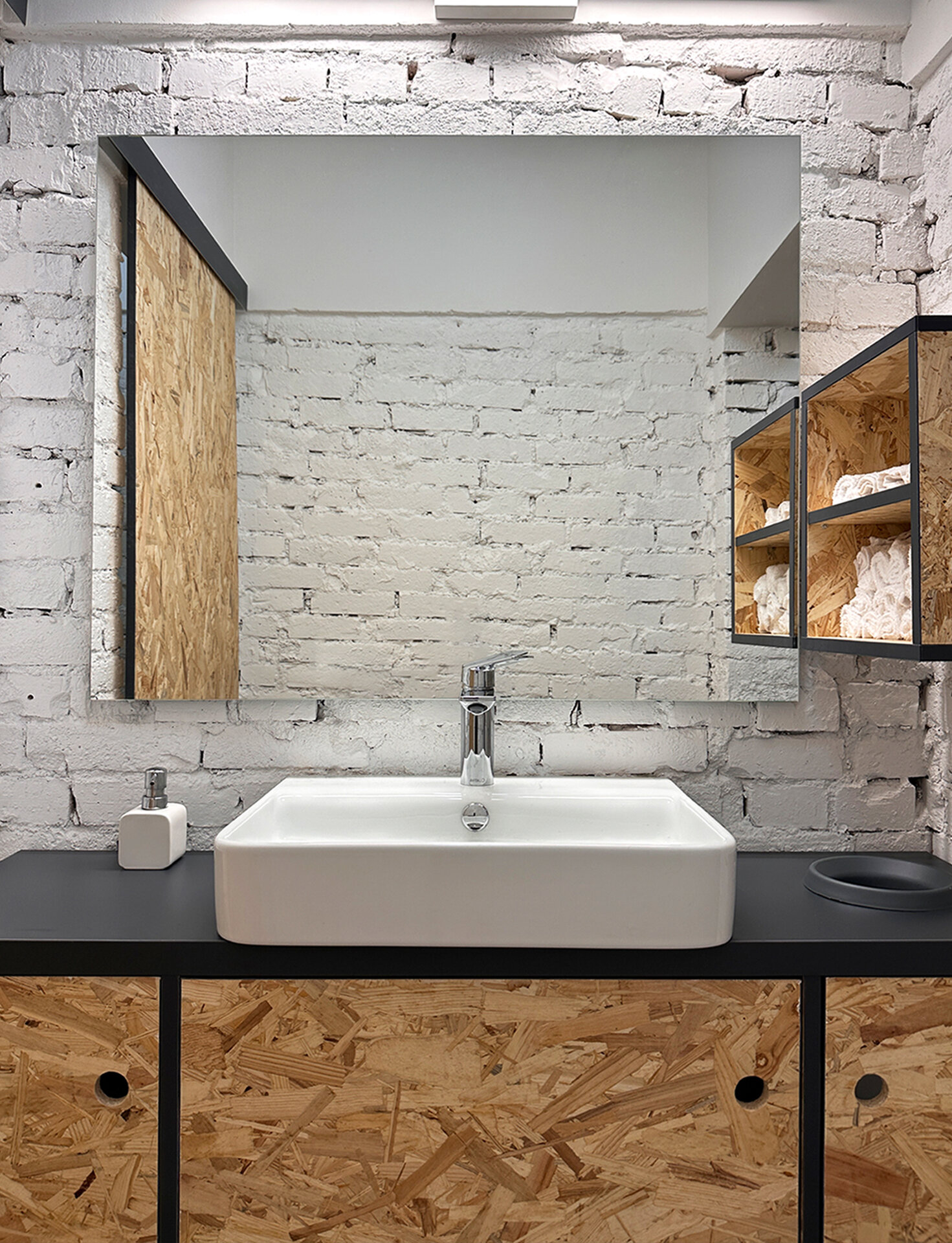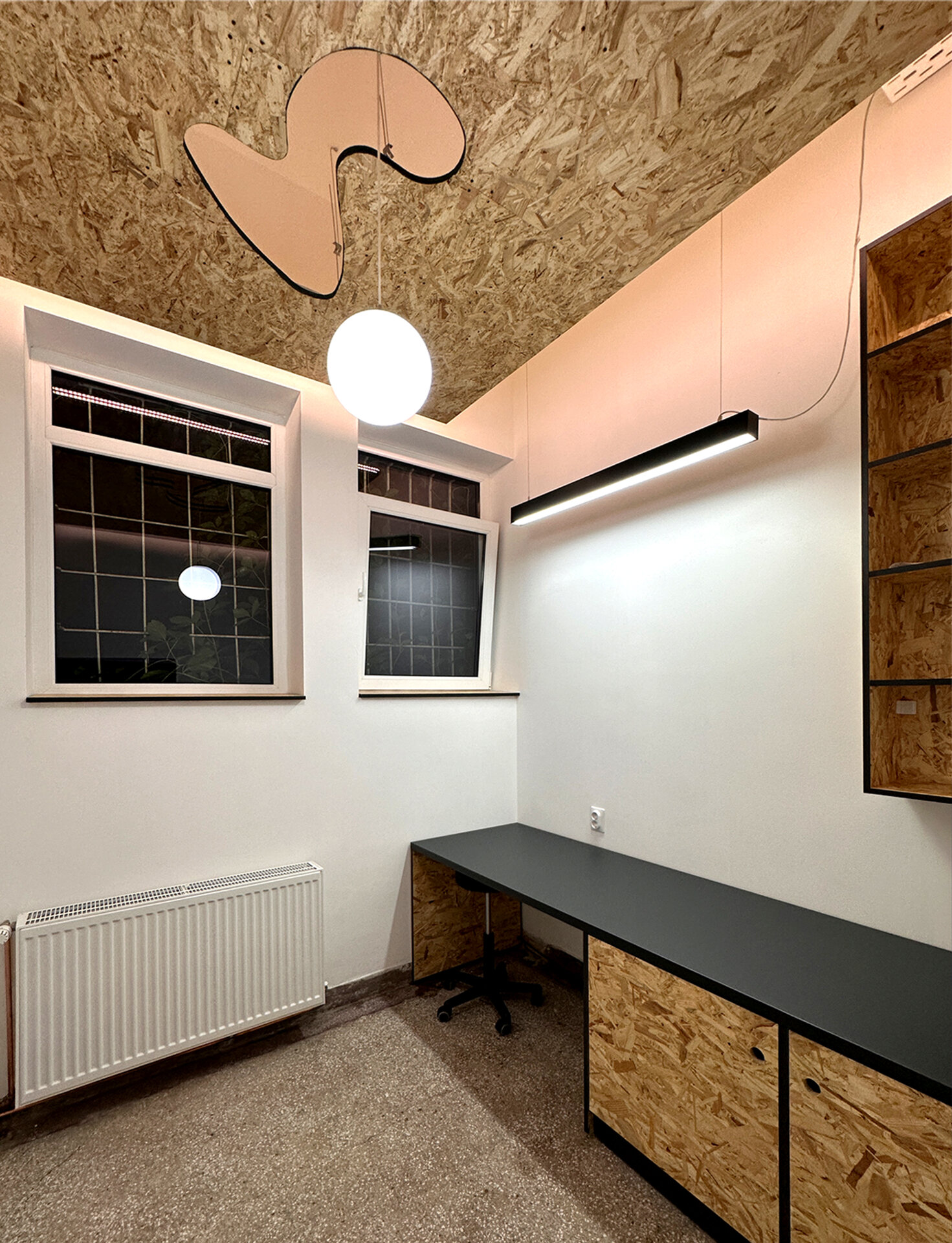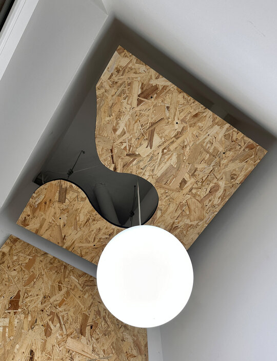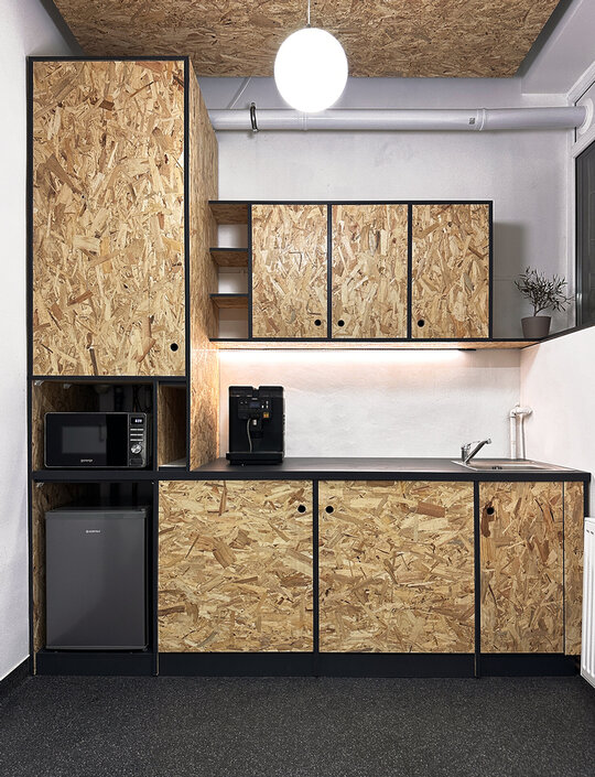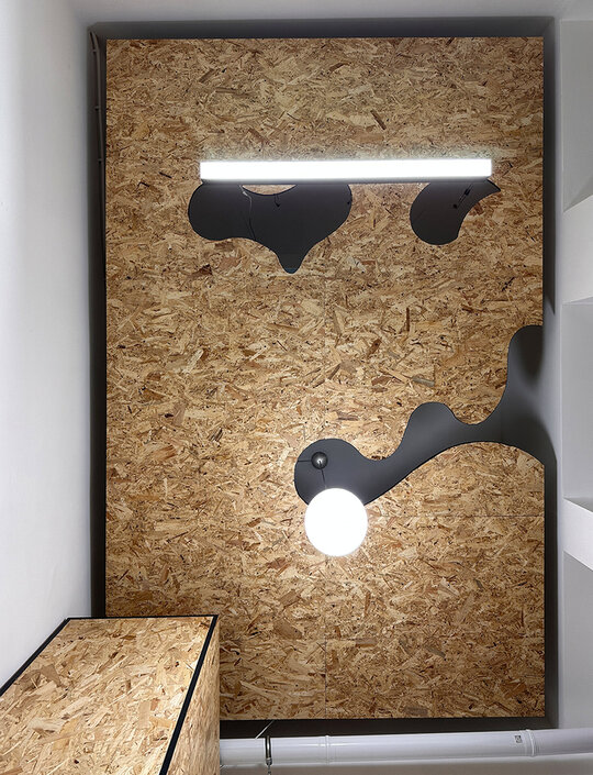 Zona „din culise” este gândită strict din punct de vedere funcțional, folosind materiale simple, dar rezistente, precum OSB, care reușește totodată să aducă un plus de căldură spațiului.