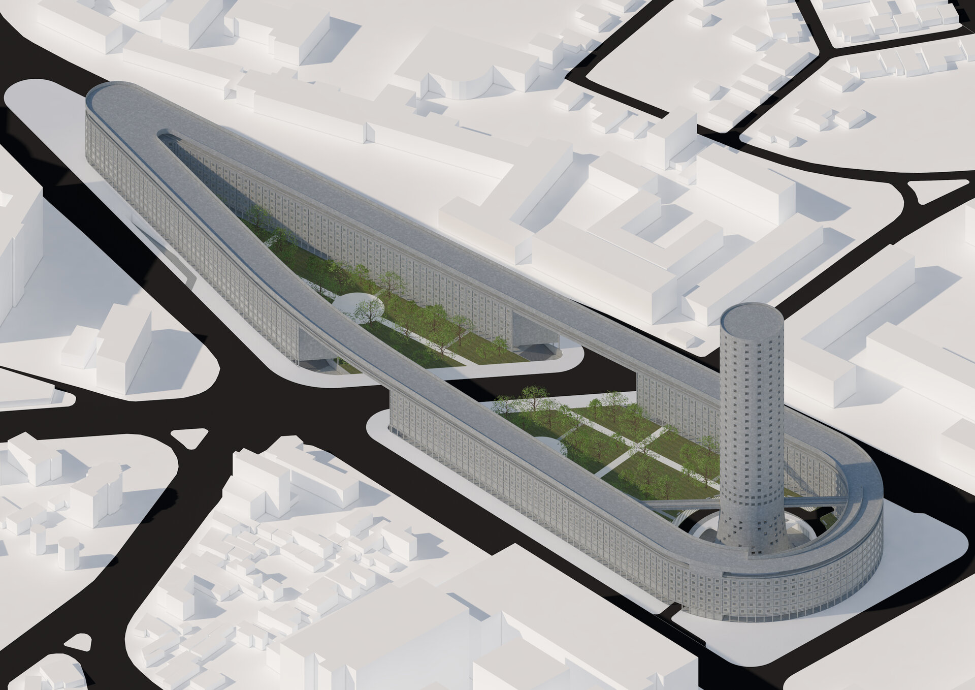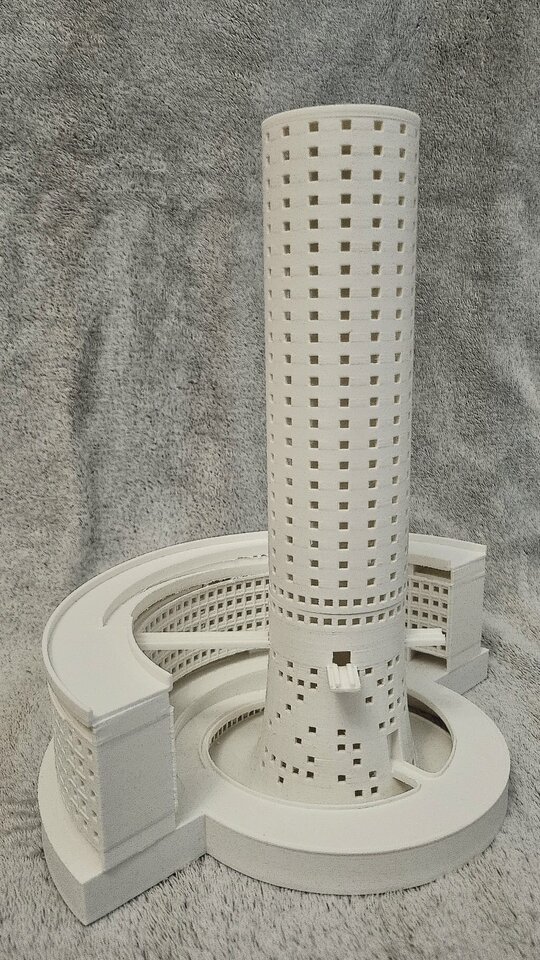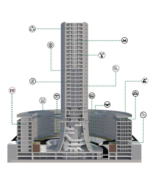 Din punct de vedere al arhitecturii, întreaga propunere este realizată în spirit brutalist, într-o manieră utopică ce se regăsește atât la nivelul programului, cât și la nivelul abordării arhitecturale. Betonul aparent și structura vizibilă dau o stabilitate atât vizuală, simbolică, dar și fizică în cadrul țesutului urban, delimitând și protejând în același timp vegetația concentrată sub forma unei insule verzi, din care își face apariția turnul ca punct de reper al zonei și capăt de perspectivă prin alinierea sa pe axul Academiei Militare. Totodată, ansamblul – în special perimetrul rezidențial creat – capătă caracterul de zonă de tranziție, de poartă dintre centrul capitalei și orașul dincolo de cercul median, acest aspect fiind determinat de pătrunderea tramei stradale prin propunere.