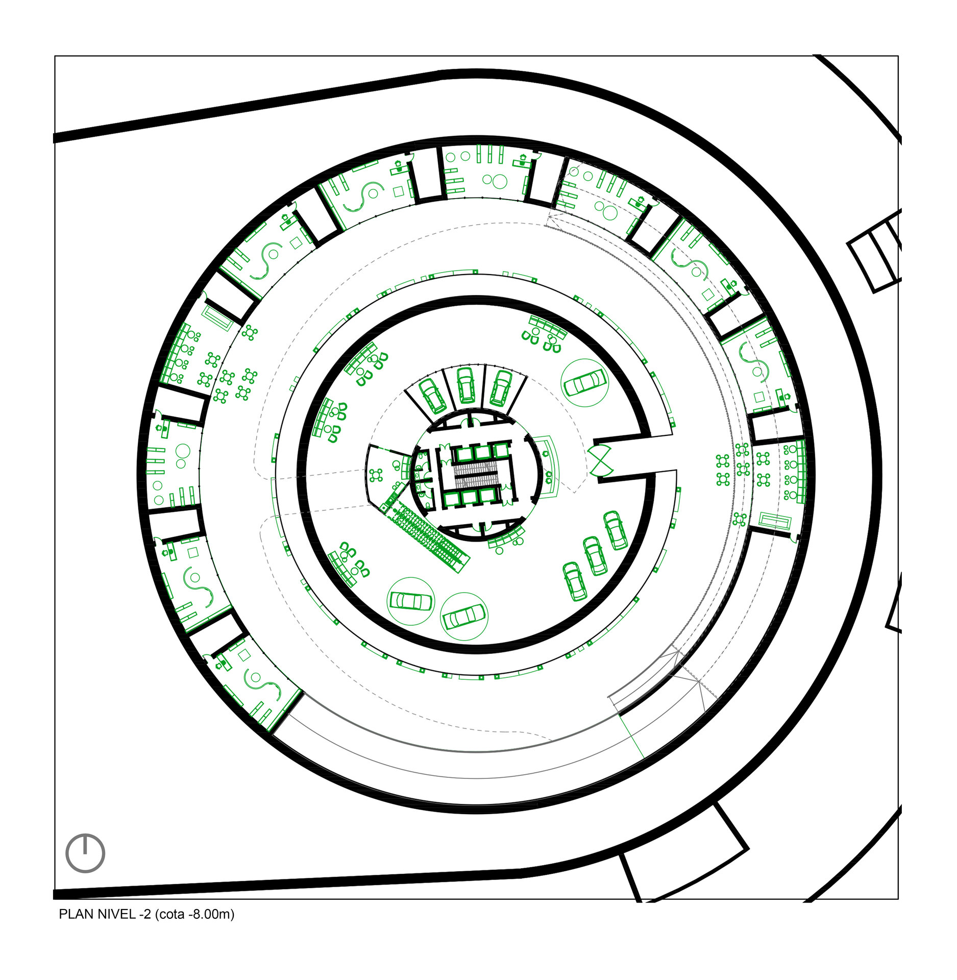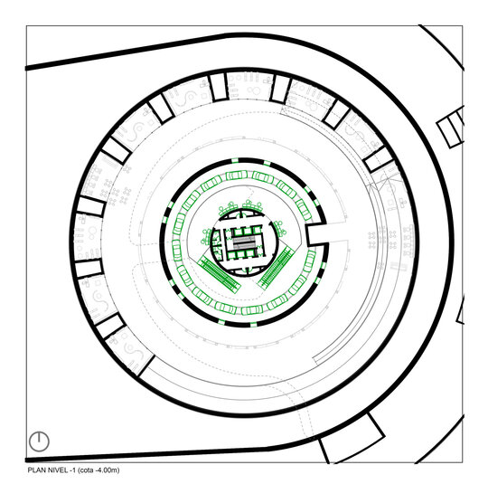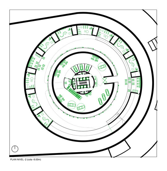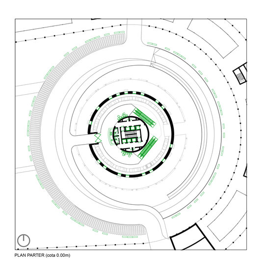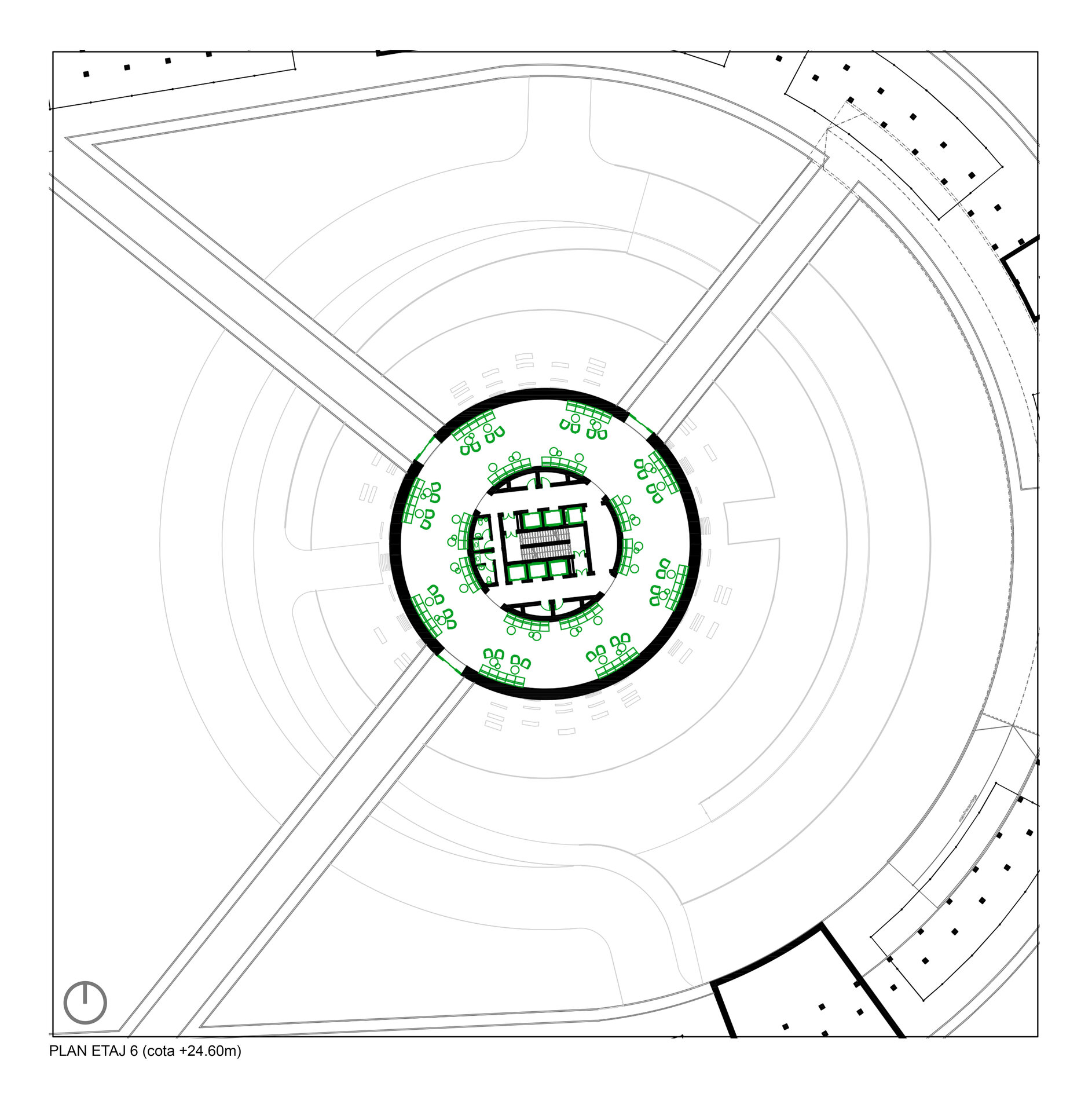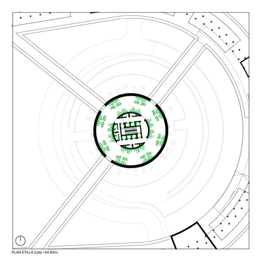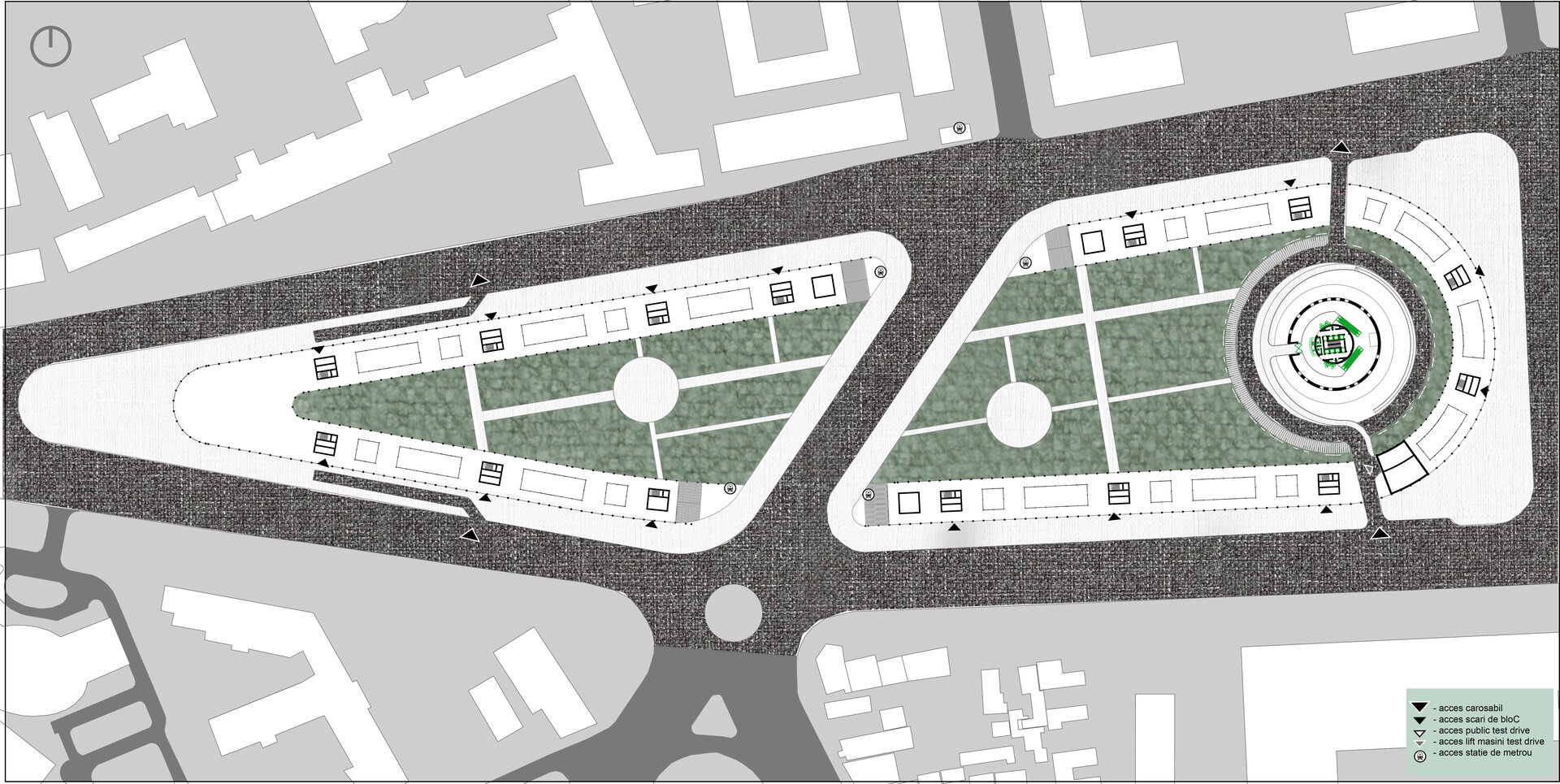 Cu toate acestea, în ciuda aparenței masive, ansamblul este gândit să fie permeabil atât carosabil – prin introducerea unei căi de acces care să facă legătura directă dintre arterele principale de circulație, turn și curtea interioară de la nivelul -2, ce relaționează strâns cu spațiul expozițional auto din interiorul de la baza turnului – cât și pietonal prin realizarea parterului părții rezidențiale sub forma unui portic, care nu doar că face tranziția între oraș și spațiul public aflat în incintă, dar și găzduiește o serie de magazine ce alcătuiesc un ansamblu de retail. Este de precizat că spațiile comerciale se regăsesc și la etajul 6 al ansamblului de locuințe colective, jucând rolul de nivel tampon între partea rezidențială și circuitul de test drive realizat pe acoperiș, de jur împrejurul propunerii. Astfel, prin acest etaj tampon se realizează legătura între clădirea perimetrală și turn, atât fizic prin pasarelele de legătură, dar și din punct de vedere funcțional prin relaționarea zonei publice de retail și de alimentație publică și a circuitului de test drive cu restaurantul amenajat în turn și spațiile de cercetare și design aflate în interiorul acestuia.