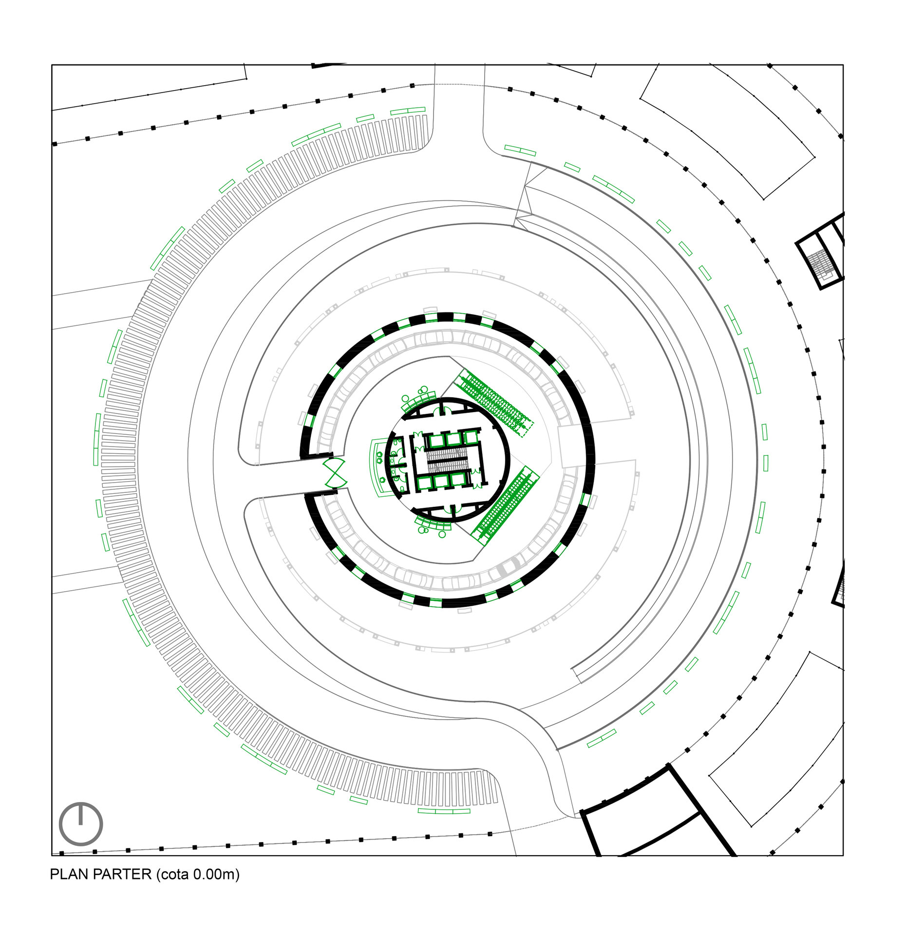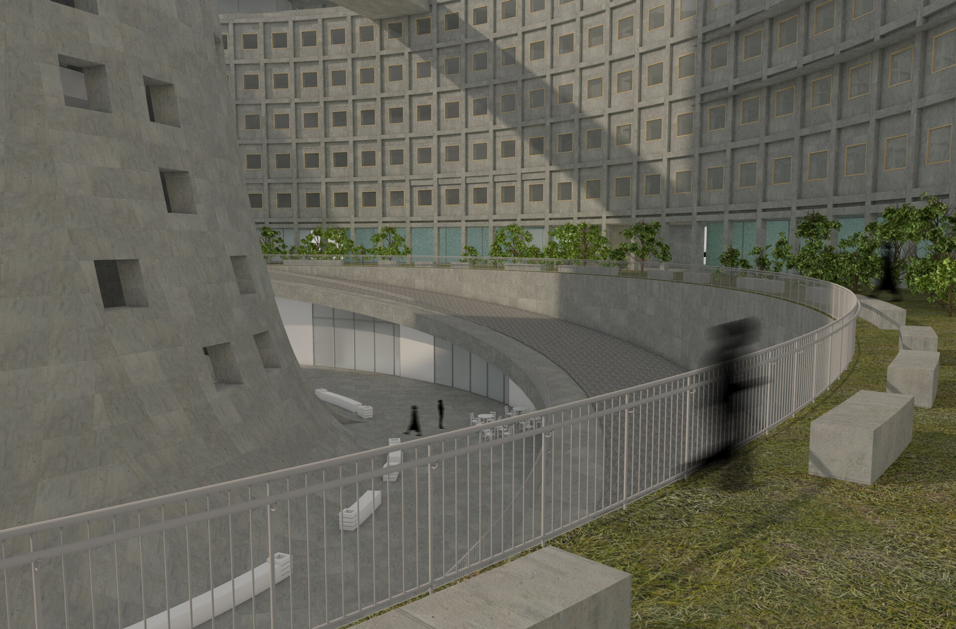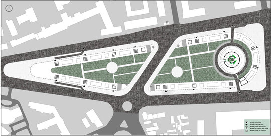Pentru extrovertirea ansamblului și deschiderea sa către restul orașului și către mai multe categorii de public, cea mai mare parte a suprafeței propunerii este ocupată de un spațiu public caracterizat de o vegetație bogată, împrejmuit de un ansamblu rezidențial de locuințe plurifamiliale, delimitat la parter și la etajul superior de zone de retail deschise publicului larg.