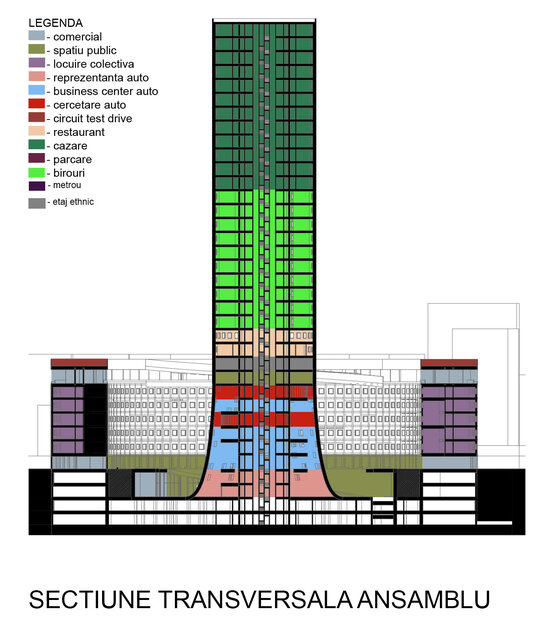 Având în vedere aceste aspecte, se propune îmbinarea și explorarea mai multor fațete ale industriei automobilelor, fiind integrate în ansamblu, în ordine după cum urmează: spațiu expozițional pentru automobile ce fac parte din producție locală românească, legat de spațiul public pentru a oferi deschidere către vizitatori; spații de birouri pentru relaționare cu publicul și centru de design; birouri și laboratoare de cercetare private, fără acces public. Complementar acestor funcțiuni sunt adăugate în cadrul aceleiași construcții spații dedicate alimentației publice și serviciilor hoteliere anexe centrului de business.