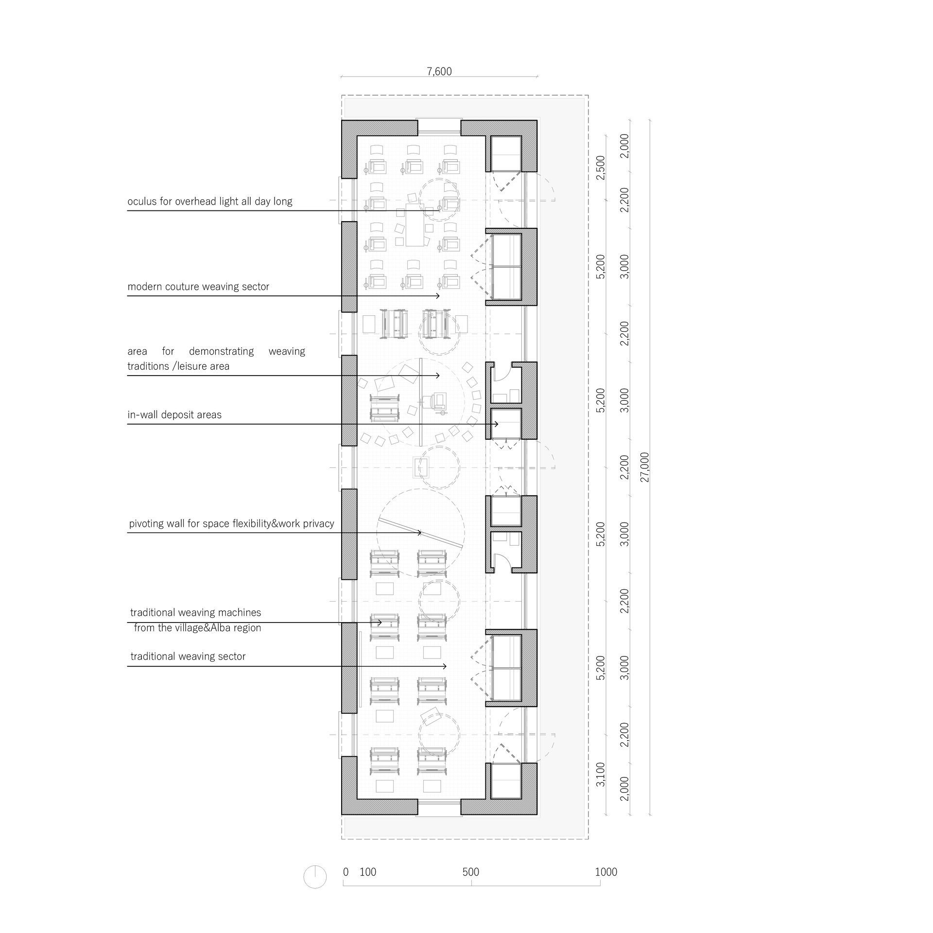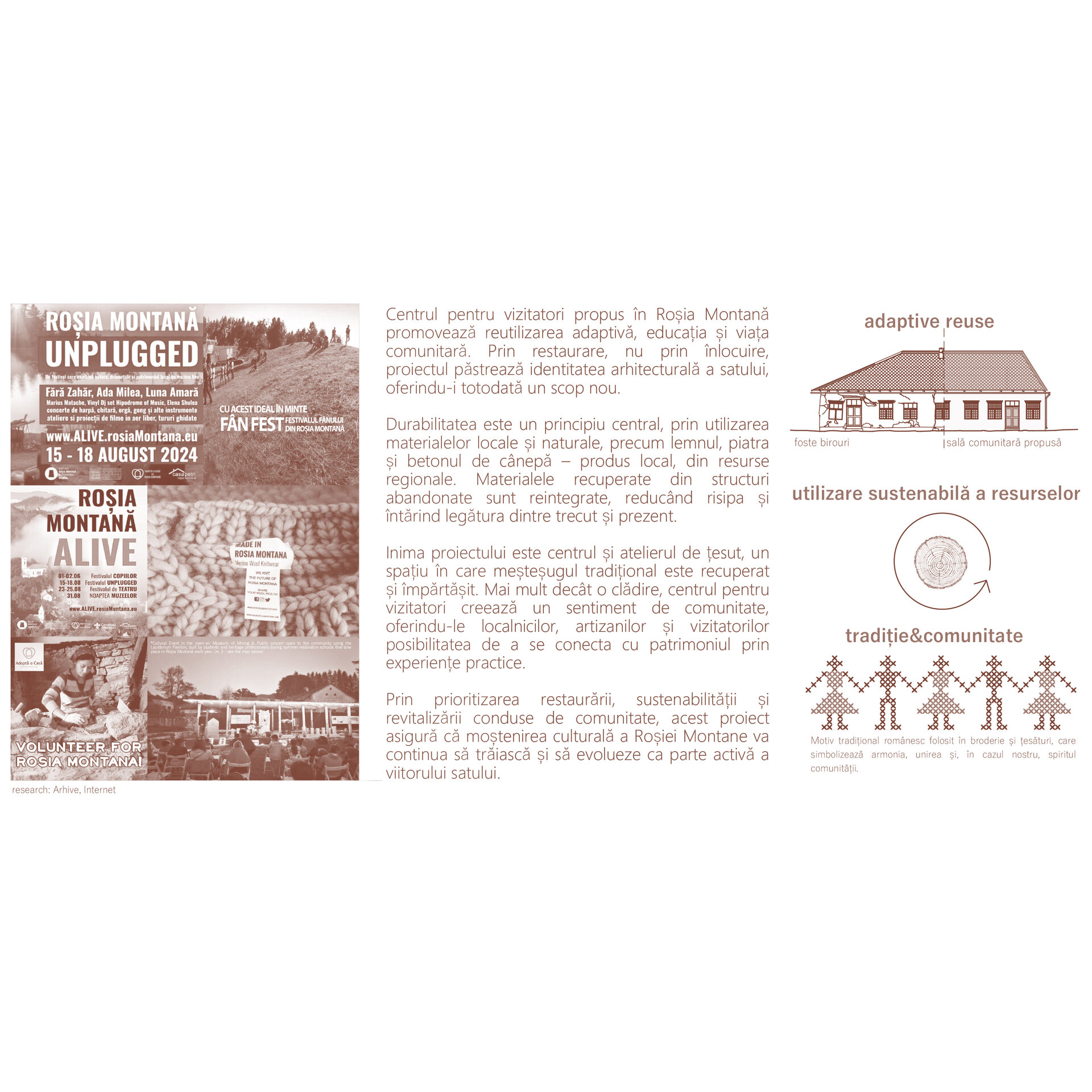Propunerea arhitecturală se concentrează pe revitalizarea țesutului ca element-cheie al micilor afaceri locale, integrând acest meșteșug tradițional în nevoile moderne ale satului. Țesutul, asemenea mineritului odinioară, este profund înrădăcinat în identitatea culturală a Roșiei Montane. Istoric, țesutul nu era doar o necesitate practică pentru familiile locale, ci și un mijloc de expresie și creativitate.
