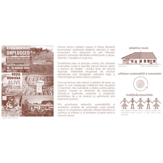 Centrul pentru vizitatori propus în Roșia Montană promovează reutilizarea adaptivă, educația și viața comunitară. Prin restaurare, nu prin înlocuire, proiectul păstrează identitatea arhitecturală a satului, oferindu-i totodată un scop nou.