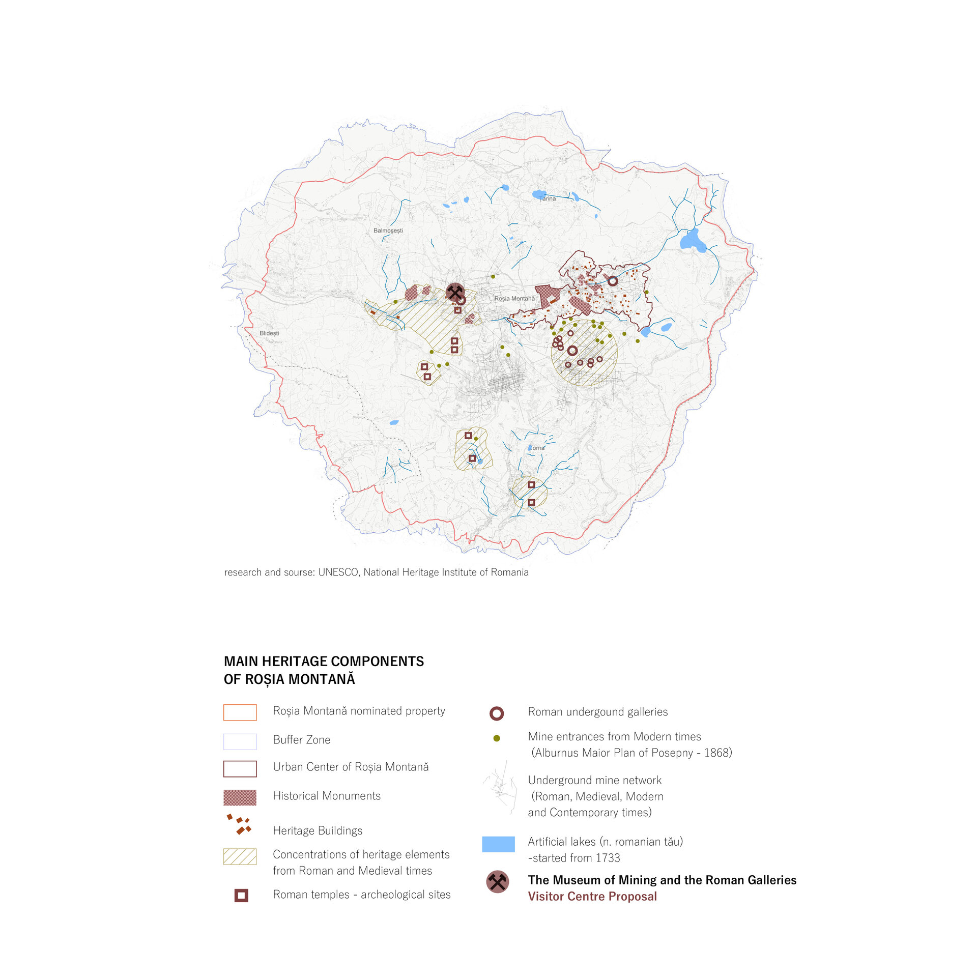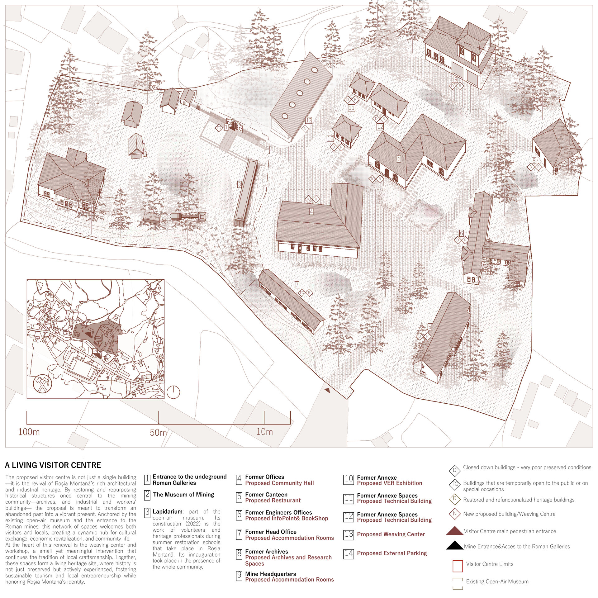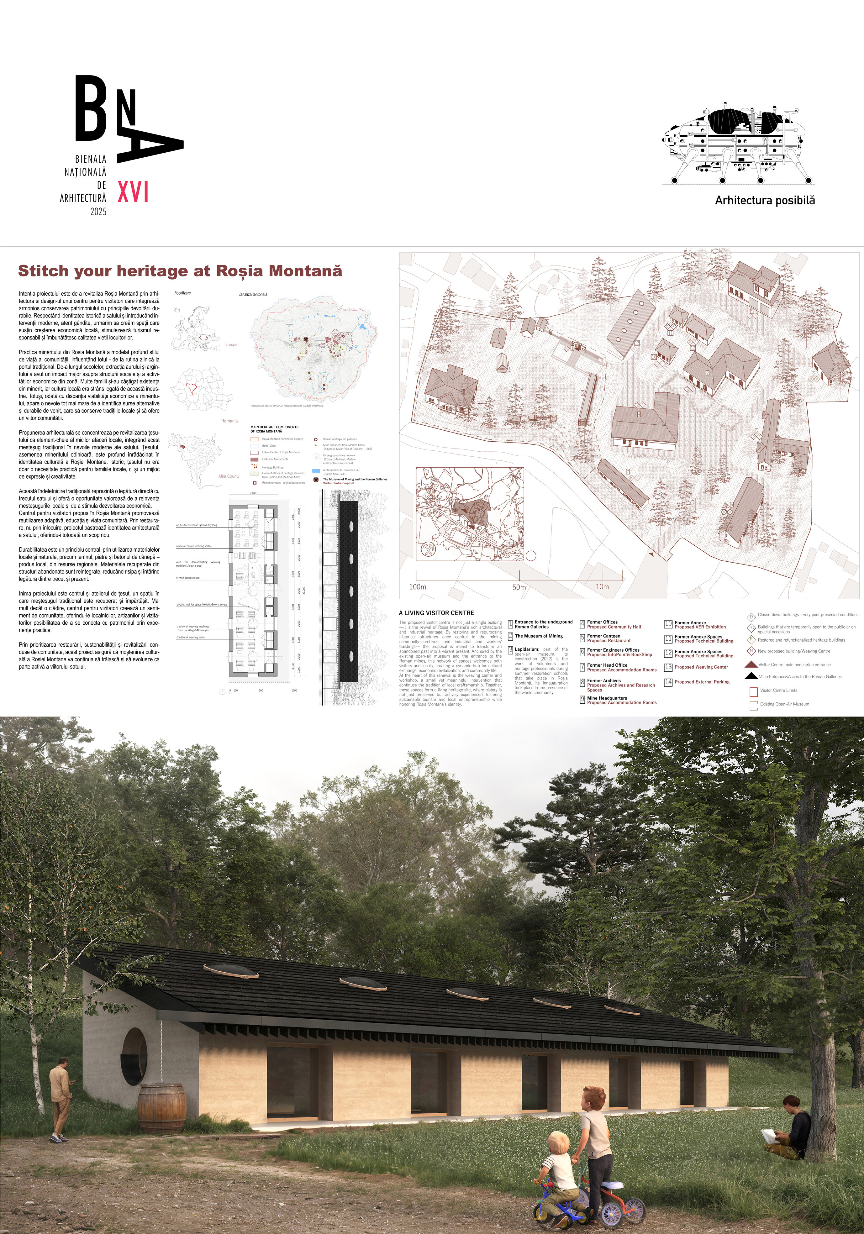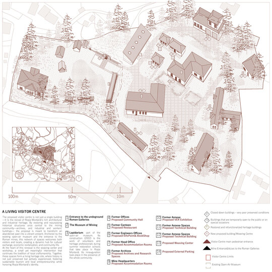 Intenția proiectului este de a revitaliza Roșia Montană prin arhitectura și design-ul unui centru pentru vizitatori care integrează armonios conservarea patrimoniului cu principiile devoltării durabile. Respectând identitatea istorică a satului și introducând intervenții moderne, atent gândite, urmărim să creăm spații care susțin creșterea economică locală, stimulezează turismul responsabil și îmbunătățesc calitatea vieții locuitorilor.