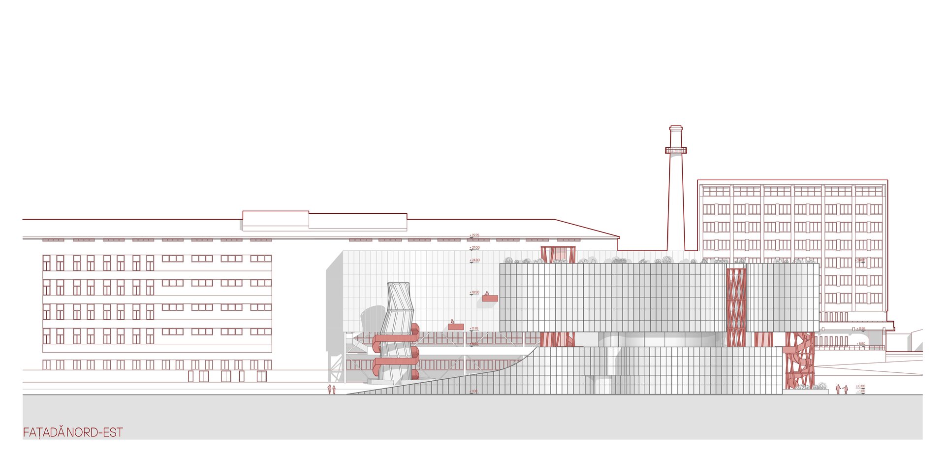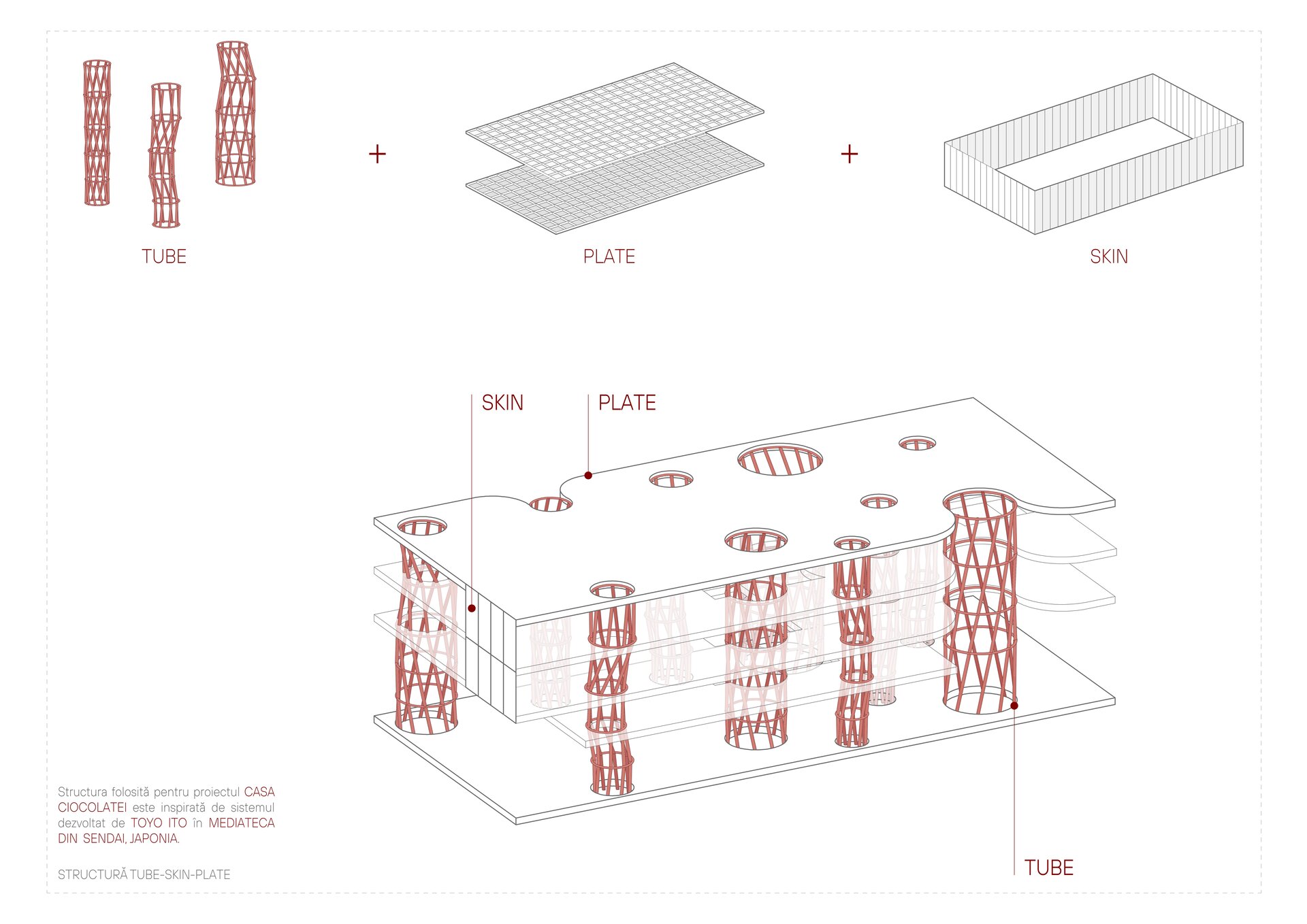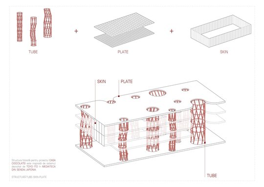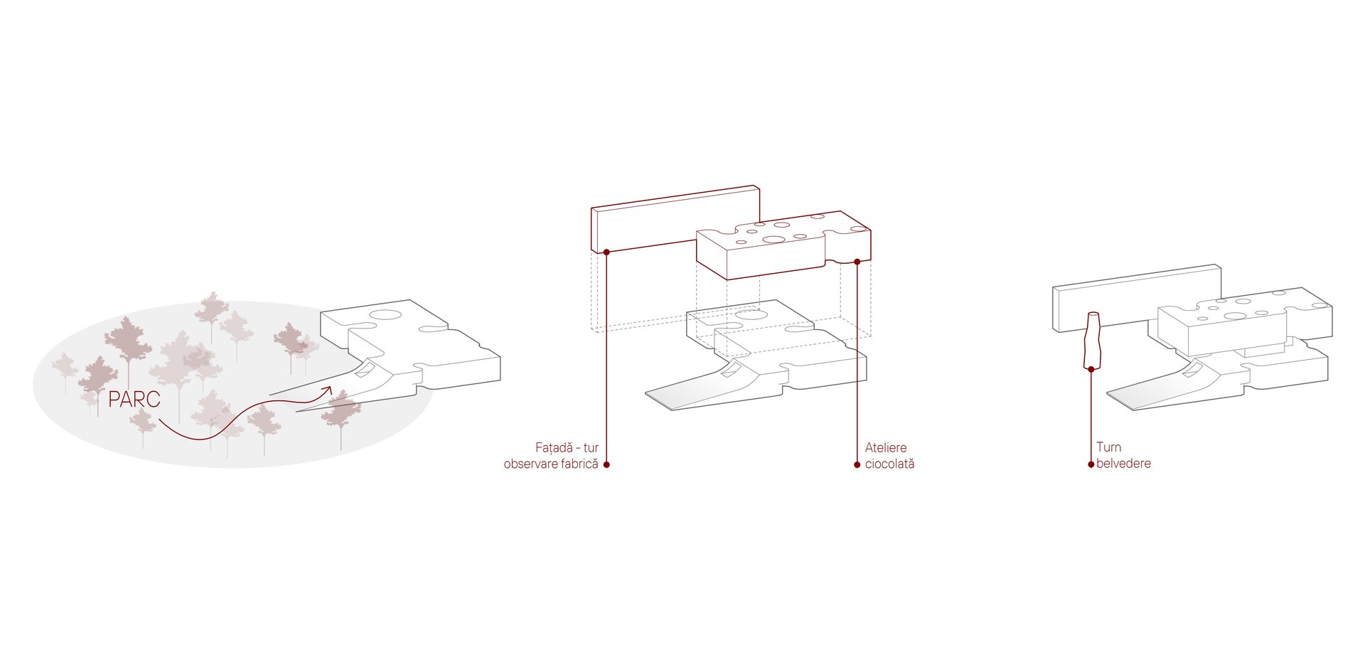 Din punct de vedere volumetric, Casa Ciocolatei este un ansamblu arhitectural deschis, integrat în contextul urban, cu acces principal de la Strada Mihai Viteazul, marcat de o bară suspendată care adăpostește atelierele de ciocolată. Volumetria clădirii este organizată în formă de „U”, deschisă spre parc, accentuată de o rampă largă care conectează spațiile interioare cu exteriorul. Un element distinctiv al proiectului este fațada dublă atașată de corpul de producție a Fabricii Bucuria, oferind posibilitatea explorării procesului de producție fie de la distanță, fie prin acces direct în fabrică. În plus, un accent vertical a fost introdus atât ca punct de acces rapid din parcarea subterană în parc, cât și ca turn de belvedere, oferind o perspectivă favorabilă spre lacul Albișoara și contribuind la compoziția arhitecturală.