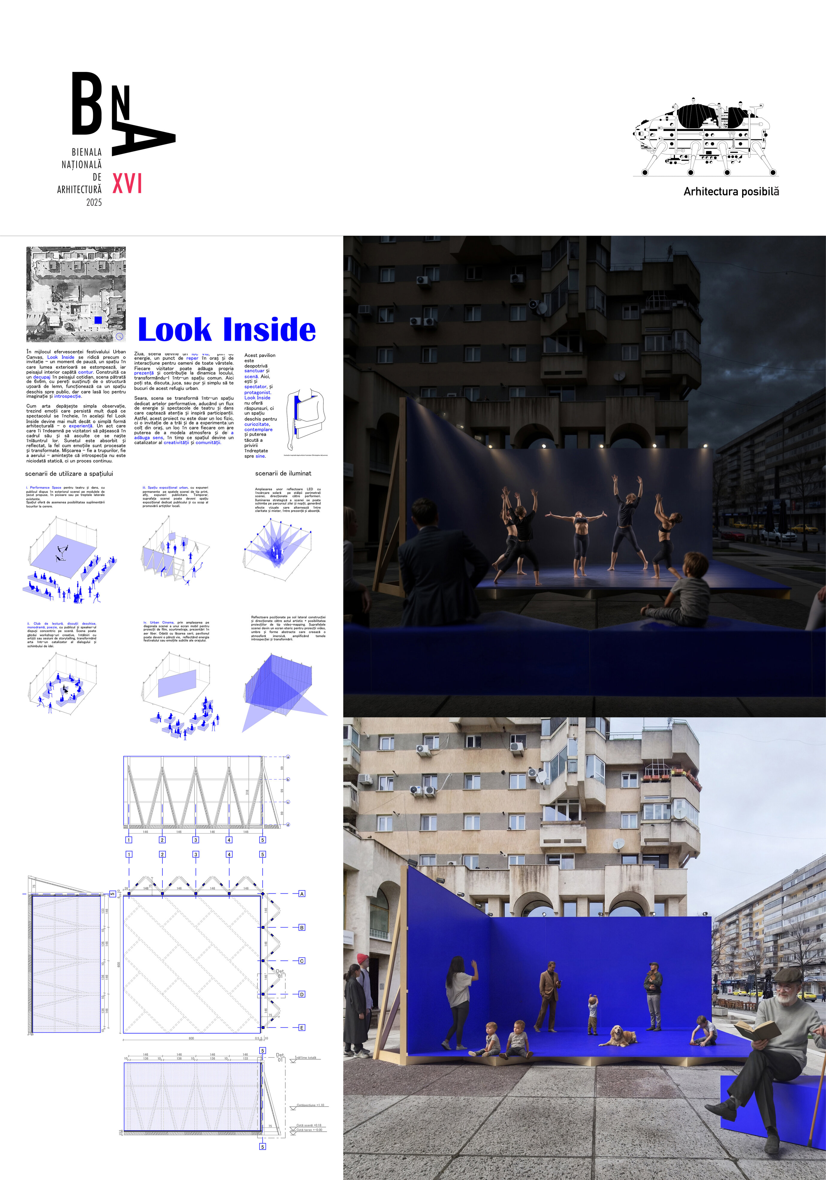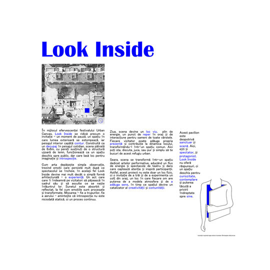 În mijlocul efervescenței orașului Iași, Look Inside se ridică precum o invitație – un moment de pauză, un spațiu în care lumea exterioară se estompează, iar peisajul interior capătă contur. Construită ca un decupaj în peisajul cotidian, scena pătrată de 6x6m, cu pereți susținuți de o structură ușoară de lemn, funcționează ca un spațiu deschis spre public, dar care lasă loc pentru imaginație și introspecție.