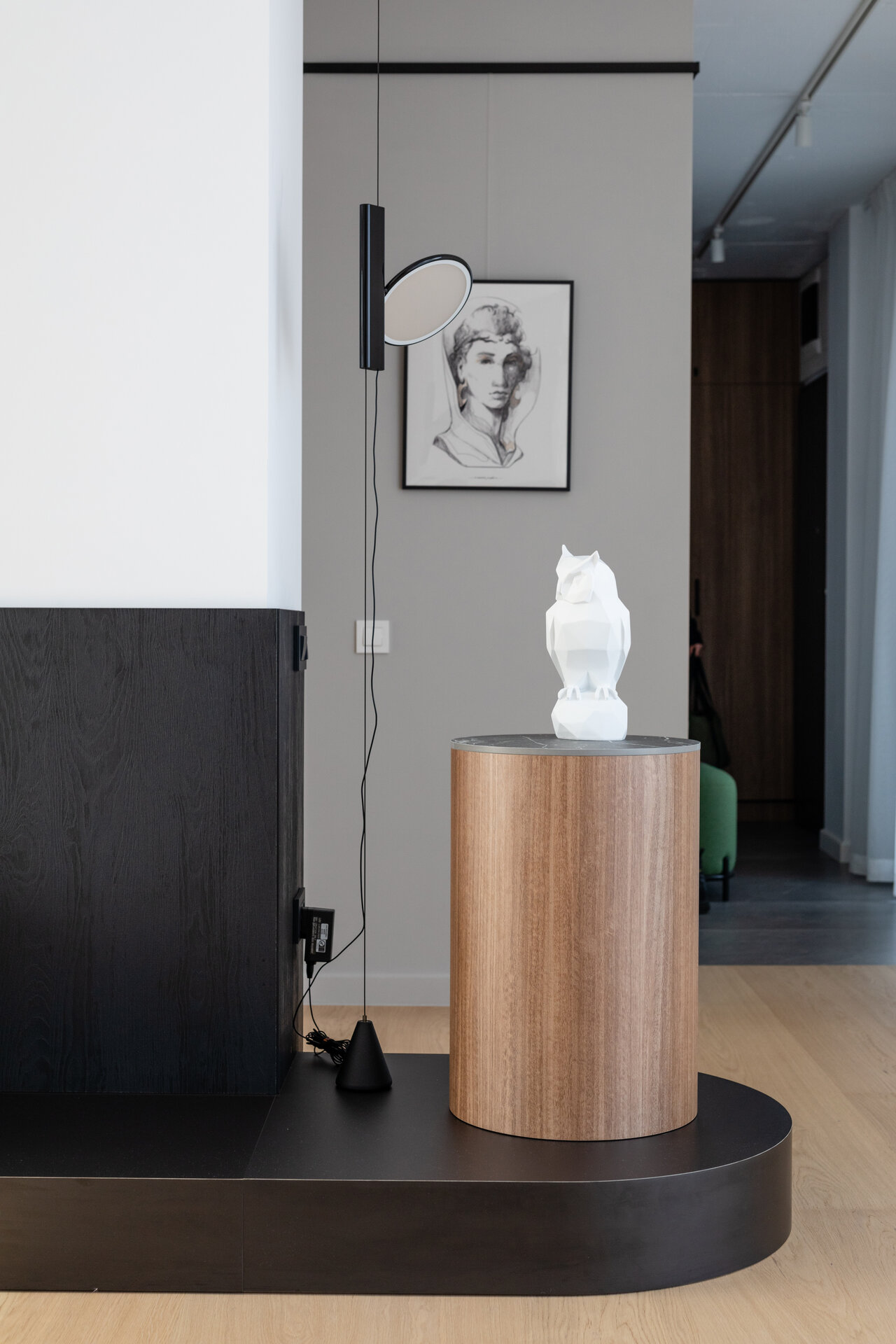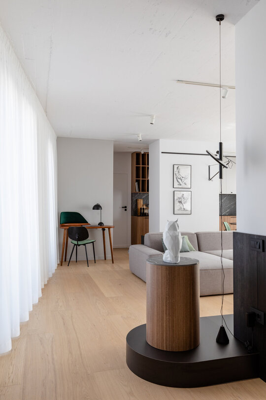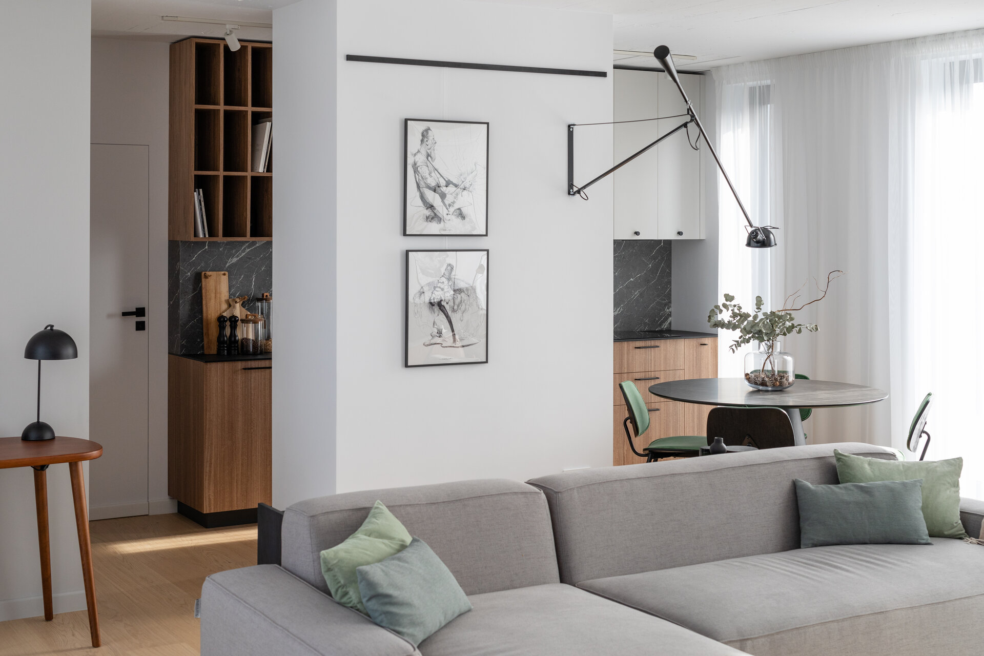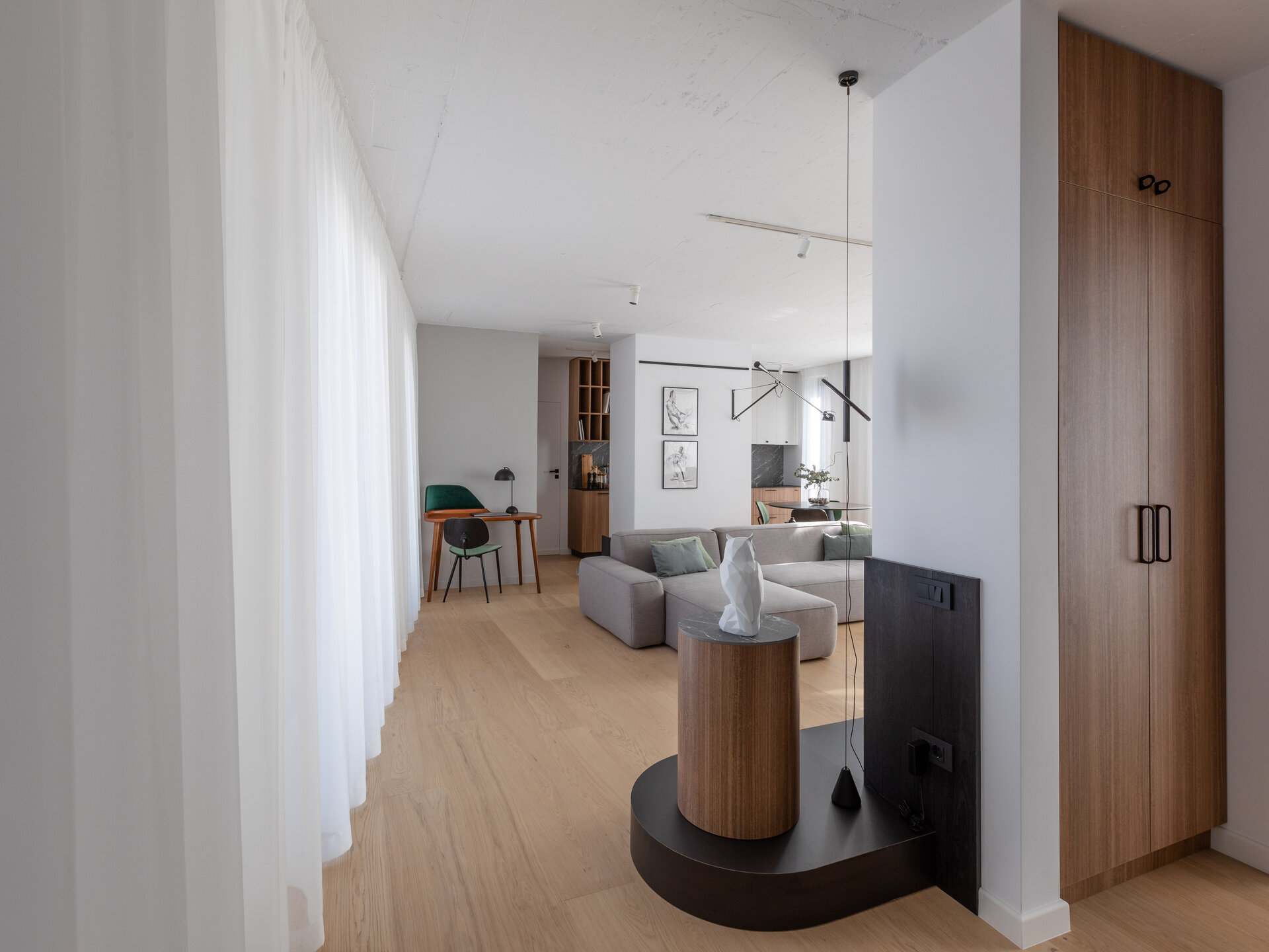 Planimetria neregulată, rezultată din retragerile impuse și adaptările structurale ale clădirii, a generat provocări funcționale, în special în zona bucătăriei și a dormitorului matrimonial. Soluția propusă a fost una integrată și atent calibrată: o nișă în zona de zi adăpostește discret corpurile înalte ale bucătăriei, în timp ce oferă un fundal generos pentru lucrările de artă ale beneficiarului. Dormitorul a fost extins subtil în zona băii pentru a permite integrarea unui dressing, cu ajutorul unei compartimentări din sticlă fumurie, care menține o atmosferă aerisită și luminoasă.