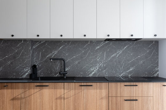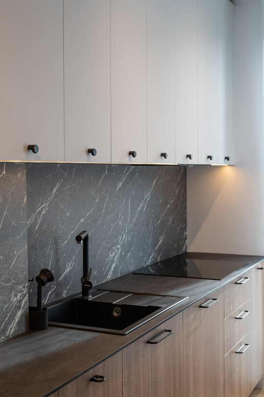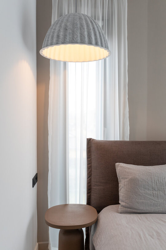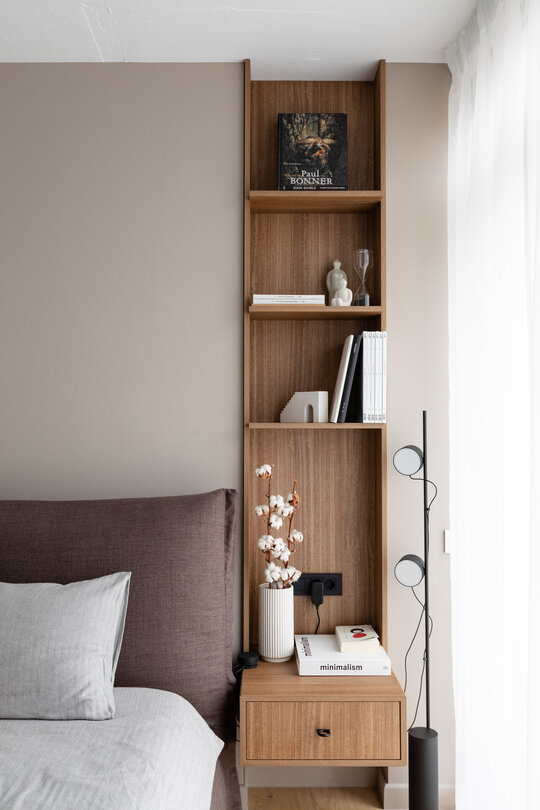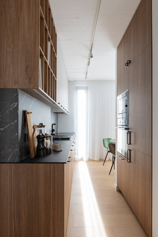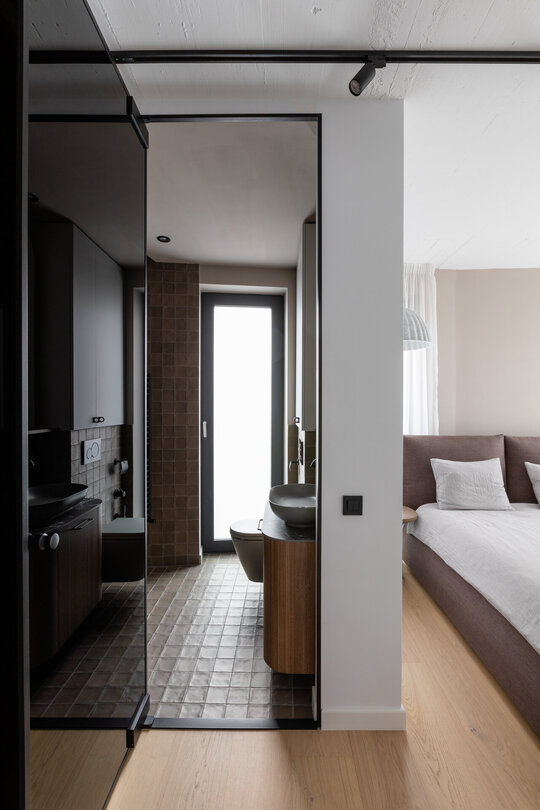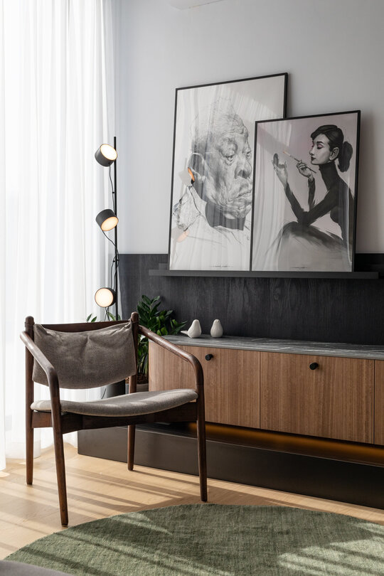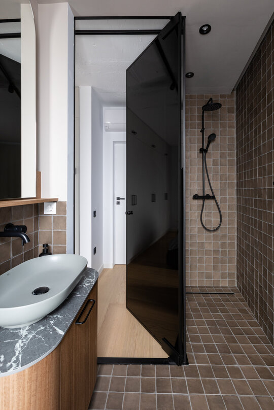 Planimetria neregulată, rezultată din retragerile impuse și adaptările structurale ale clădirii, a generat provocări funcționale, în special în zona bucătăriei și a dormitorului matrimonial. Soluția propusă a fost una integrată și atent calibrată: o nișă în zona de zi adăpostește discret corpurile înalte ale bucătăriei, în timp ce oferă un fundal generos pentru lucrările de artă ale beneficiarului. Dormitorul a fost extins subtil în zona băii pentru a permite integrarea unui dressing, cu ajutorul unei compartimentări din sticlă fumurie, care menține o atmosferă aerisită și luminoasă.