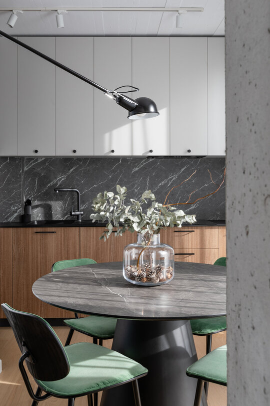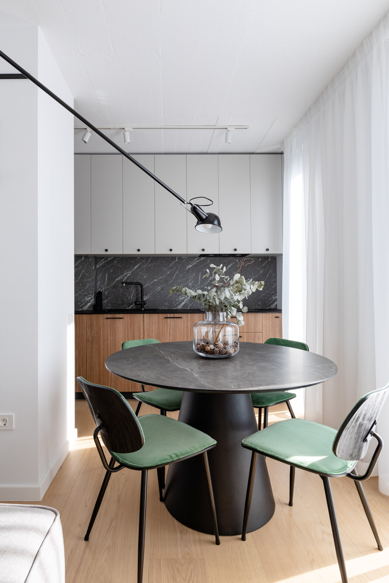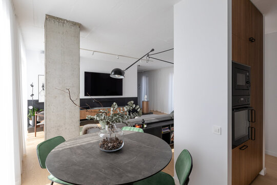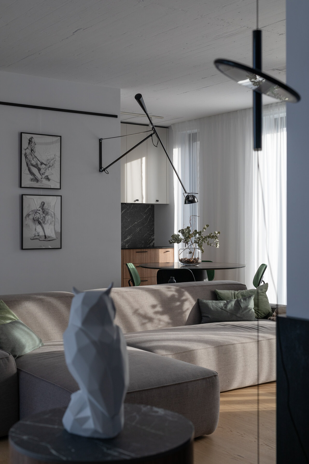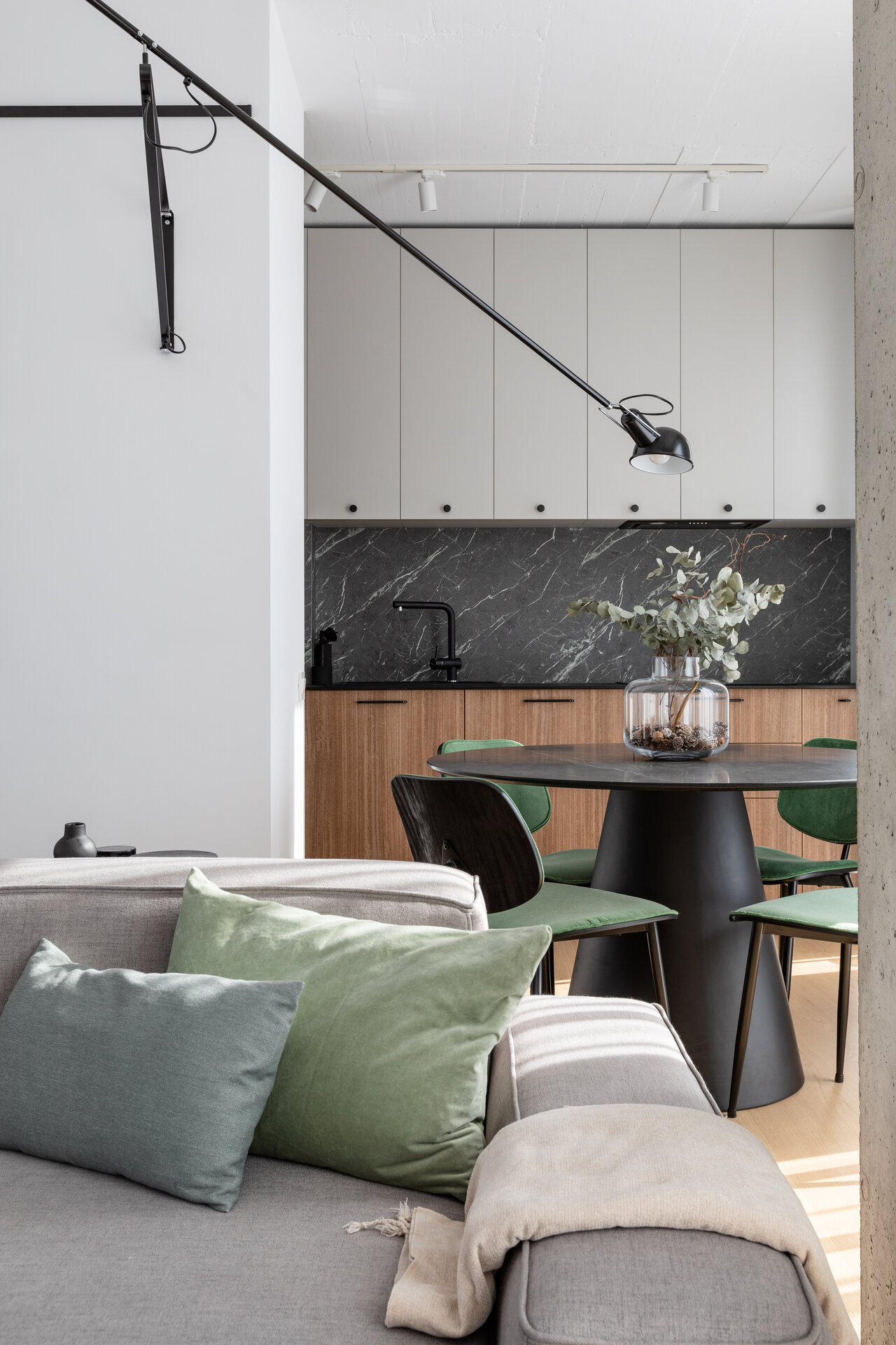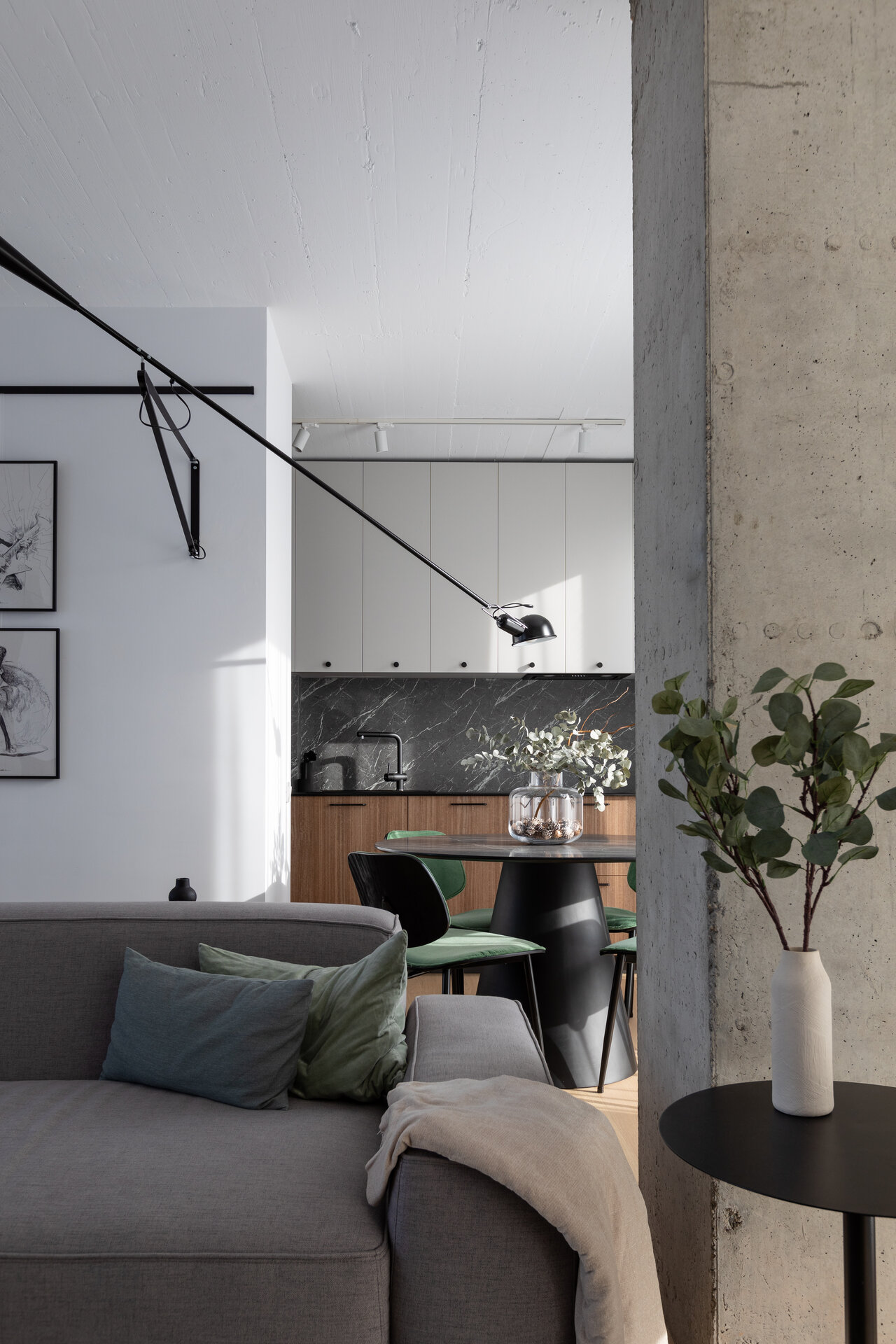 Cromatica este neutră, accentuată de nuanțe de verde și de textura betonului păstrat la vedere pe tavan și pe stâlpul structural din living – elemente definitorii care conferă spațiului autenticitate și caracter.
