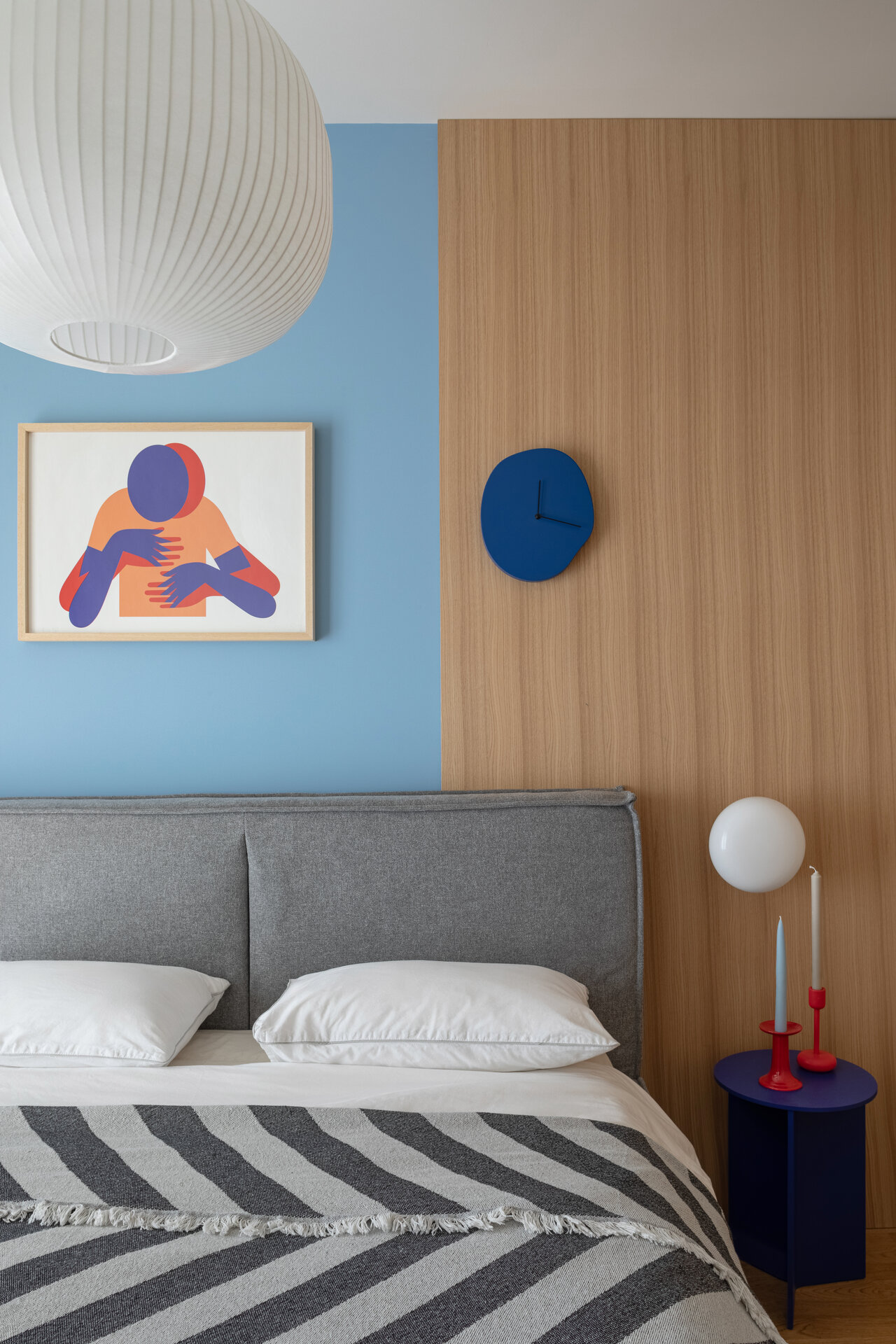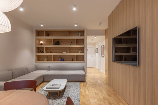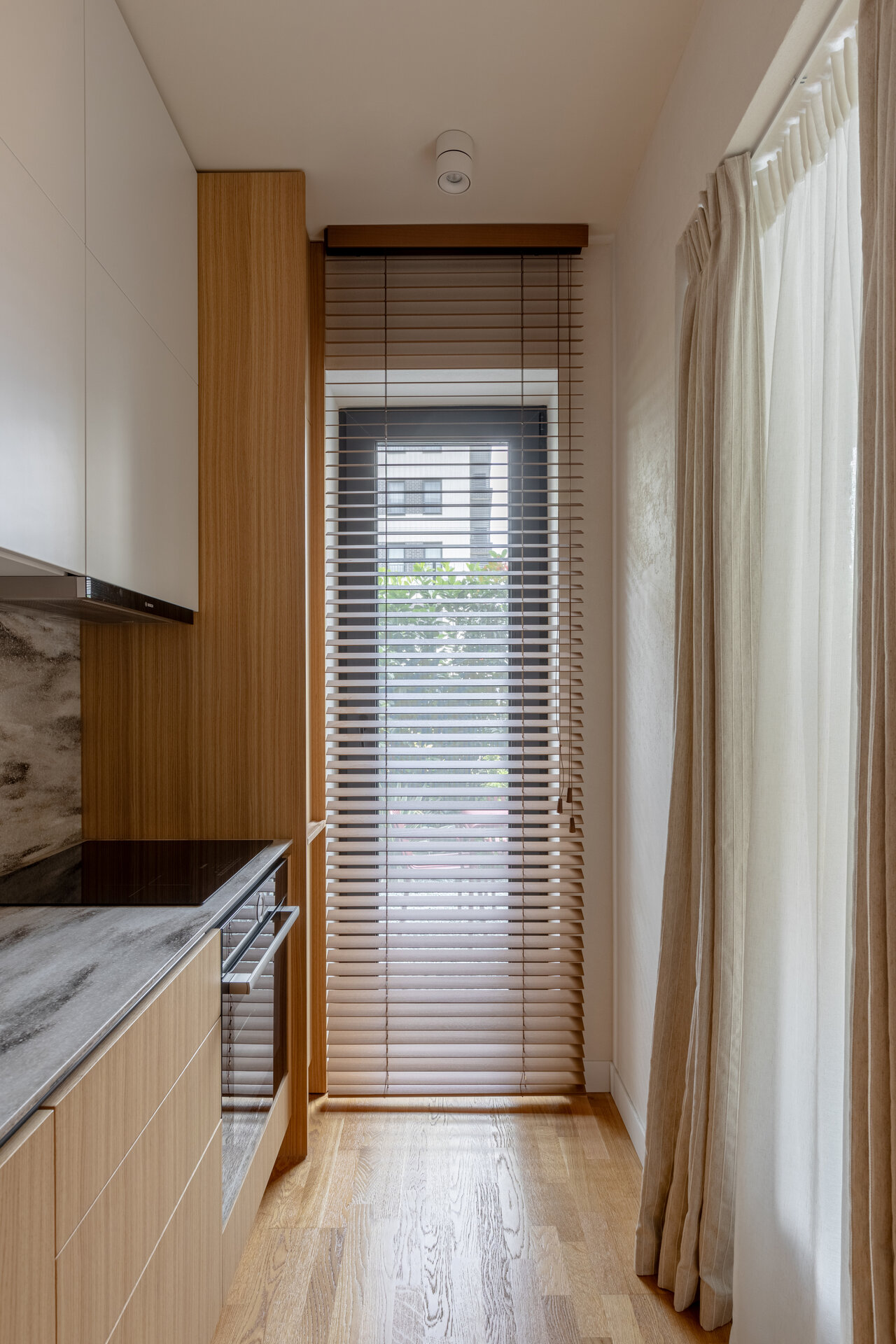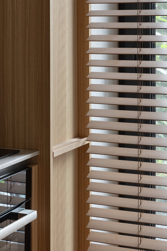 Pereții placați cu MDF furniruit integrează discret soluții de depozitare, iar paleta de texturi atent selectate adaugă dinamism și individualitate. Accentele de culoare – burgundy, albastru și maro – creează contraste subtile, care pun în valoare liniile simple ale amenajării.