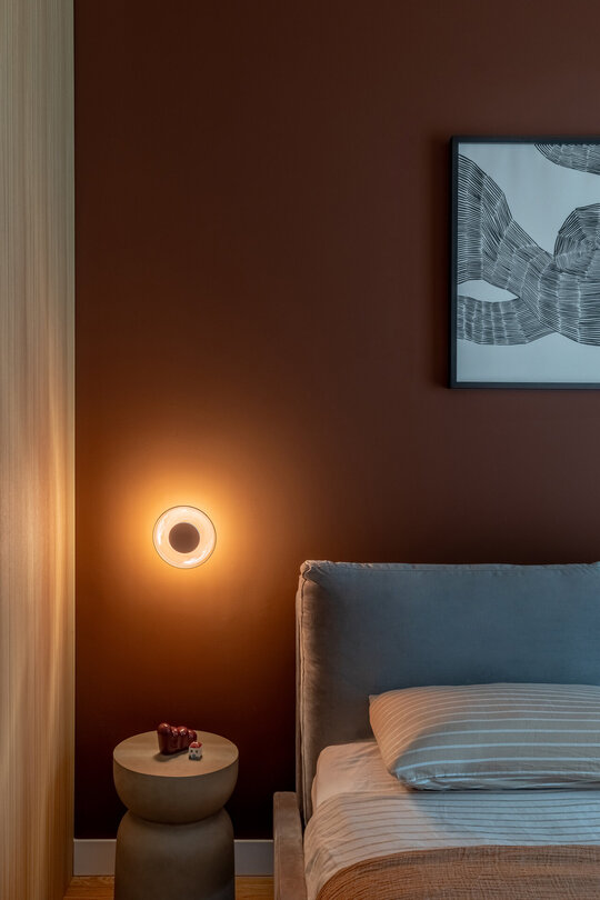 Dormitorul matrimonial conferă profunzime și caracter spațiului, cu un perete accent pământiu. Finisajele din furnir de stejar respectă unitatea compoziției, iar corpul suspendat cu design sculptural devine punctul focal al camerei, completând estetica subtilă.
