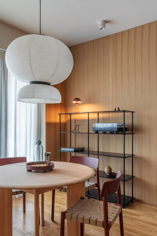 Zona de dining, poziționată în legătură directă cu livingul și bucătăria, devine centrul de gravitație al locuinței: un spațiu fluid, deschis și convivial. Biblioteca încastrată din living este evidențiată printr-un scenariu de iluminat atent studiat: spoturi orientabile și lumini ambientale care conferă apartamentului o atmosferă caldă și rafinată .