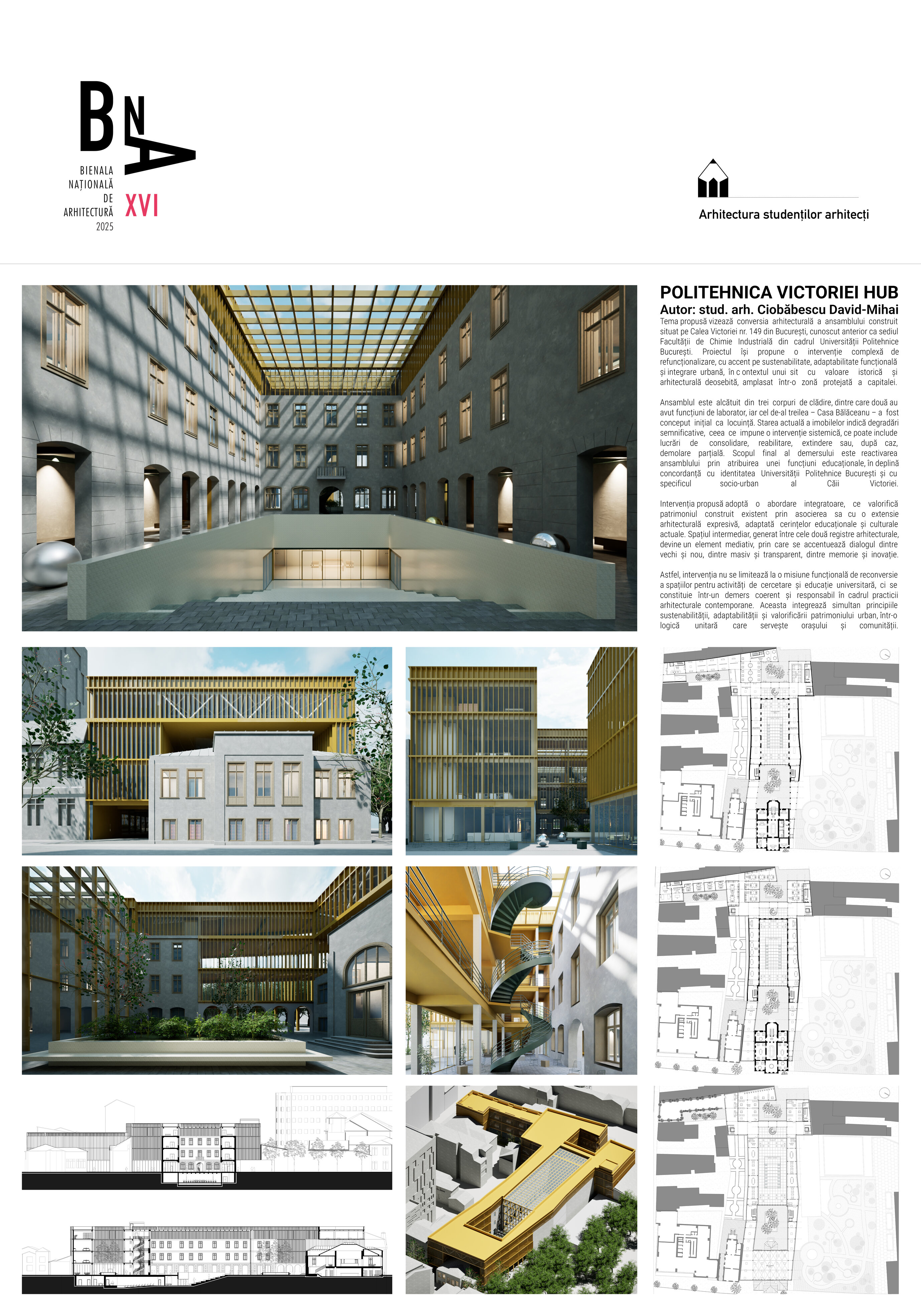 Tema propusă vizează conversia arhitecturală a ansamblului situat pe Calea Victoriei nr. 149 din București, cunoscut anterior ca sediul Facultății de Chimie Industrială din cadrul Universității Politehnice București. Proiectul își propune o intervenție complexă de reabilitare, cu accent pe sustenabilitate, adaptabilitate funcțională și integrare urbană, în contextul unui sit cu valoare istorică și arhitecturală deosebită, amplasat într-o zonă protejată a capitalei.