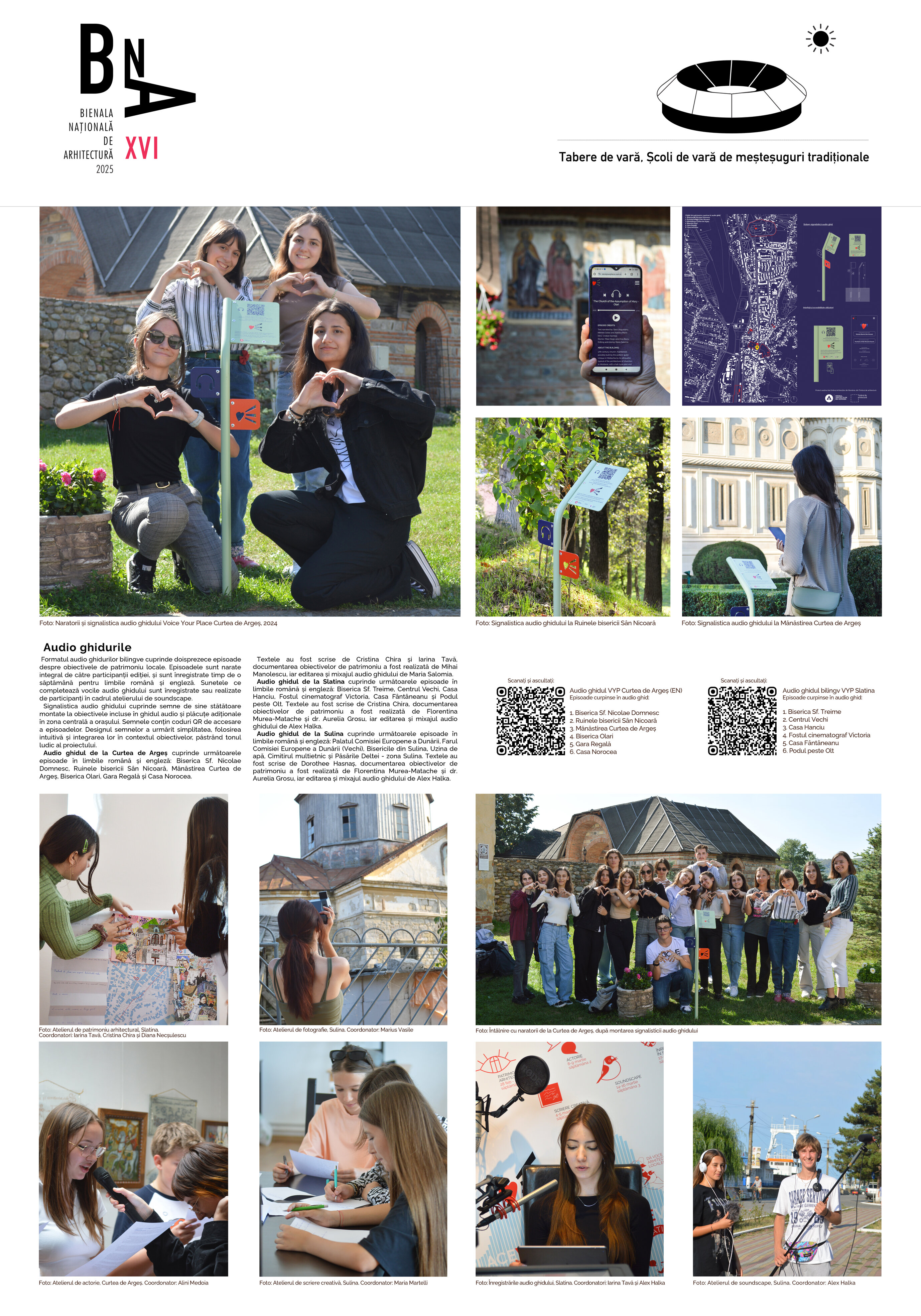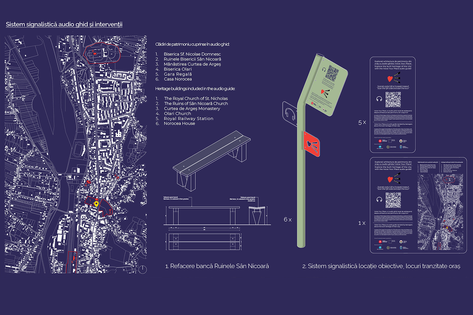 Voice Your Place a pornit în anul 2023 cu prima ediție de la Curtea de Argeș, realizată împreună cu Filiala teritorială Argeș a Ordinului Arhitecților din România. În cadrul primei ediții a fost lansat audio ghidul în limba română. Am continuat și finalizat proiectul de la Curtea de Argeș anul următor cu ediția a II-a prezentată aici, când pe lângă ateliere, a fost realizat audio ghidul în limba engleză, dar și signalistica sa prin care poveștile orașului au primit un loc concret în spațiul public. Signalistica audio ghidului cuprinde semne de sine stătătoare montate în zona obiectivelor, care conțin coduri QR pentru accesarea episoadelor. Designul semnelor a urmărit simplitatea, folosirea intuitivă și integrarea lor în contextul obiectivelor, păstrând tonul ludic al proiectului. Audio ghidul de la Curtea de Argeș cuprinde următoarele episoade în limbile română și engleză: Biserica Sf. Nicolae Domnesc, Ruinele bisericii Sân Nicoară, Mănăstirea Curtea de Argeș, Biserica Olari, Gara Regală și Casa Norocea.